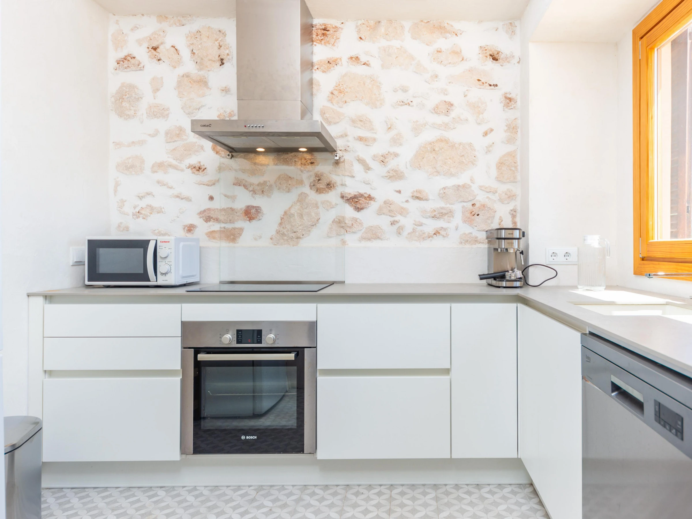 Dieses küche, ist ausgestattet in kühlschrank, mikrowelle, backofen, gefrierschrank, spülmaschine, kaffeemaschine und toaster.