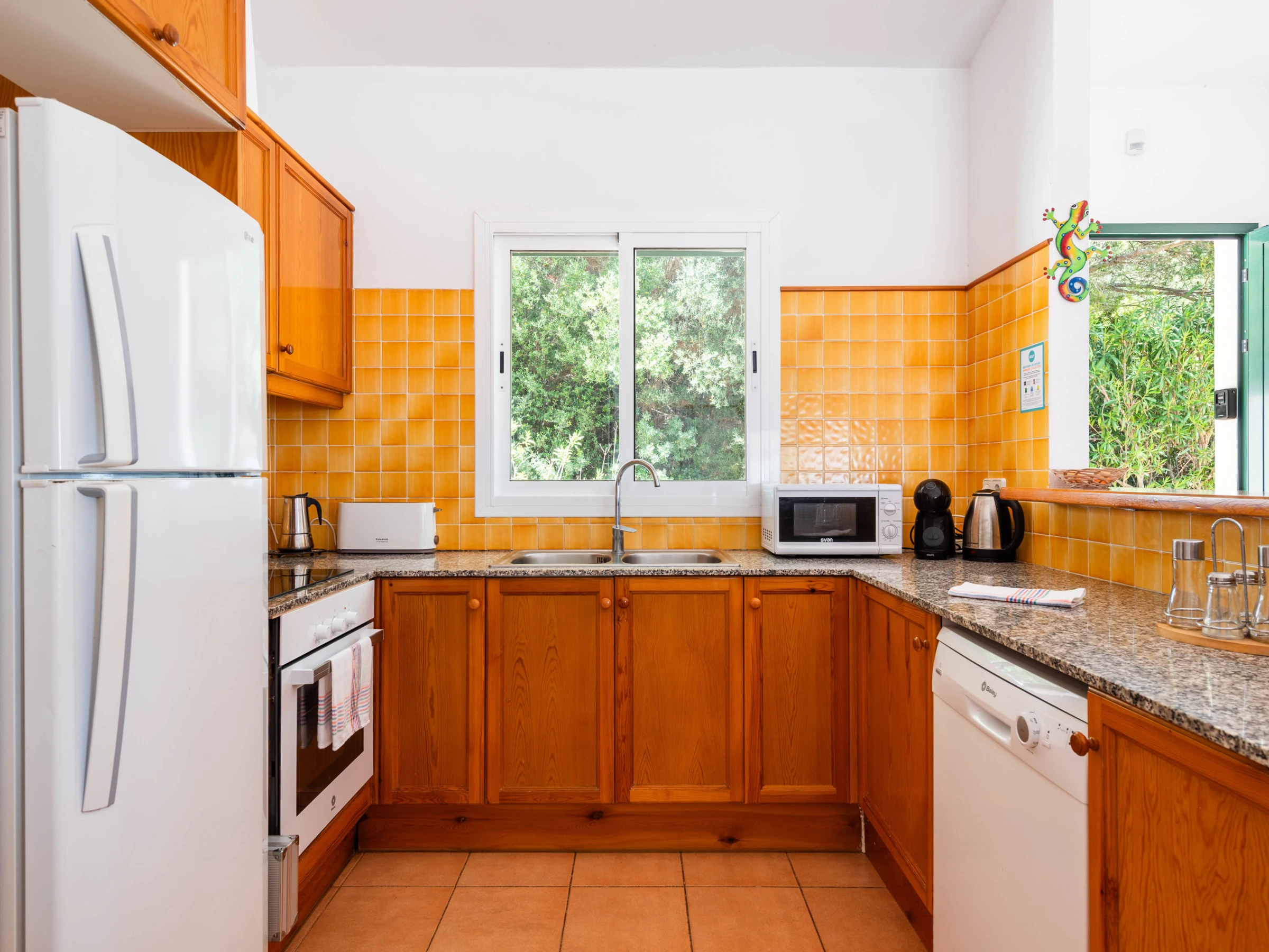 Die offene Küche ist komplett ausgestattet mit Geräten wie Kühlschrank, Gefrierschrank, Waschmaschine, Geschirrspüler, Ofen, Mikrowelle und Kaffeemaschine, um Ihre Mahlzeiten zuzubereiten.