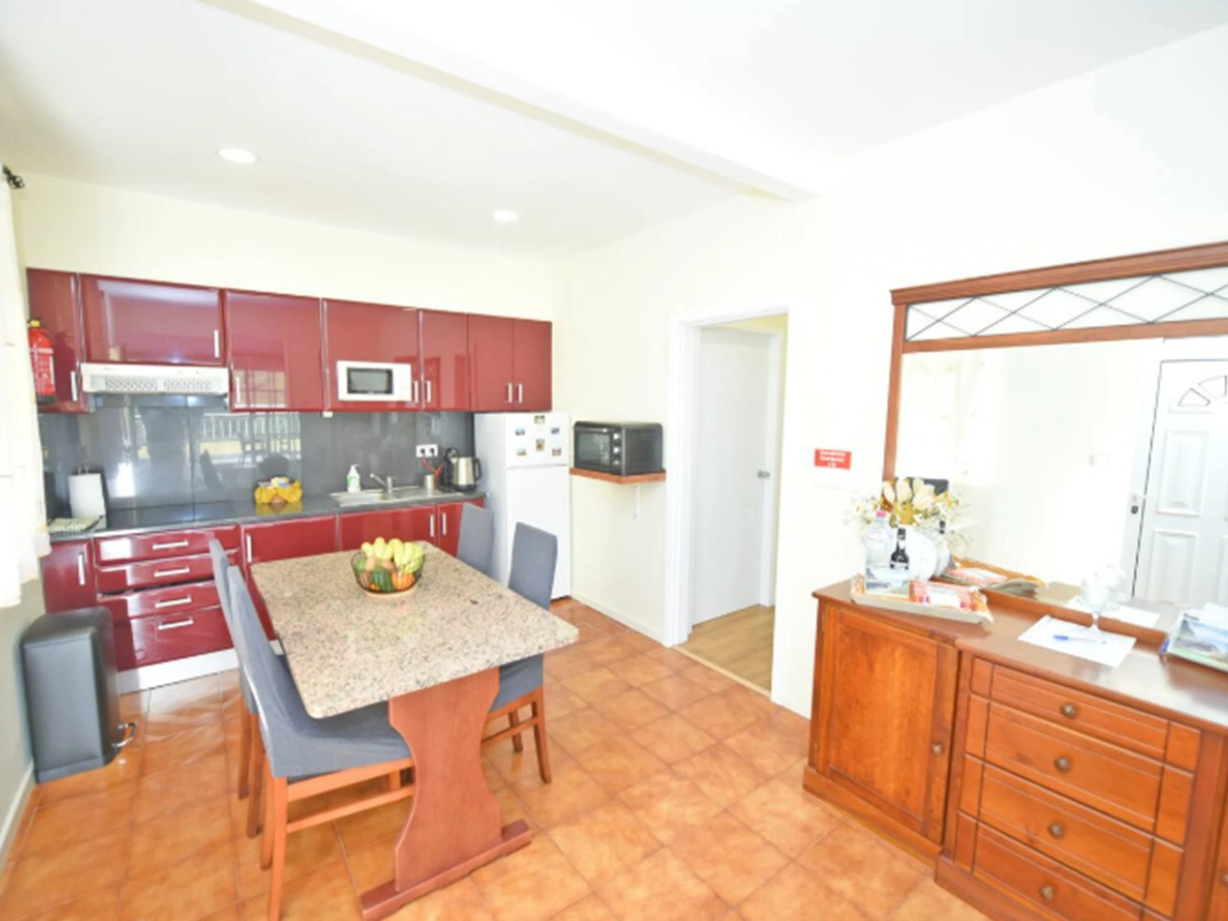 Die Gemeinschaftsbereiche sind geräumig und einladend, mit einem lichtdurchfluteten Wohnzimmer, in dem man sich leicht wie zu Hause fühlen kann. Die voll ausgestattete Küche bietet alles, was man benötigt, um jede Mahlzeit zuzubereiten, von ruhigen Frühstücken bis hin zu gemeinsamen Abendessen nach einem Tag voller Abenteuer auf der Insel.
