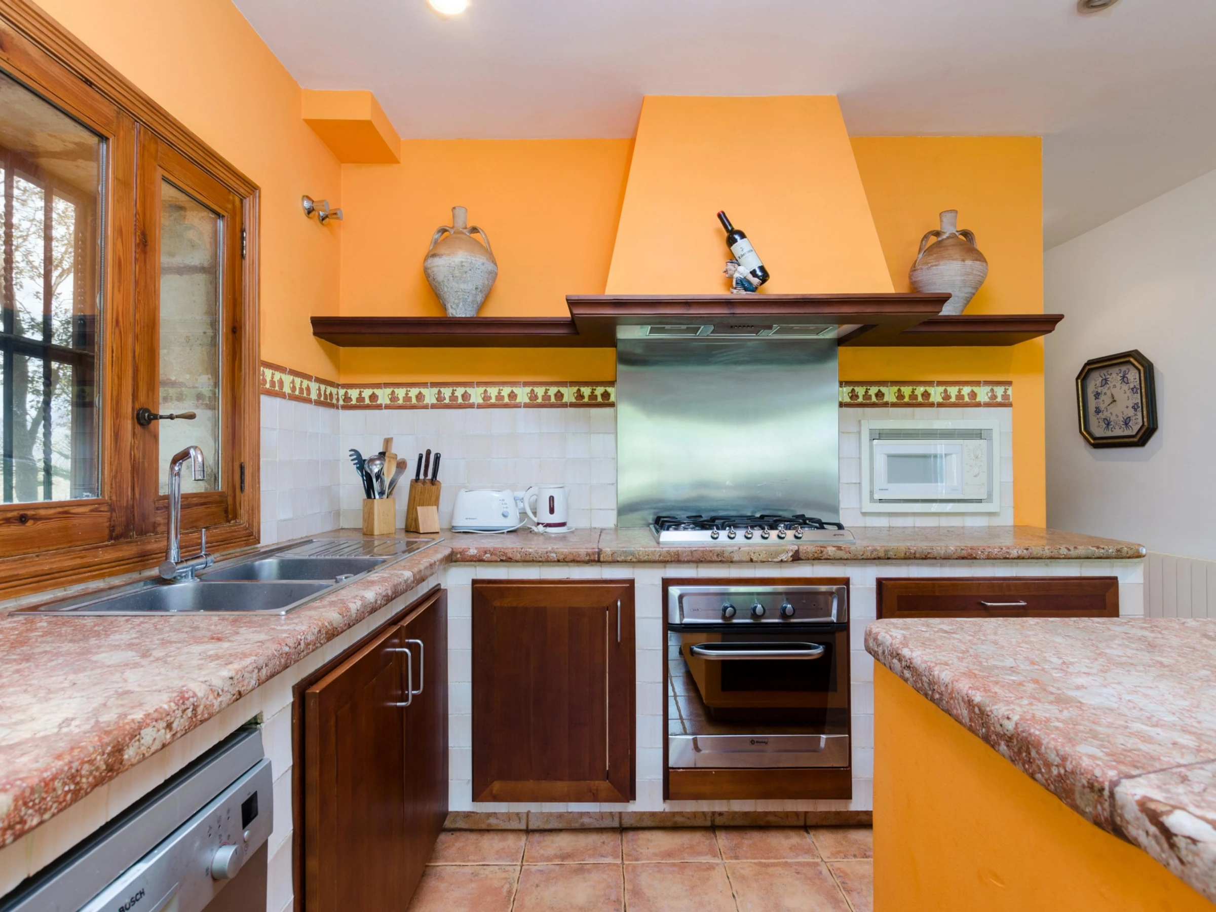 Die Küche ist mit Kühlschrank, Mikrowelle, Backofen, Gefrierschrank, Geschirrspüler, Kaffeemaschine und Toaster ausgestattet.