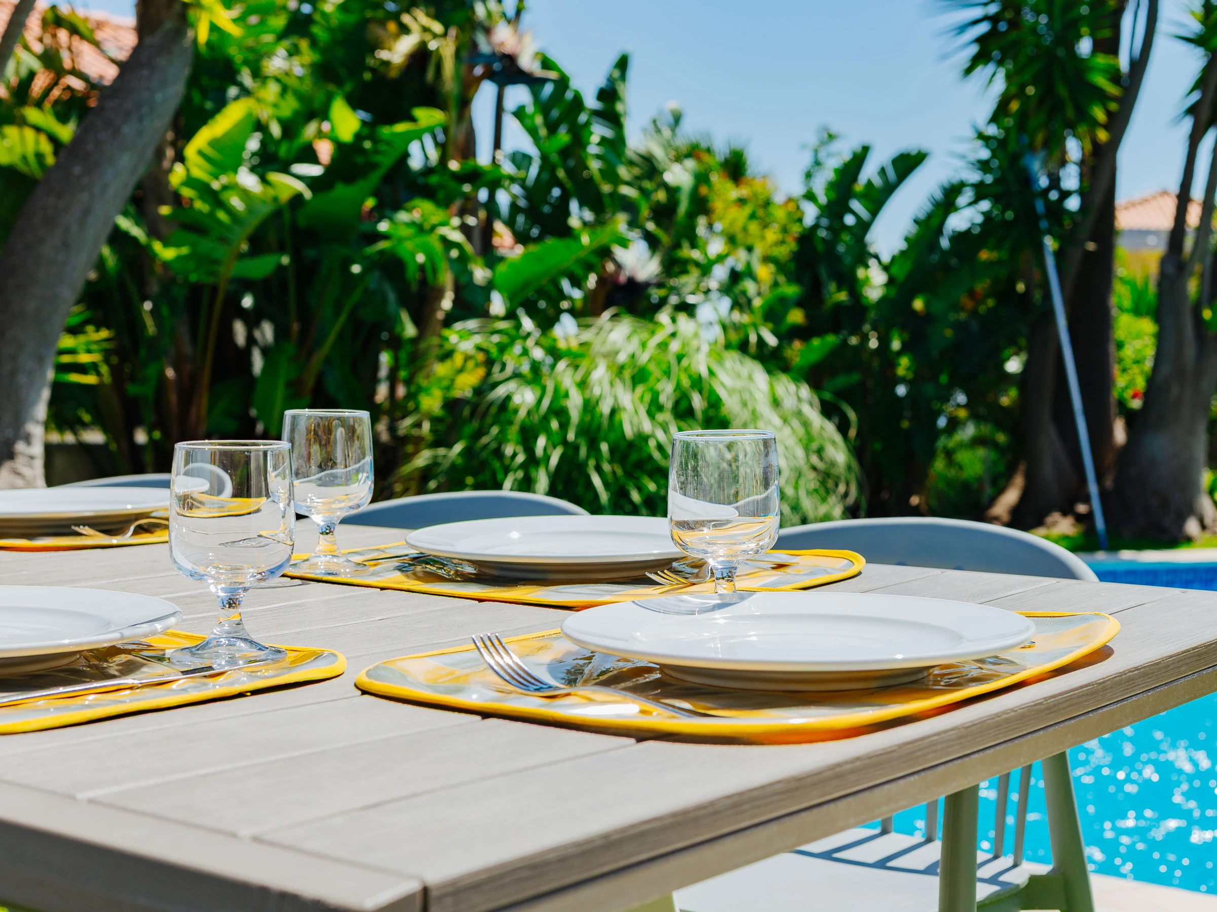 Die Unterkunft verfügt über garten, gartenmöbel, umzäuntes grundstück, 20 m² terrasse, waschmaschine, trockner, grill, kamin, bügeleisen/-brett, internet (WLAN), haartrockner, balkon, kinderbereich, elektroheizung, klimaanlage im wohnzimmer und einigen schlafzimmern, swimming-pool privater pool, 4 ventilatoren, 1 Fernseher, sat-tv (Sprachen: Spanisch, Englisch).