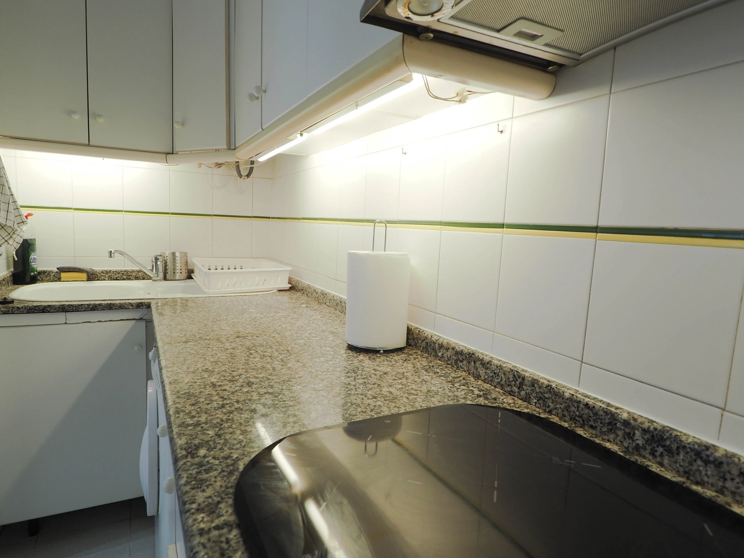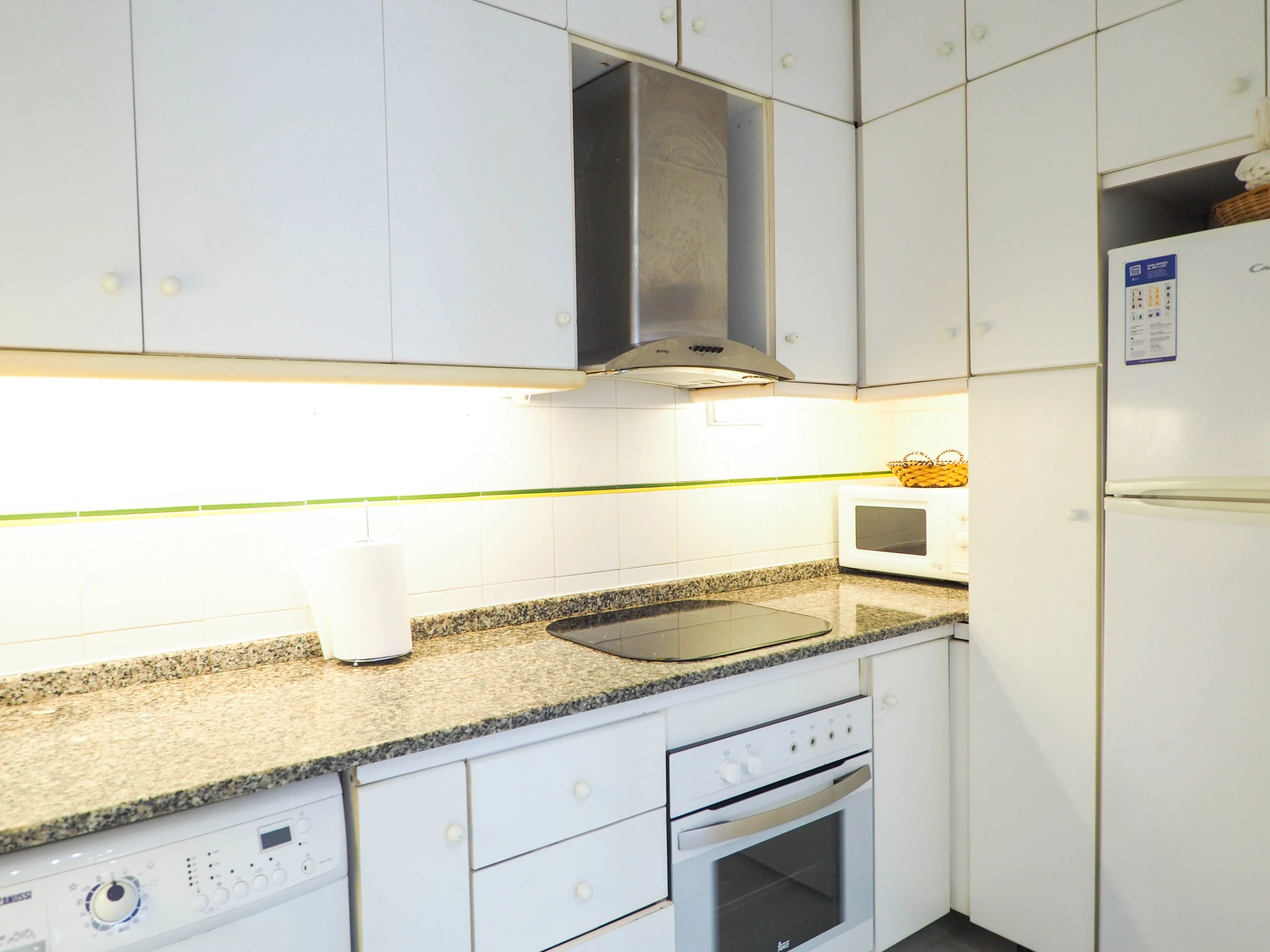 Dieses küche, ist ausgestattet in kühlschrank, mikrowelle, backofen, gefrierschrank, geschirr/besteck, kaffeemaschine, toaster und wasserkocher.