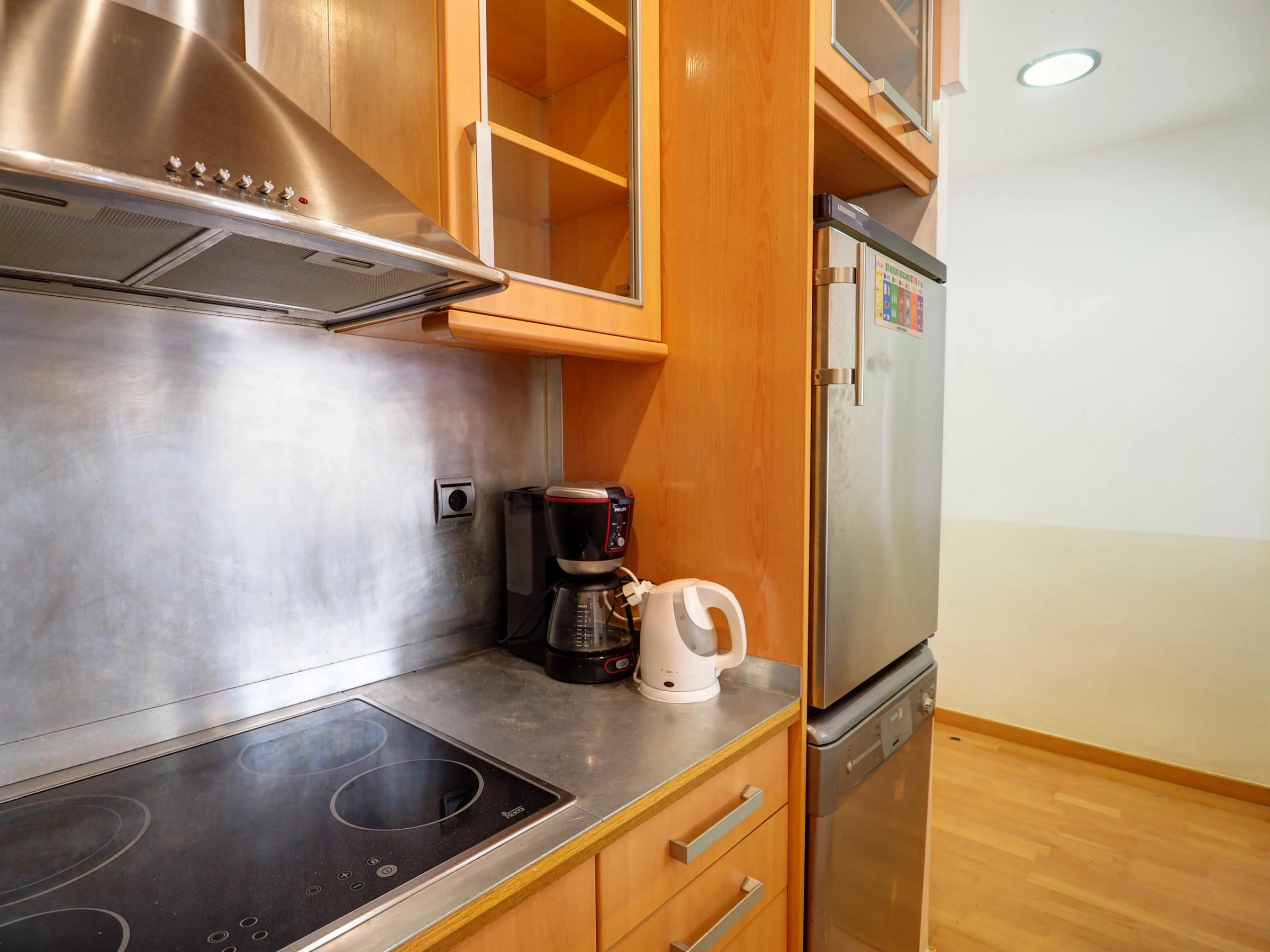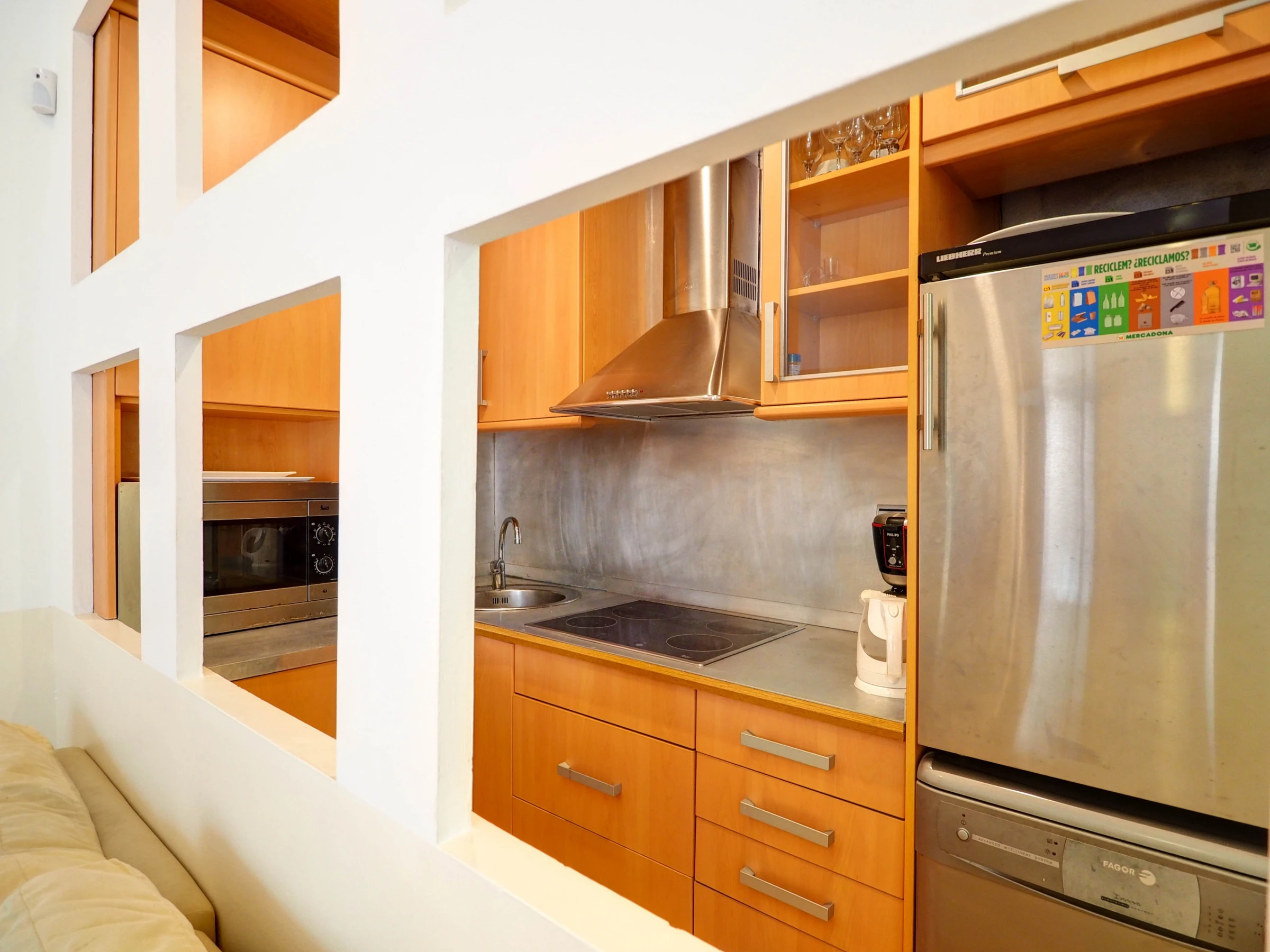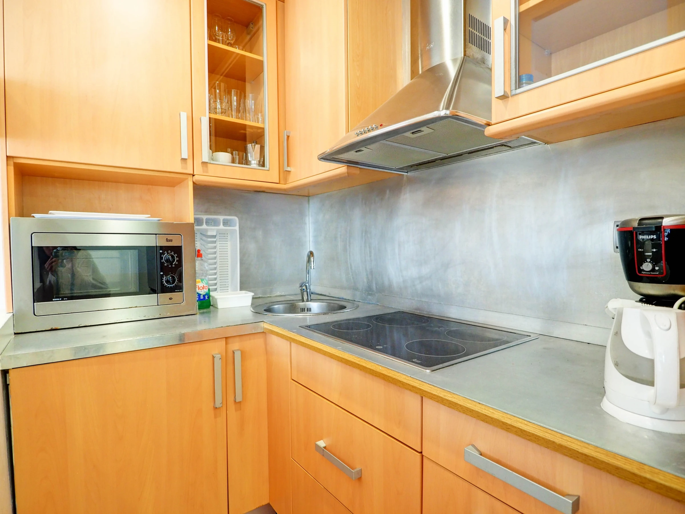 Dieses küche, ist ausgestattet in kühlschrank, mikrowelle, gefrierschrank, geschirr/besteck, kochutensilien, kaffeemaschine, toaster und wasserkocher.