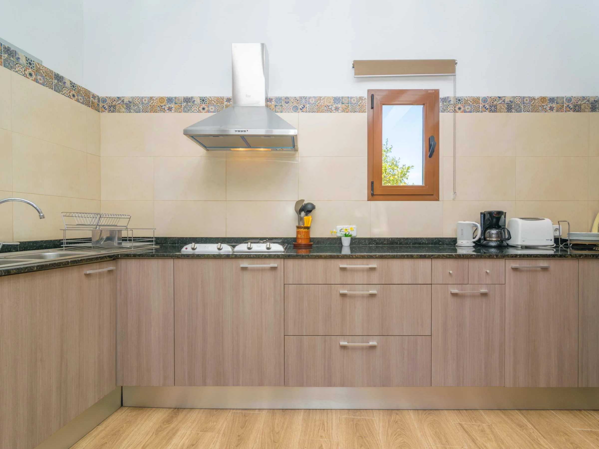 Dieses küche, ist ausgestattet in kühlschrank, mikrowelle, backofen, gefrierschrank, spülmaschine, kaffeemaschine und toaster.