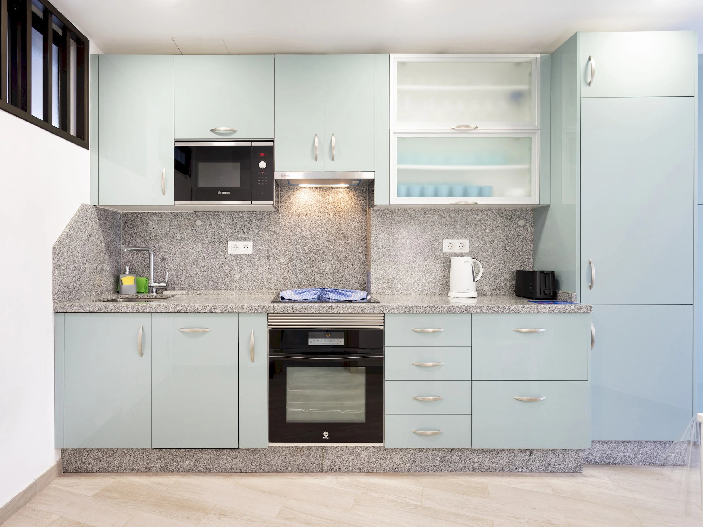 Dieses küche, ist ausgestattet in mikrowelle, backofen, spülmaschine, kochutensilien und kaffeemaschine.
