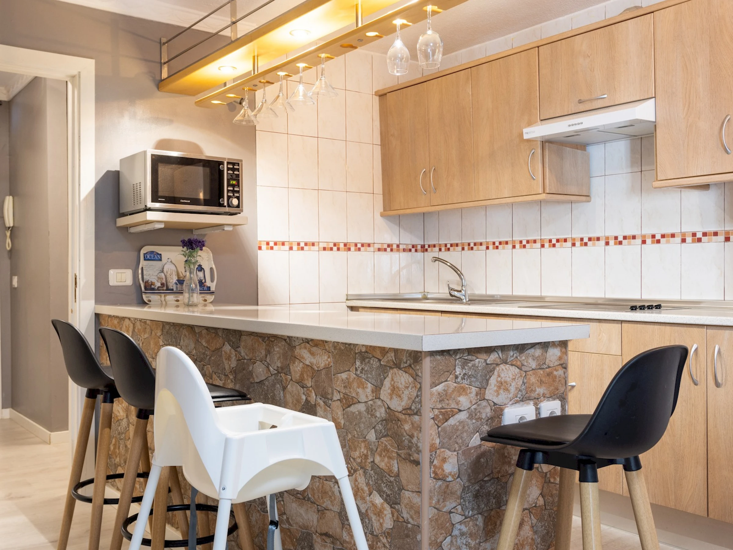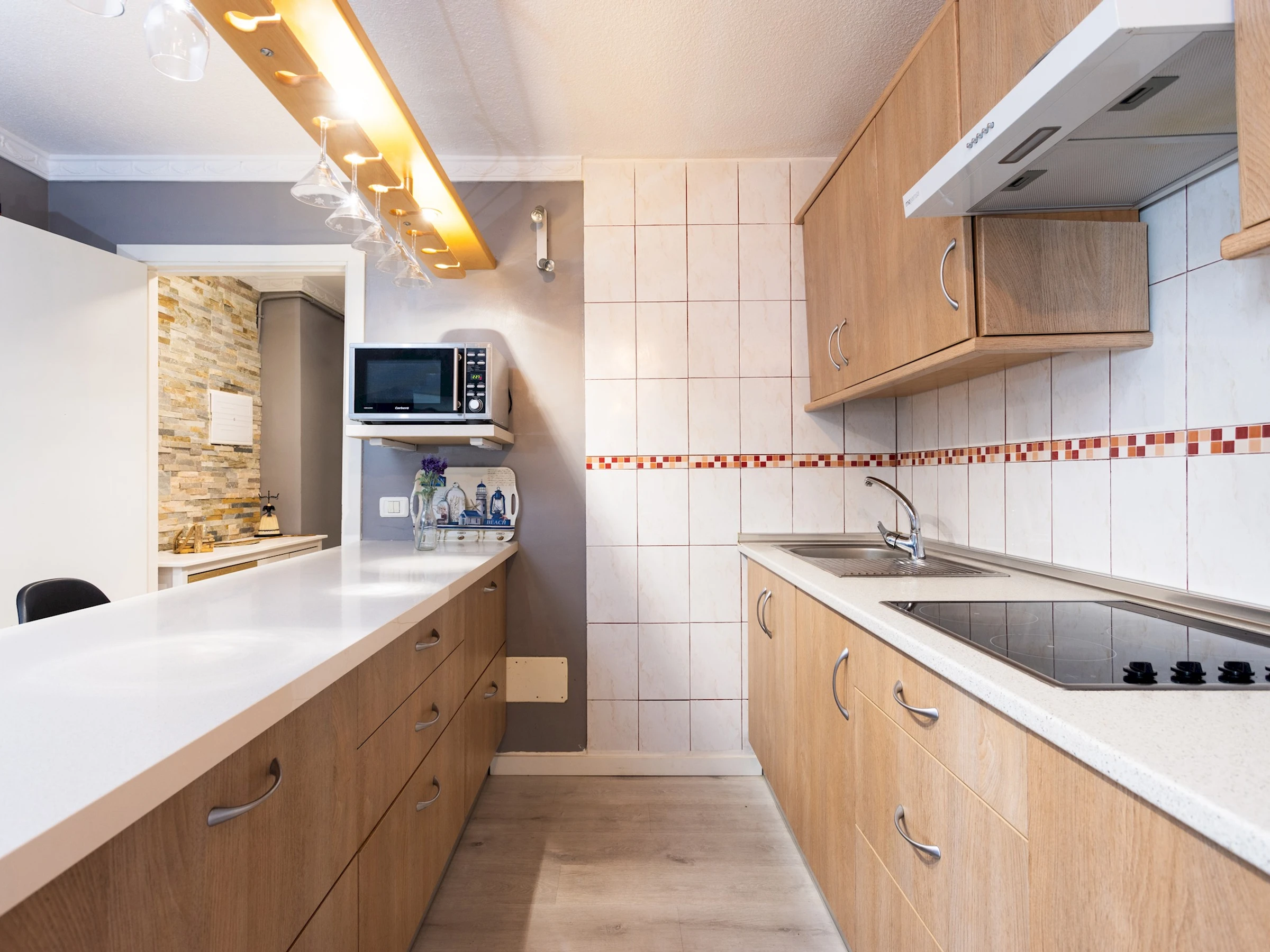 Dieses küche, ist ausgestattet in mikrowelle, kochutensilien, kaffeemaschine und toaster.