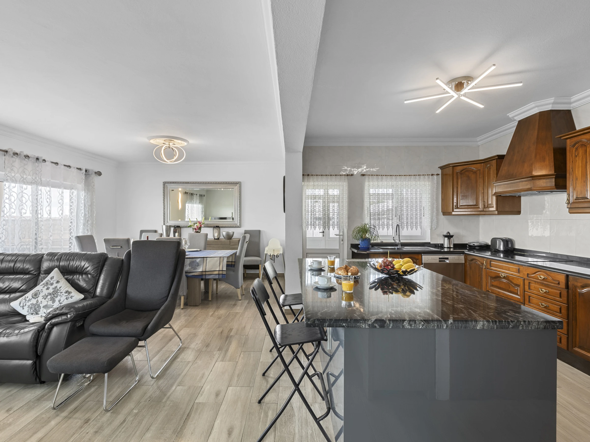 Dieses offene küche, mit ceranfeld, ist ausgestattet in kühlschrank, mikrowelle, backofen, gefrierschrank, spülmaschine, geschirr/besteck, kochutensilien, friteuse, wasserkocher und saftpresse.