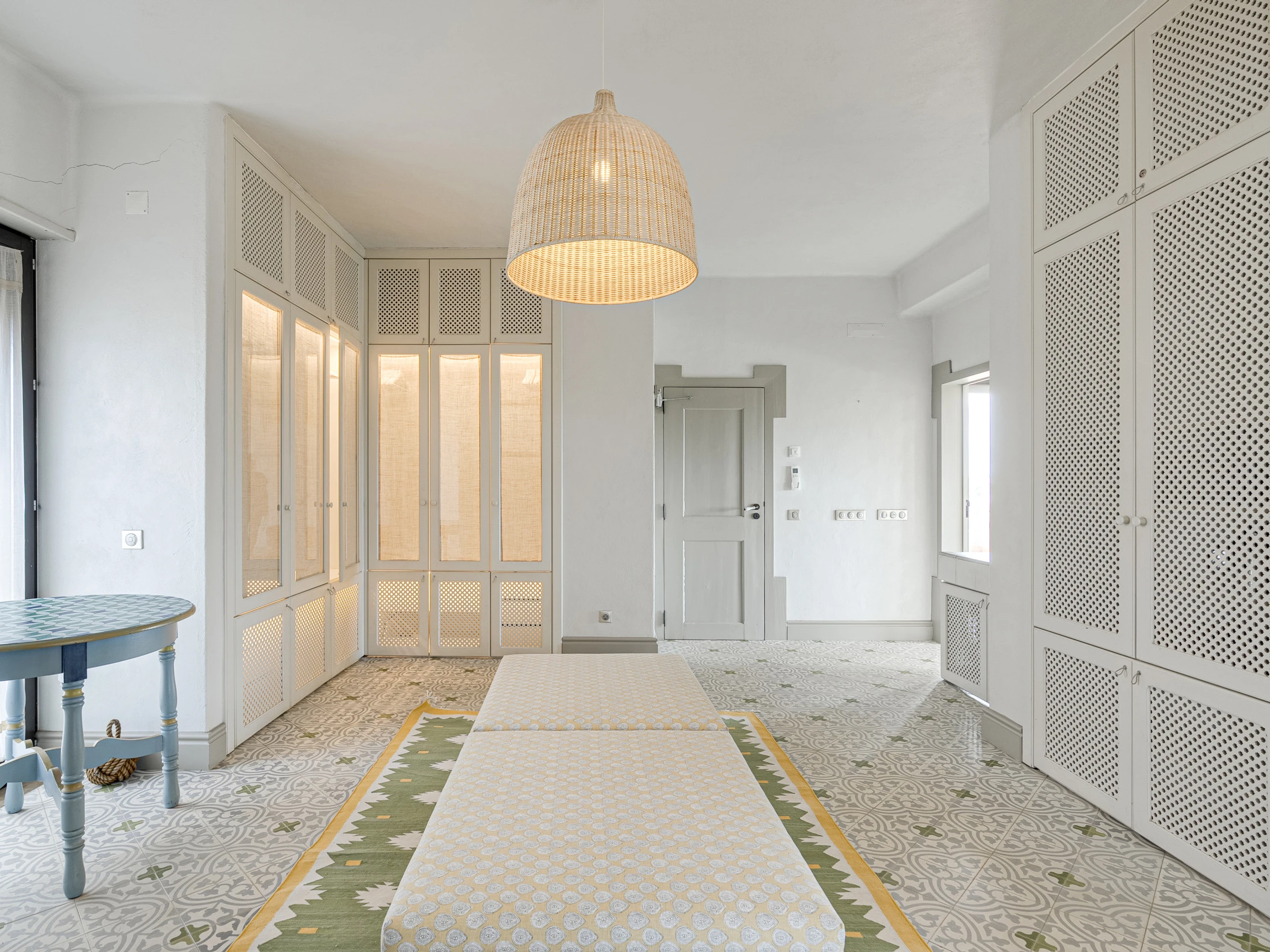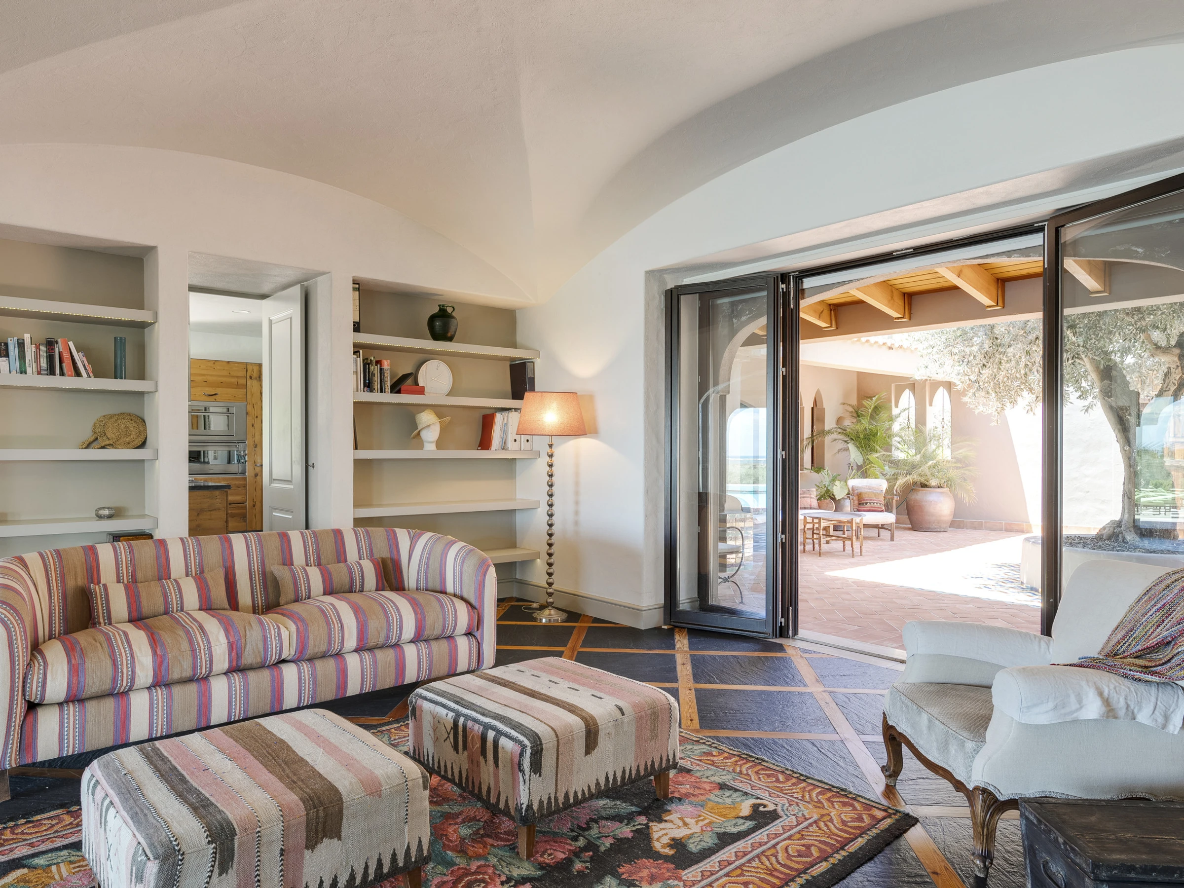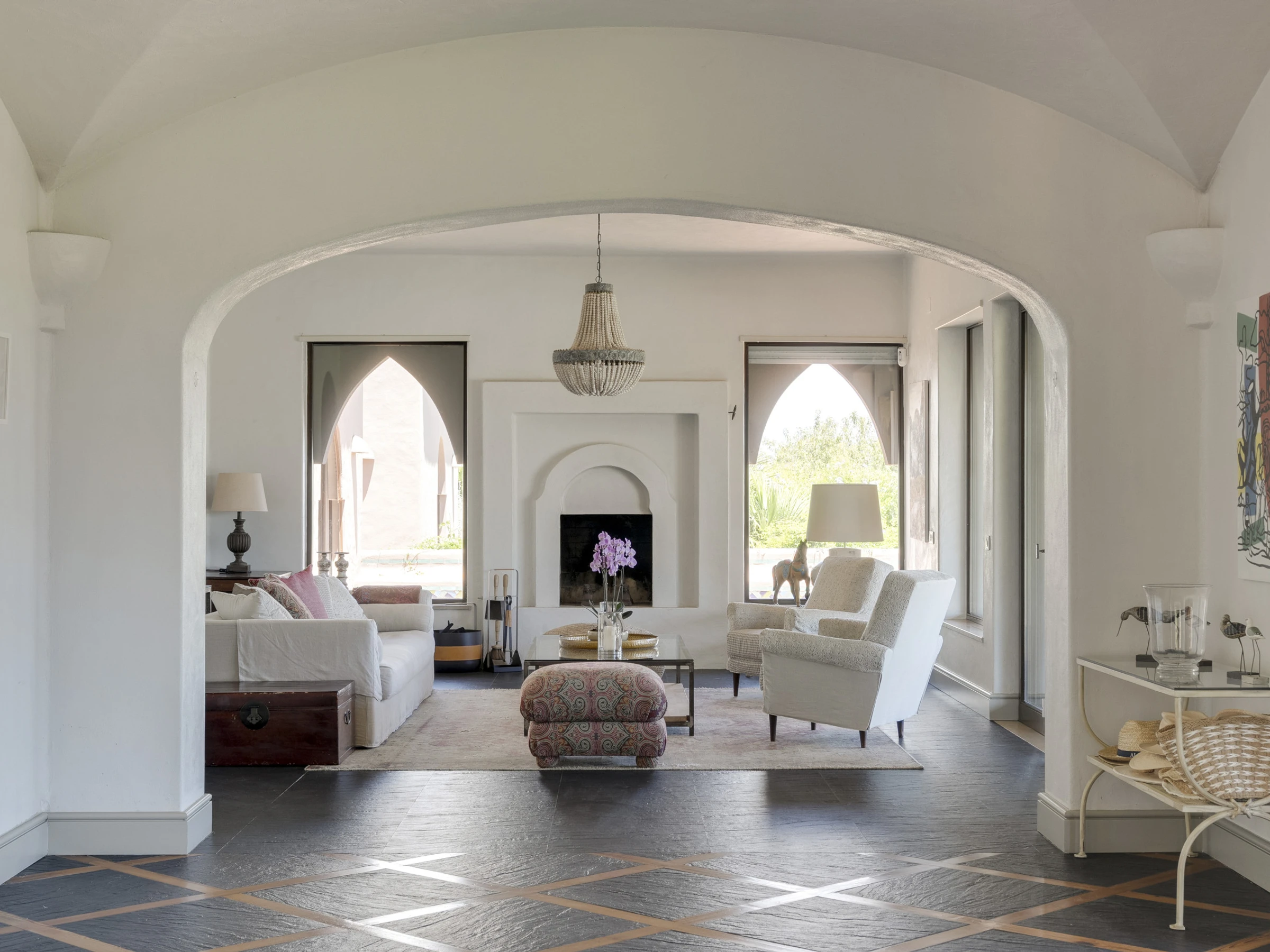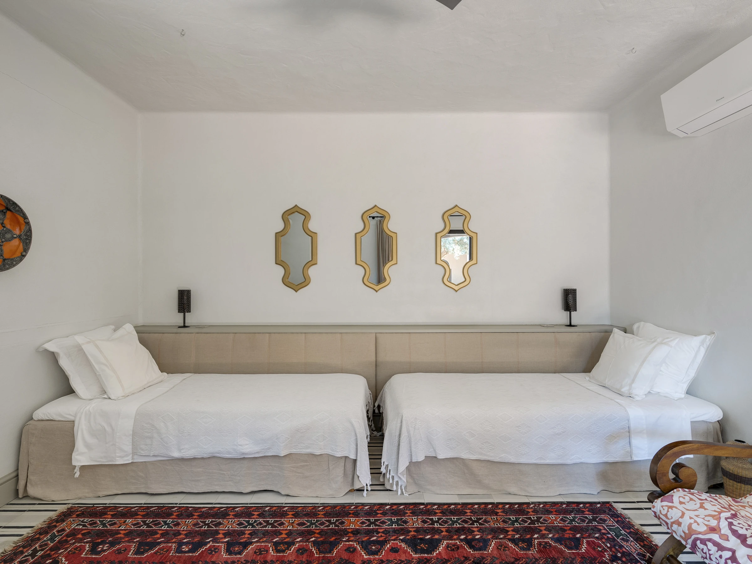 Das Innere ist interessant gestaltet mit Details wie maurischen Bögen, Gewölbedecken, Kacheln, farbenfrohen Textilien und massiven Holztüren, die einen in eine andere Welt versetzen.