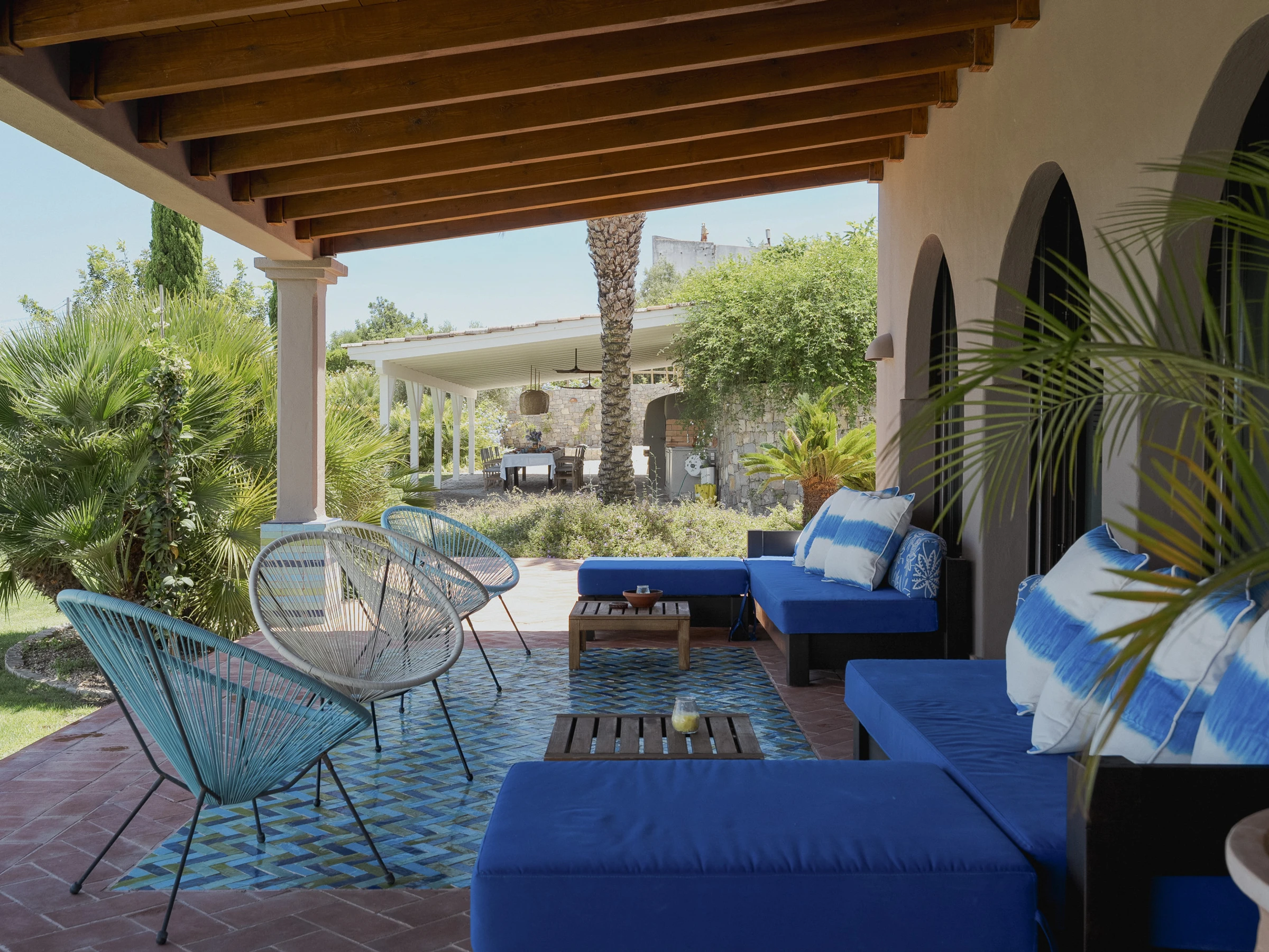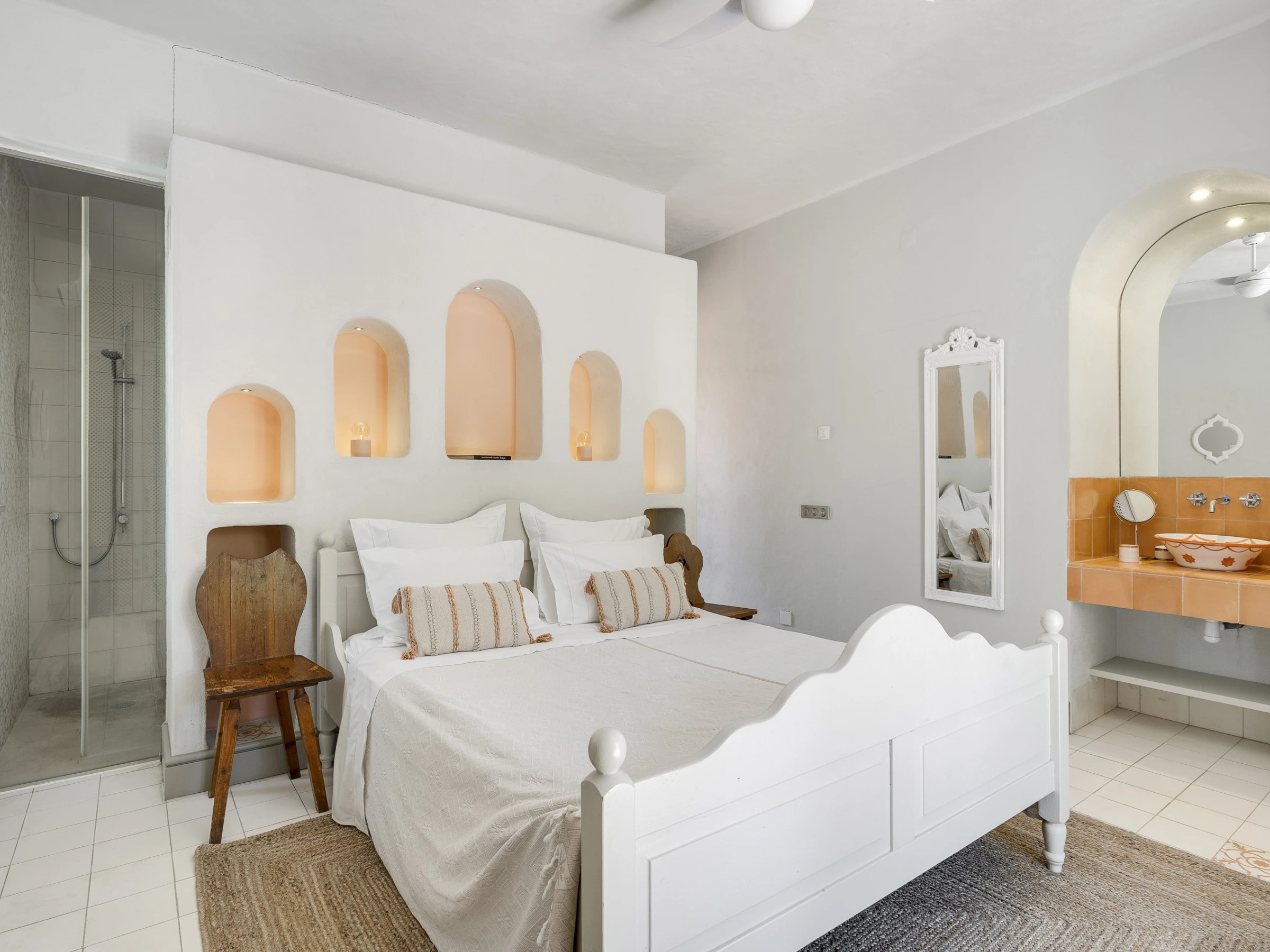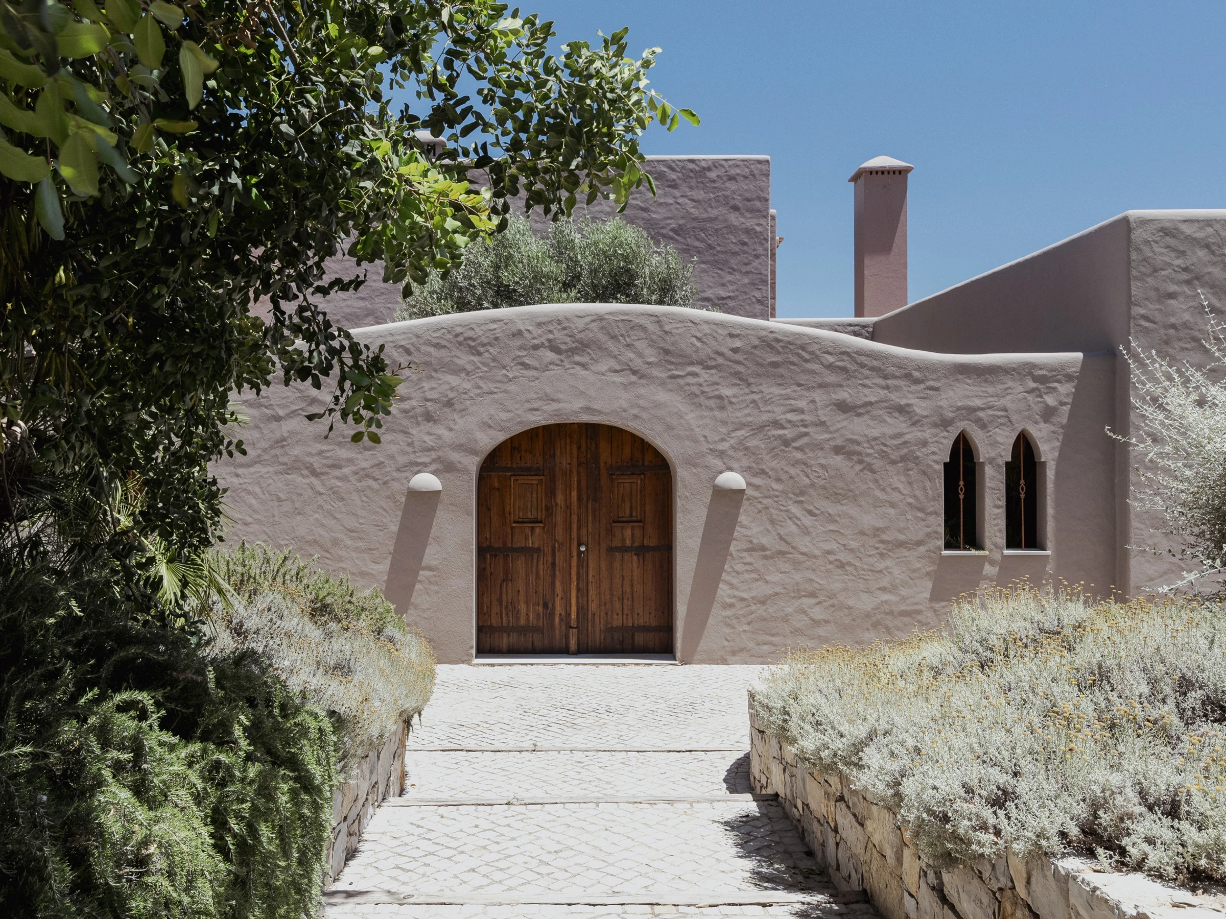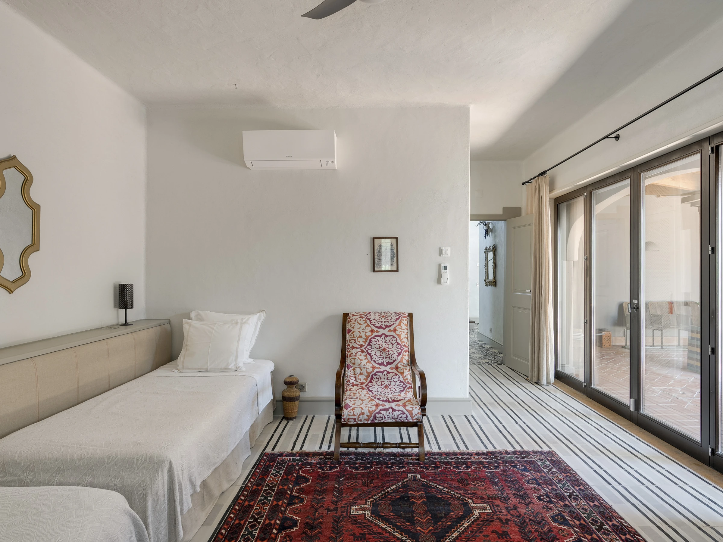 Das Innere ist interessant gestaltet mit Details wie maurischen Bögen, Gewölbedecken, Kacheln, farbenfrohen Textilien und massiven Holztüren, die einen in eine andere Welt versetzen.