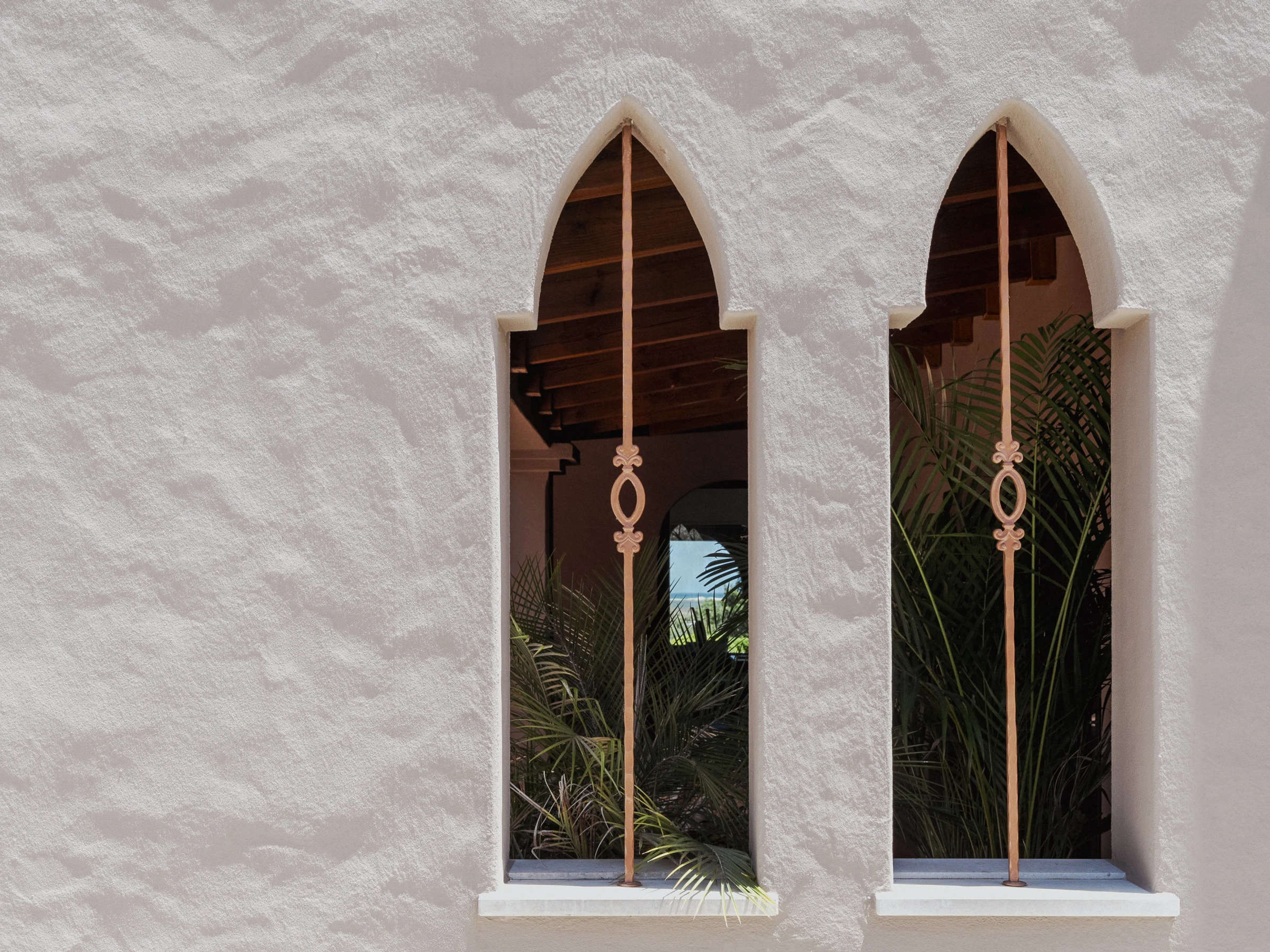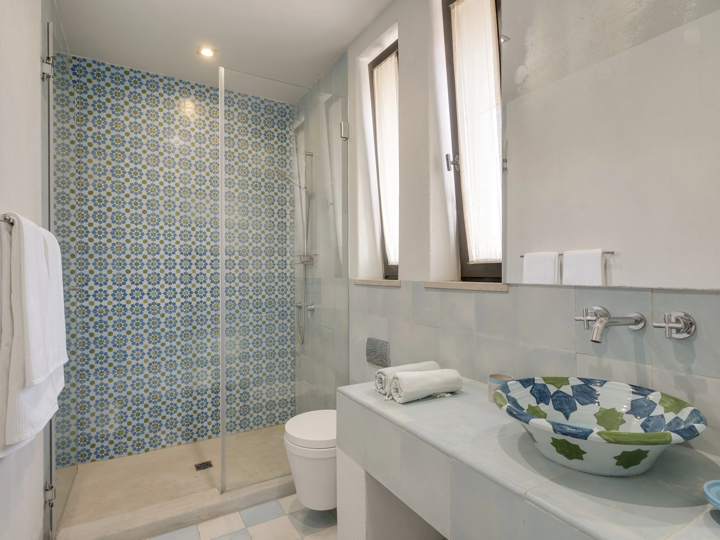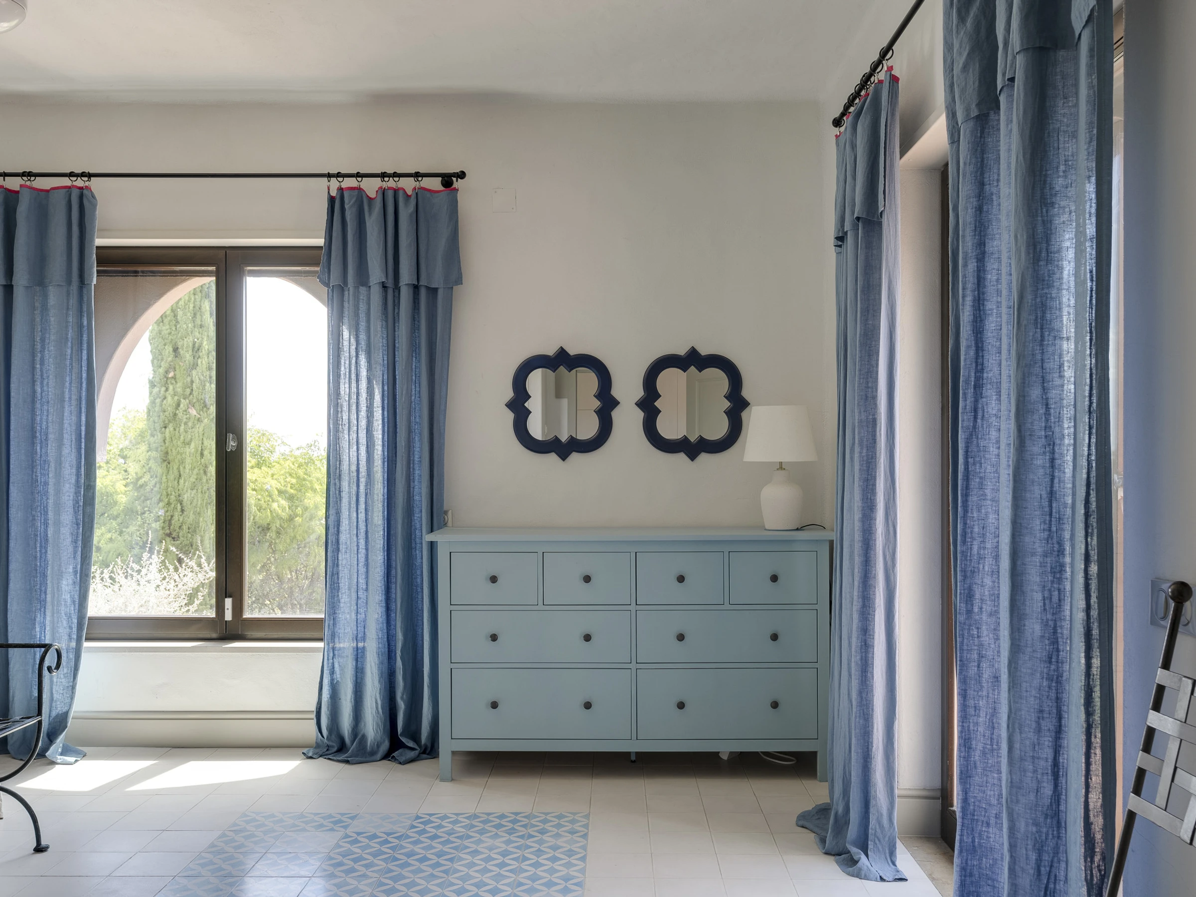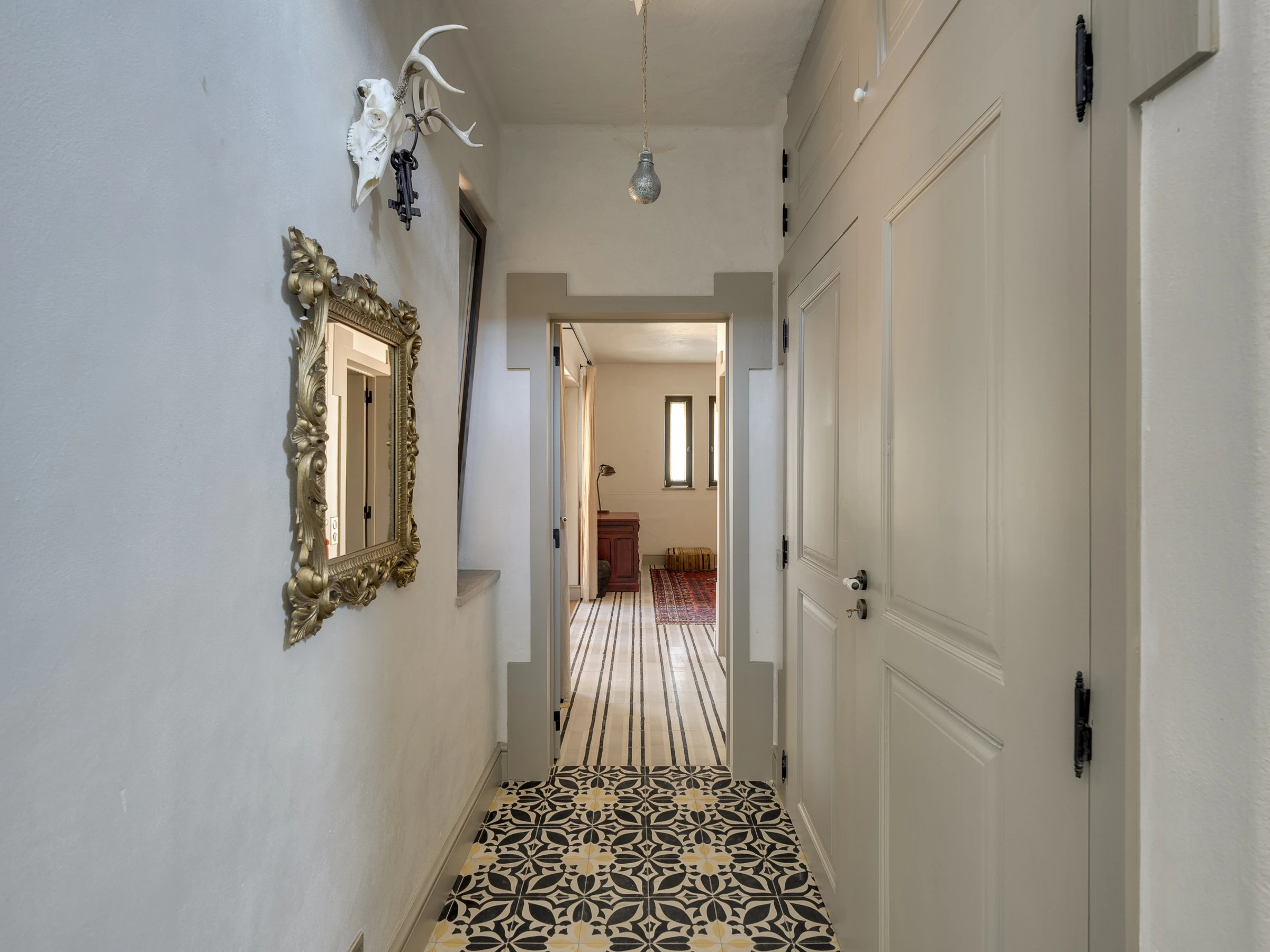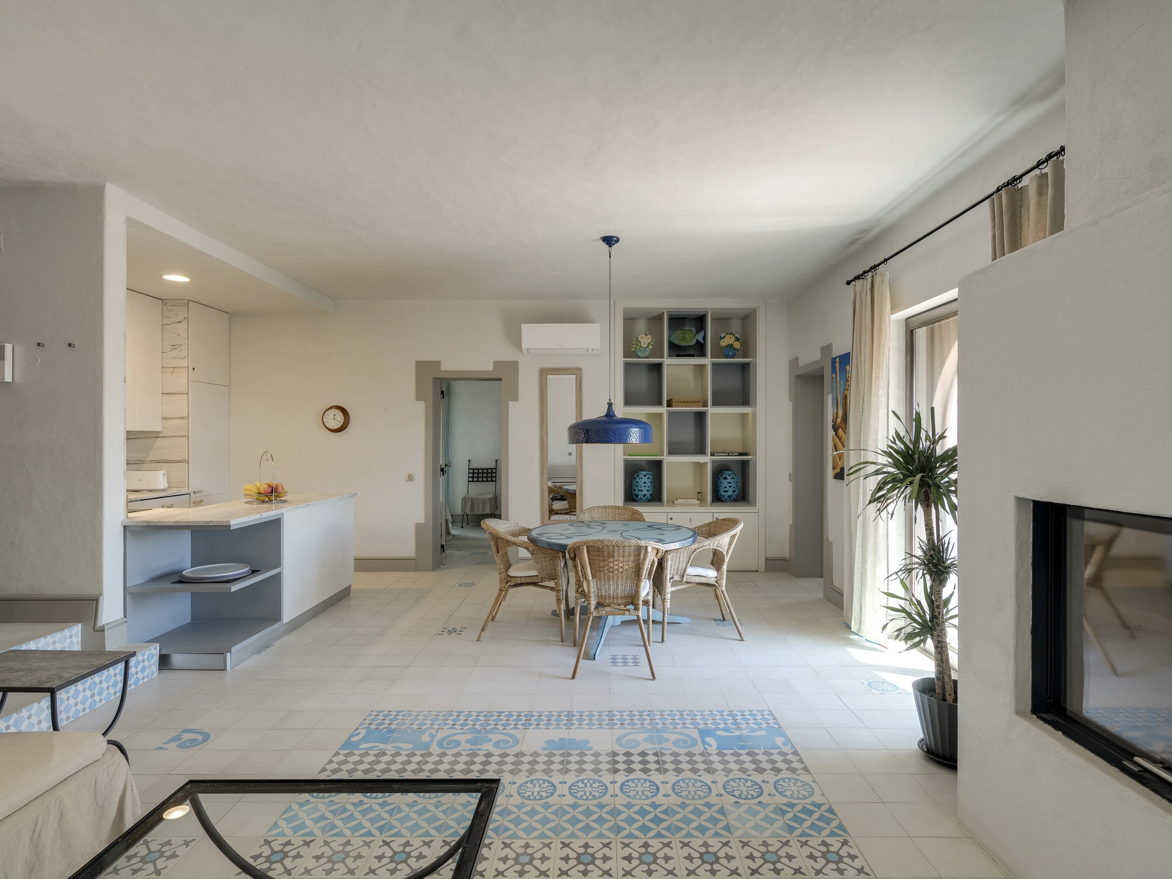 Das Innere ist interessant gestaltet mit Details wie maurischen Bögen, Gewölbedecken, Kacheln, farbenfrohen Textilien und massiven Holztüren, die einen in eine andere Welt versetzen.