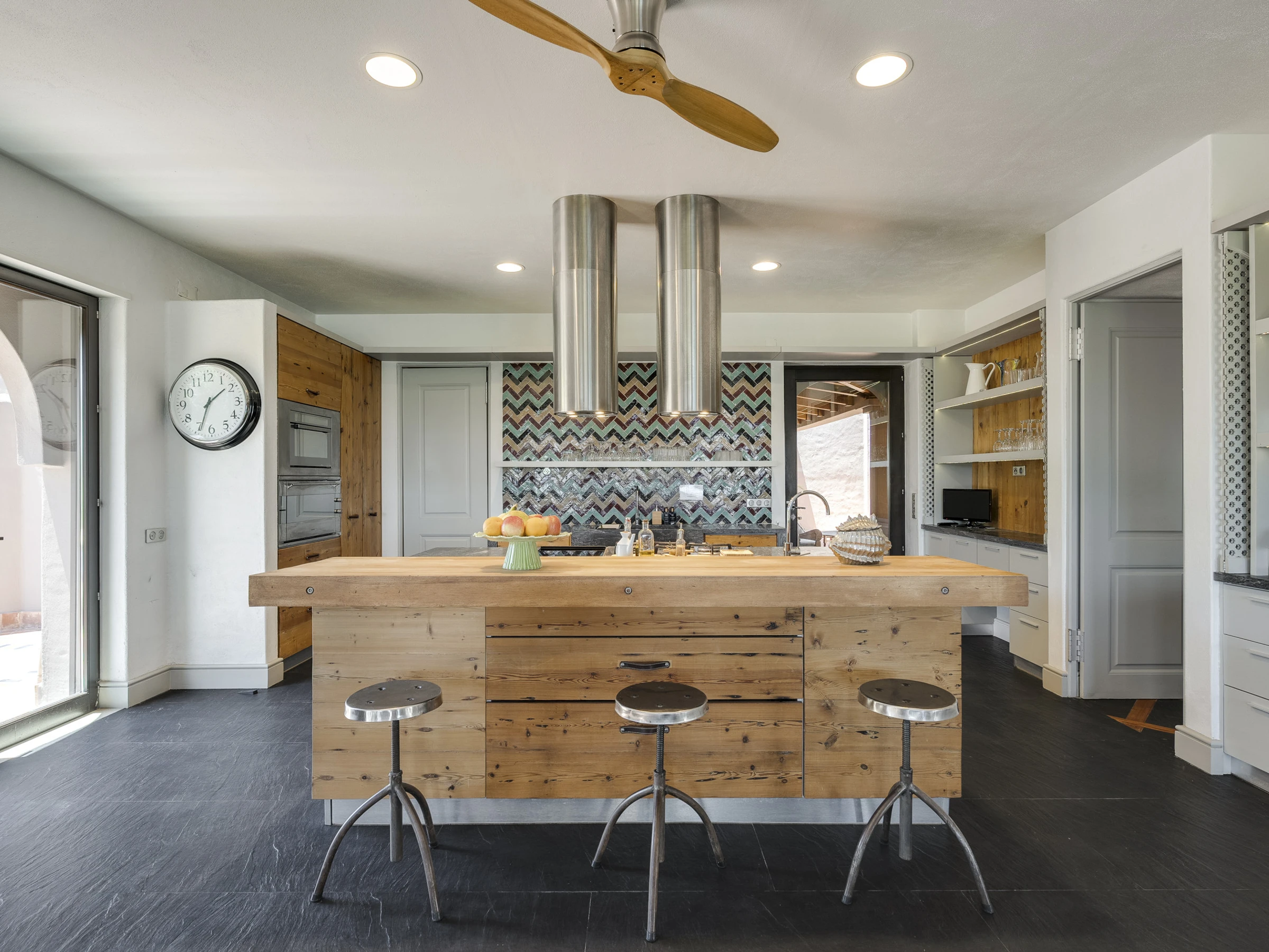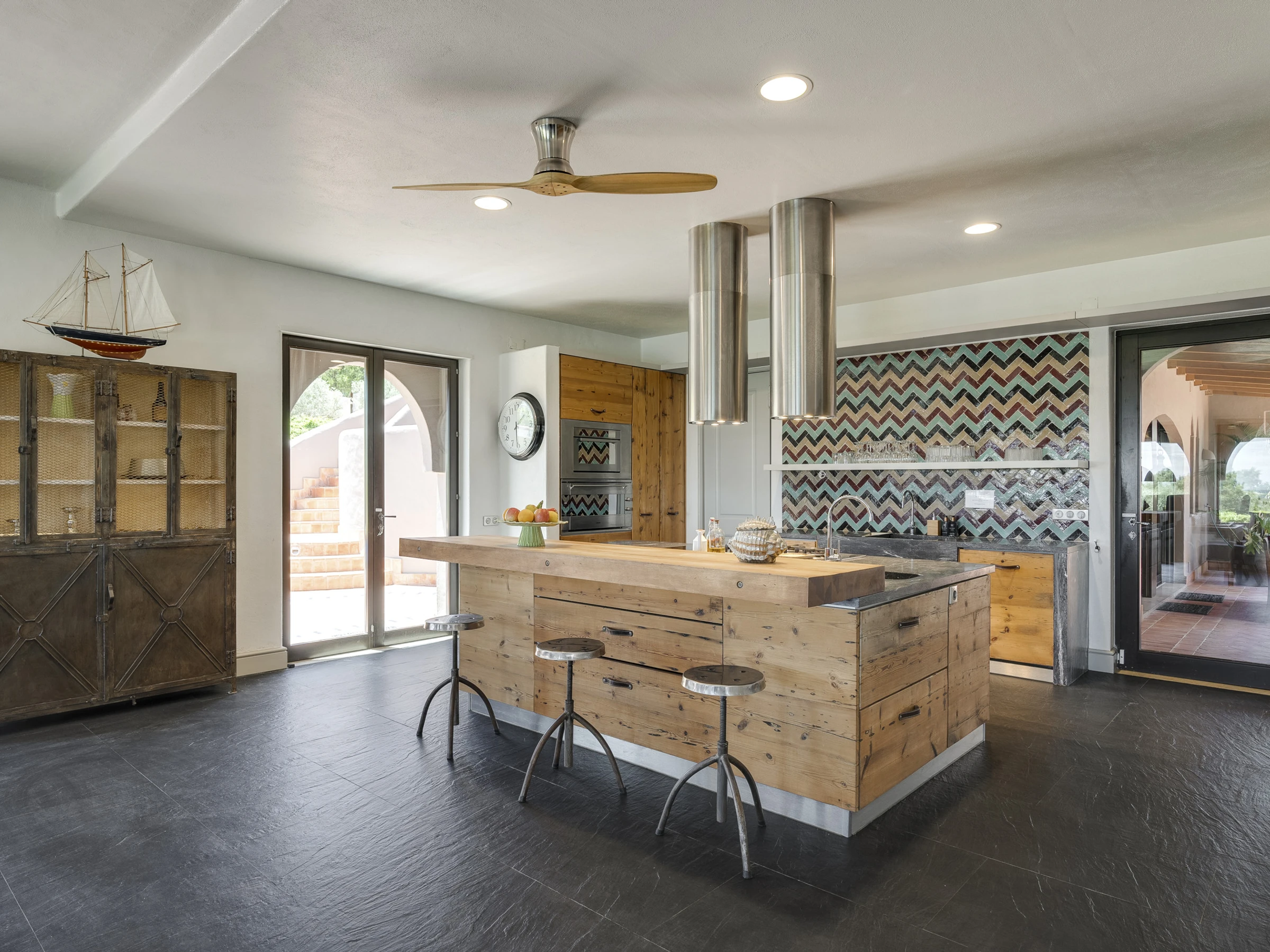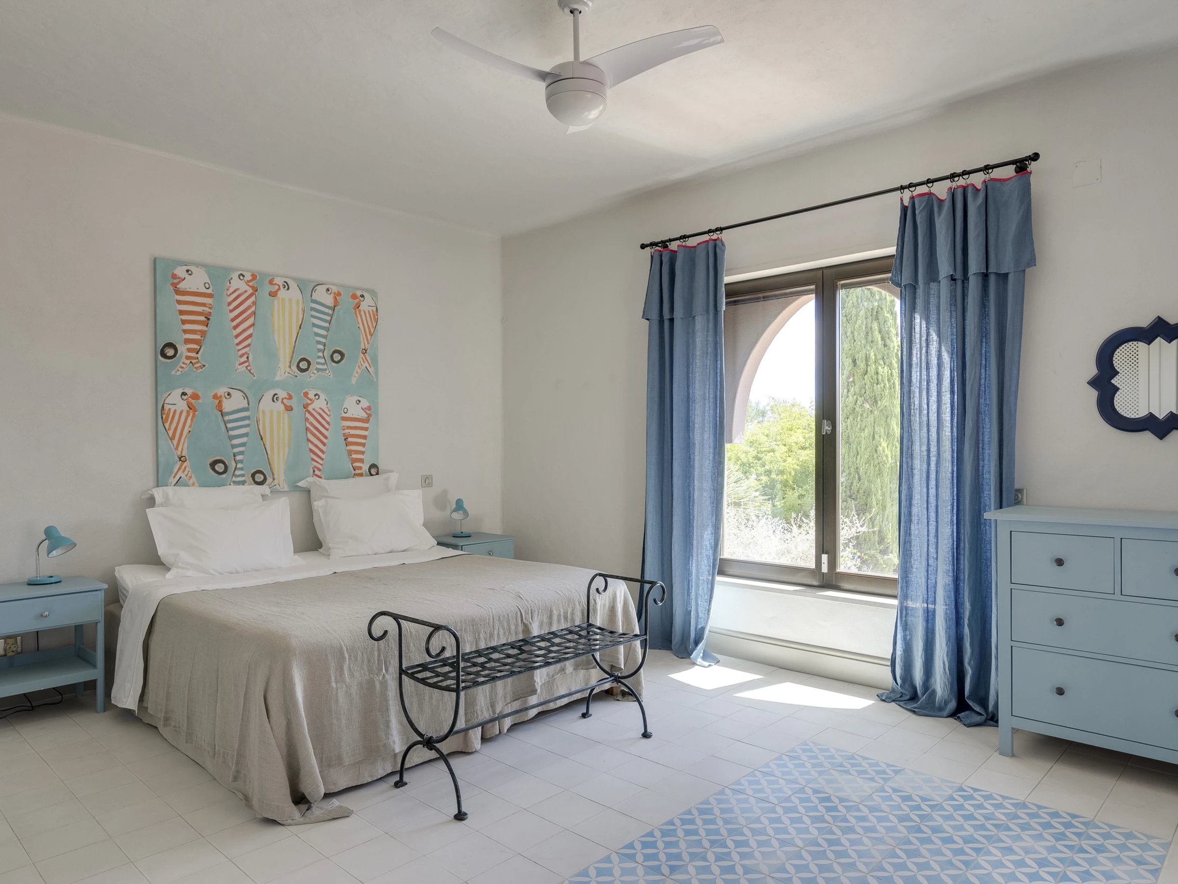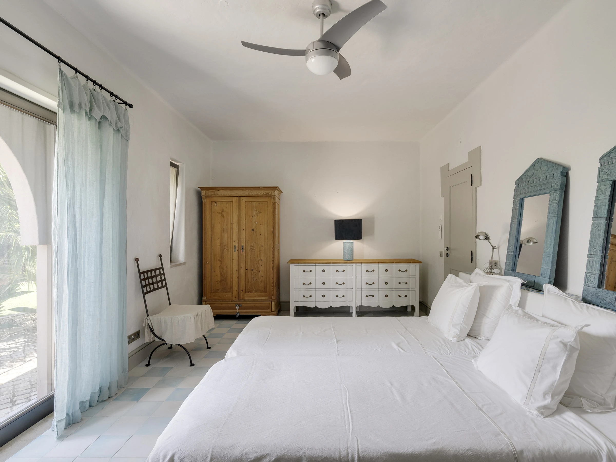 Das Innere ist interessant gestaltet mit Details wie maurischen Bögen, Gewölbedecken, Kacheln, farbenfrohen Textilien und massiven Holztüren, die einen in eine andere Welt versetzen.