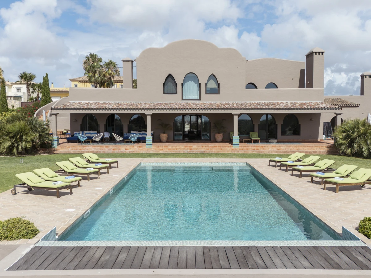 Eine atemberaubende Villa, inspiriert von der maurischen Architektur der Iberischen Halbinsel, gelegen an einem sanften Hügel mit wunderschönen, panoramischen Meerblicken.