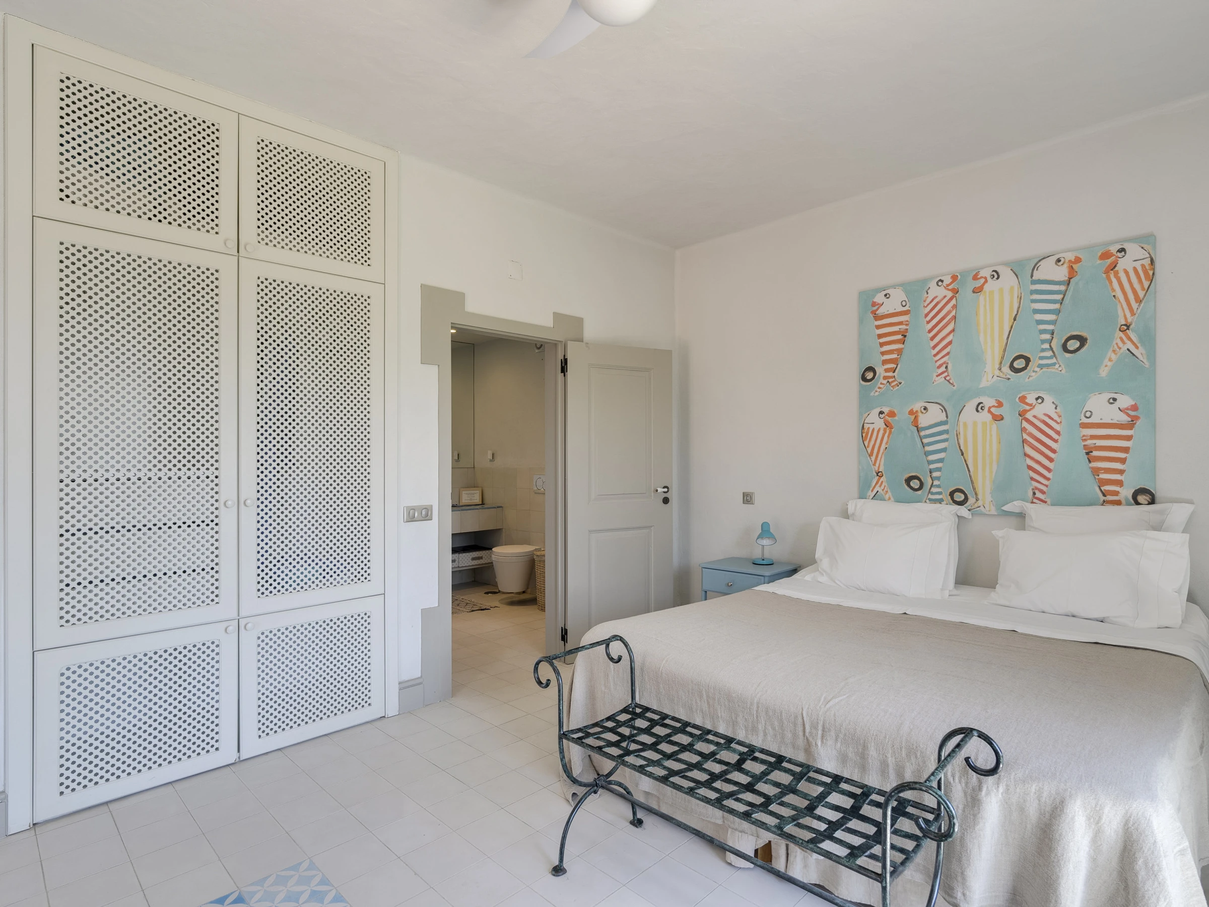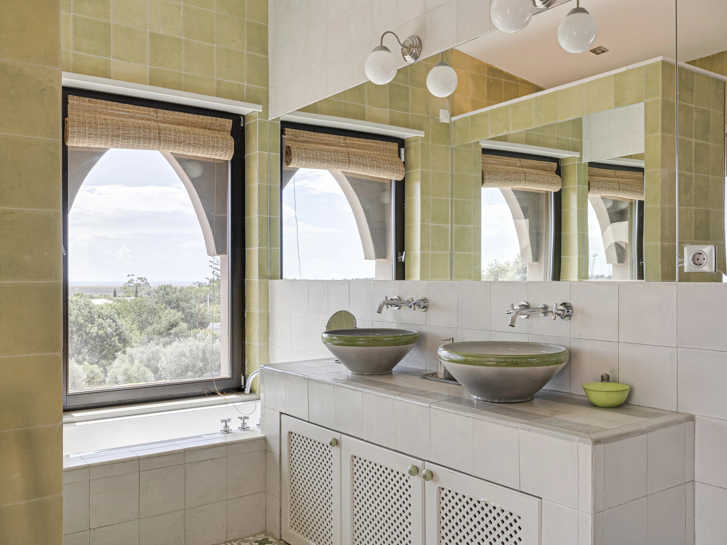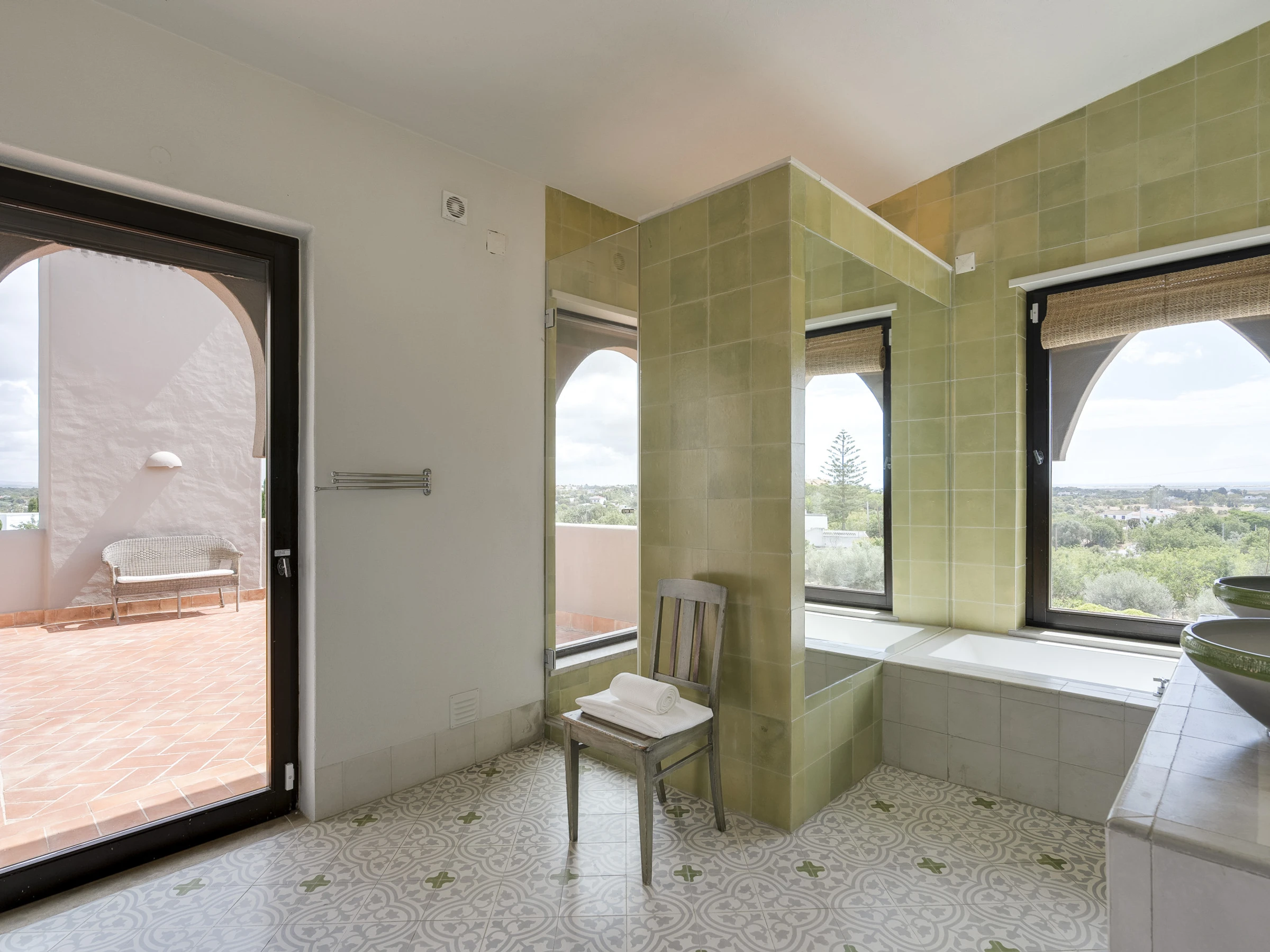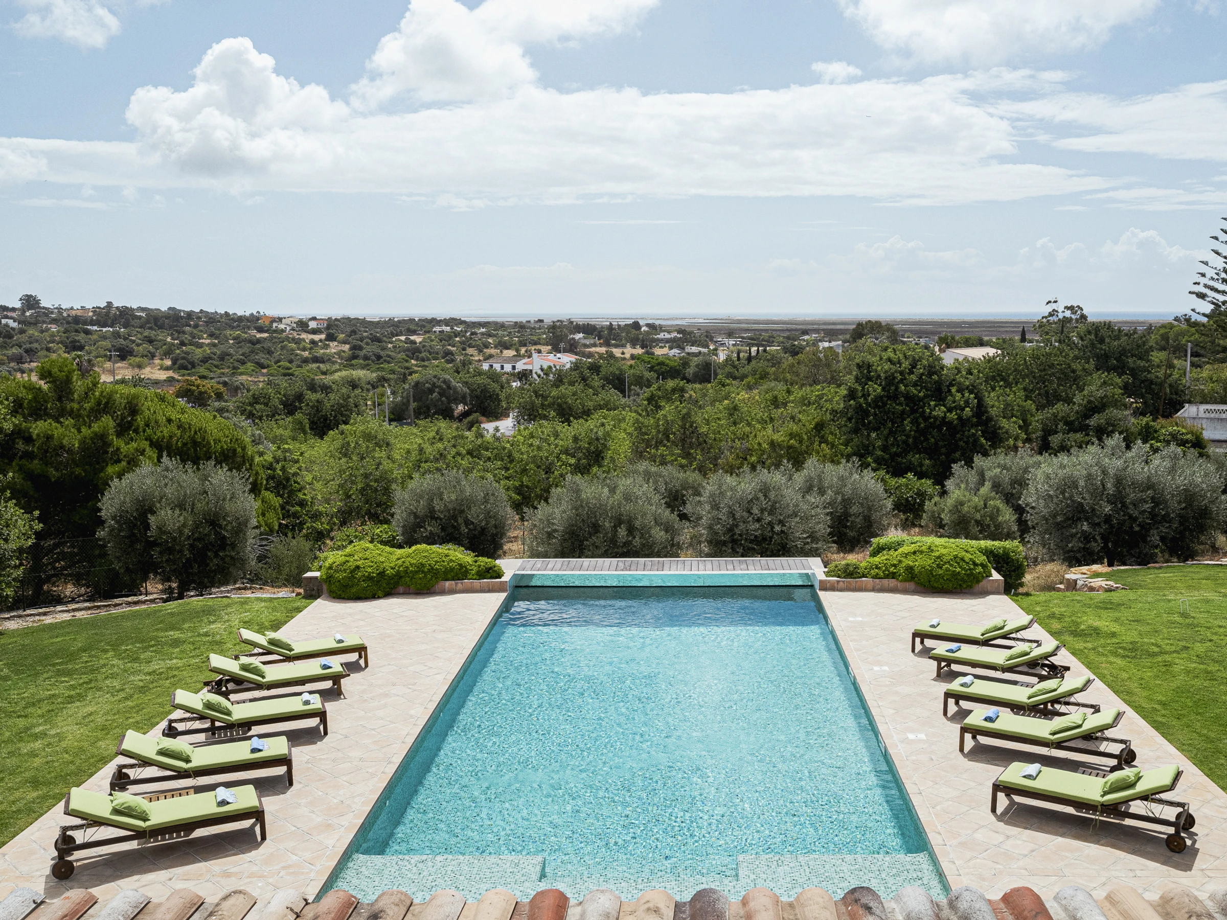 Mit insgesamt 7000 m², 6 Doppelzimmern mit eigener Dusche/Bad, verteilt auf 2 Häuser, umgeben von fast einem Hektar gepflegter Gartenanlage, mit privaten Sonnenterrassen und einem großen salzgefilterten Swimmingpool, bietet sich ein ununterbrochener Blick auf die Küste und die Insel Ilha da Armona im Süden sowie den Berg Monte Figo im Norden.
