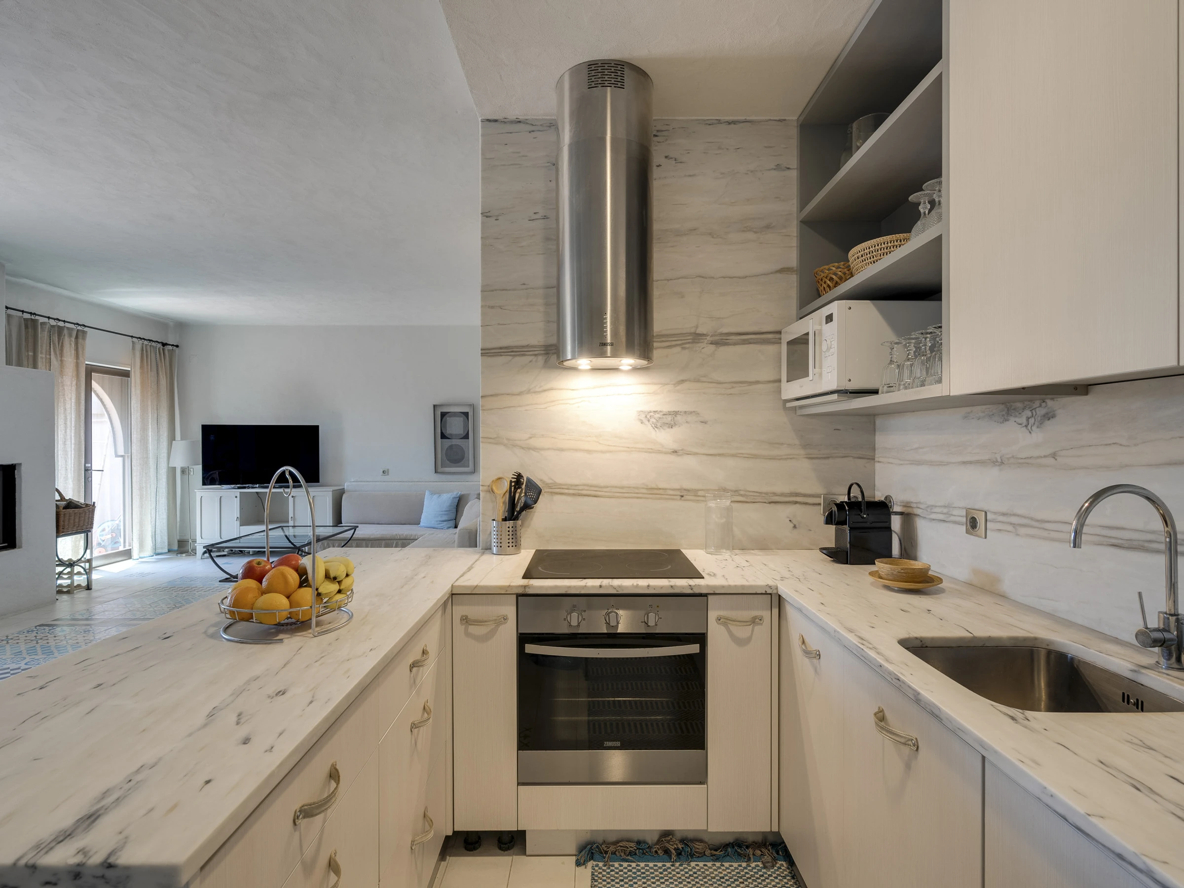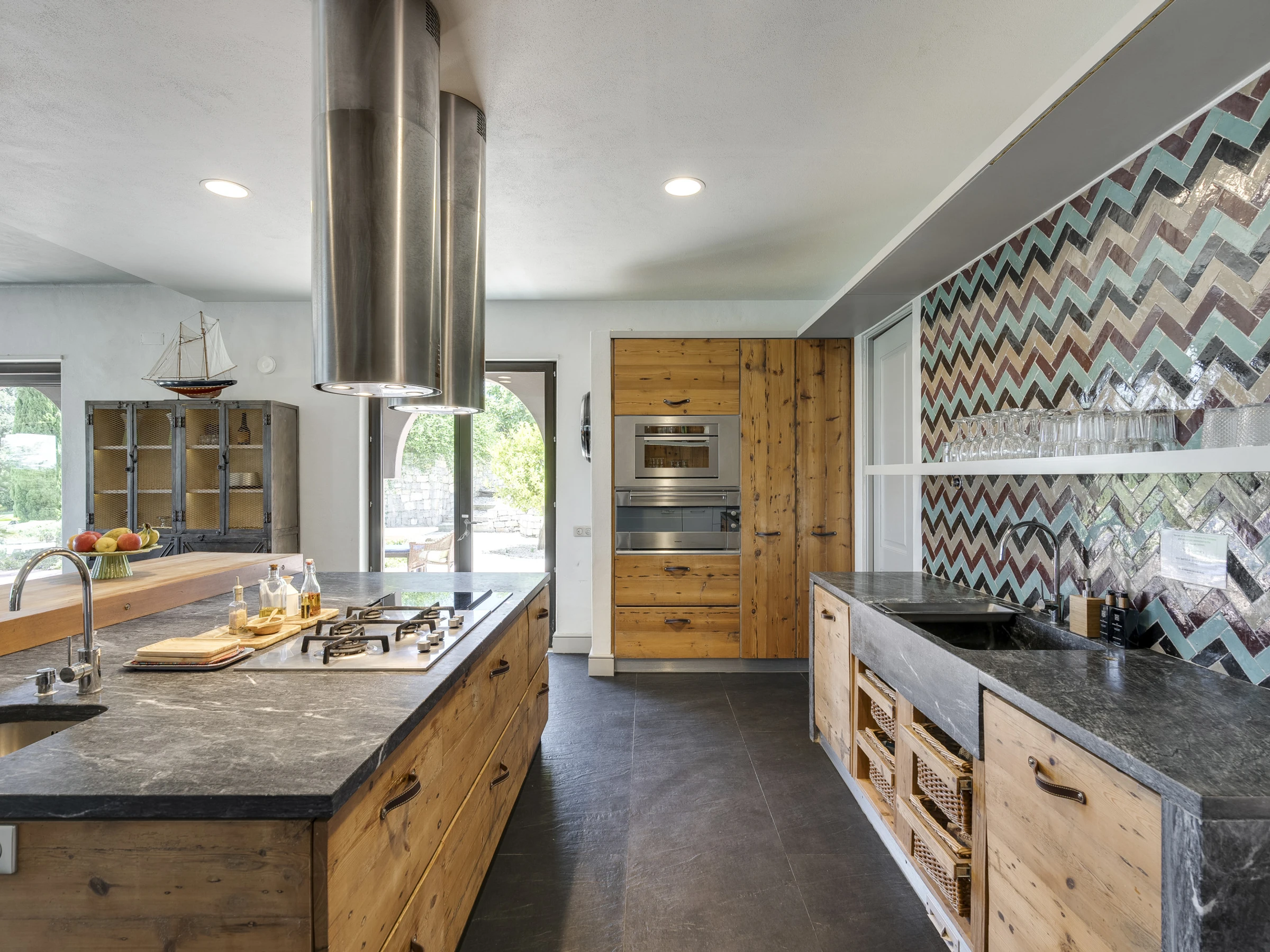 Die amerikanische offene Küche ist gut ausgestattet und verfügt über eine Teppanyaki-Grillplatte. Die Frühstücksbar lädt zu entspannten Morgenstunden ein. Zusätzlich gibt es eine Speisekammer zur Aufbewahrung und einen separaten Waschraum mit einer dezenten Trockenzone.