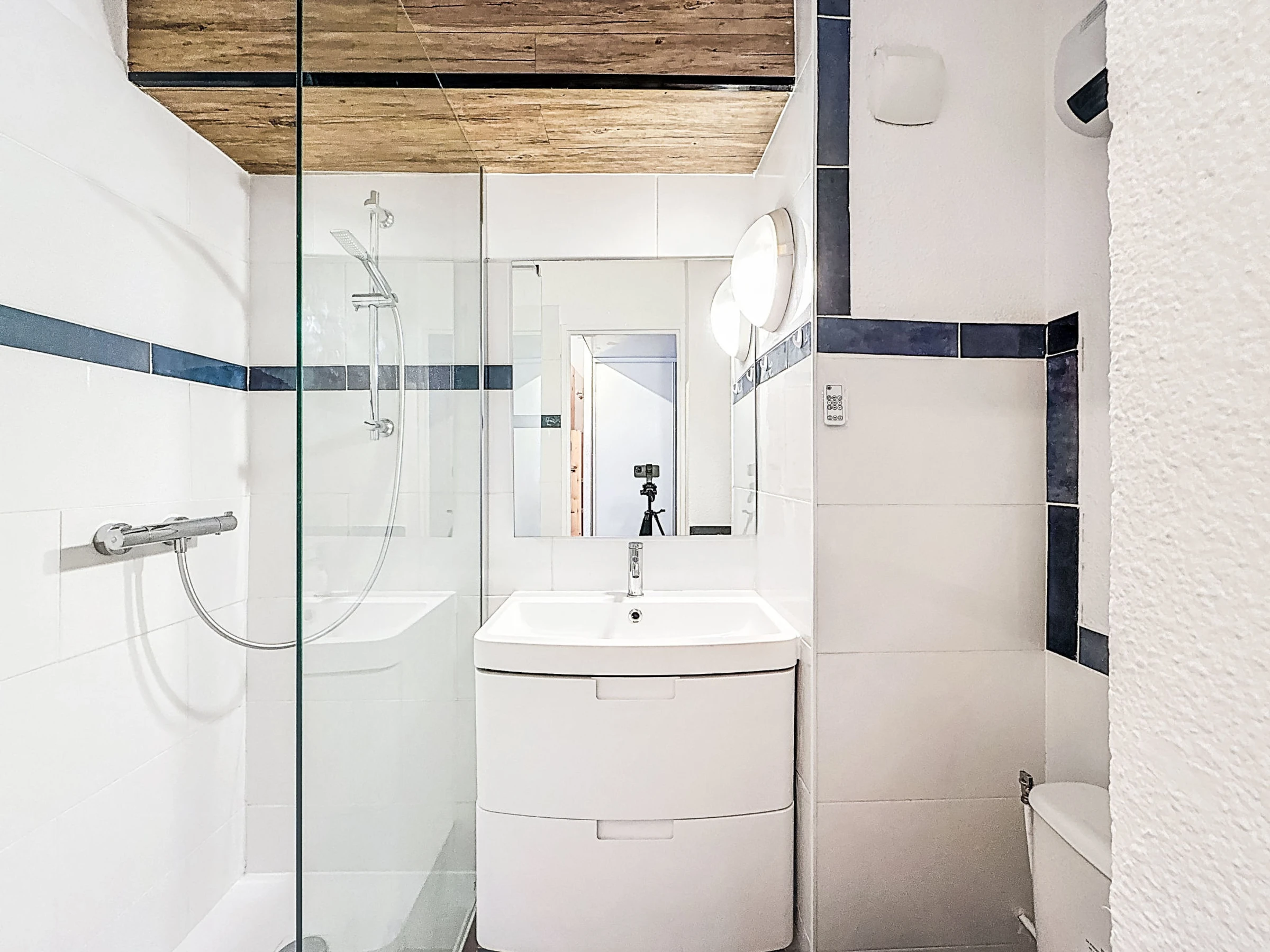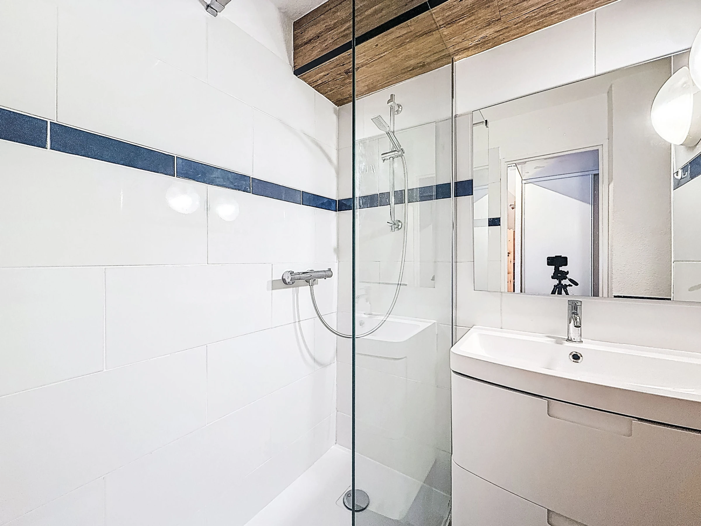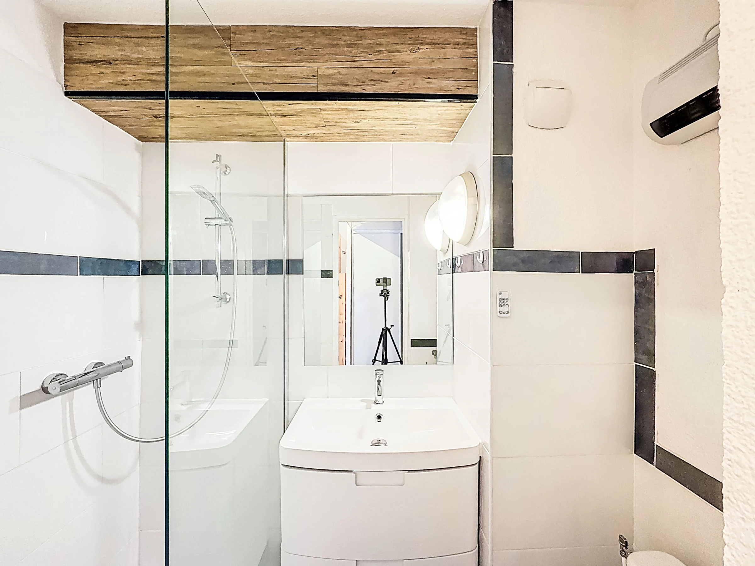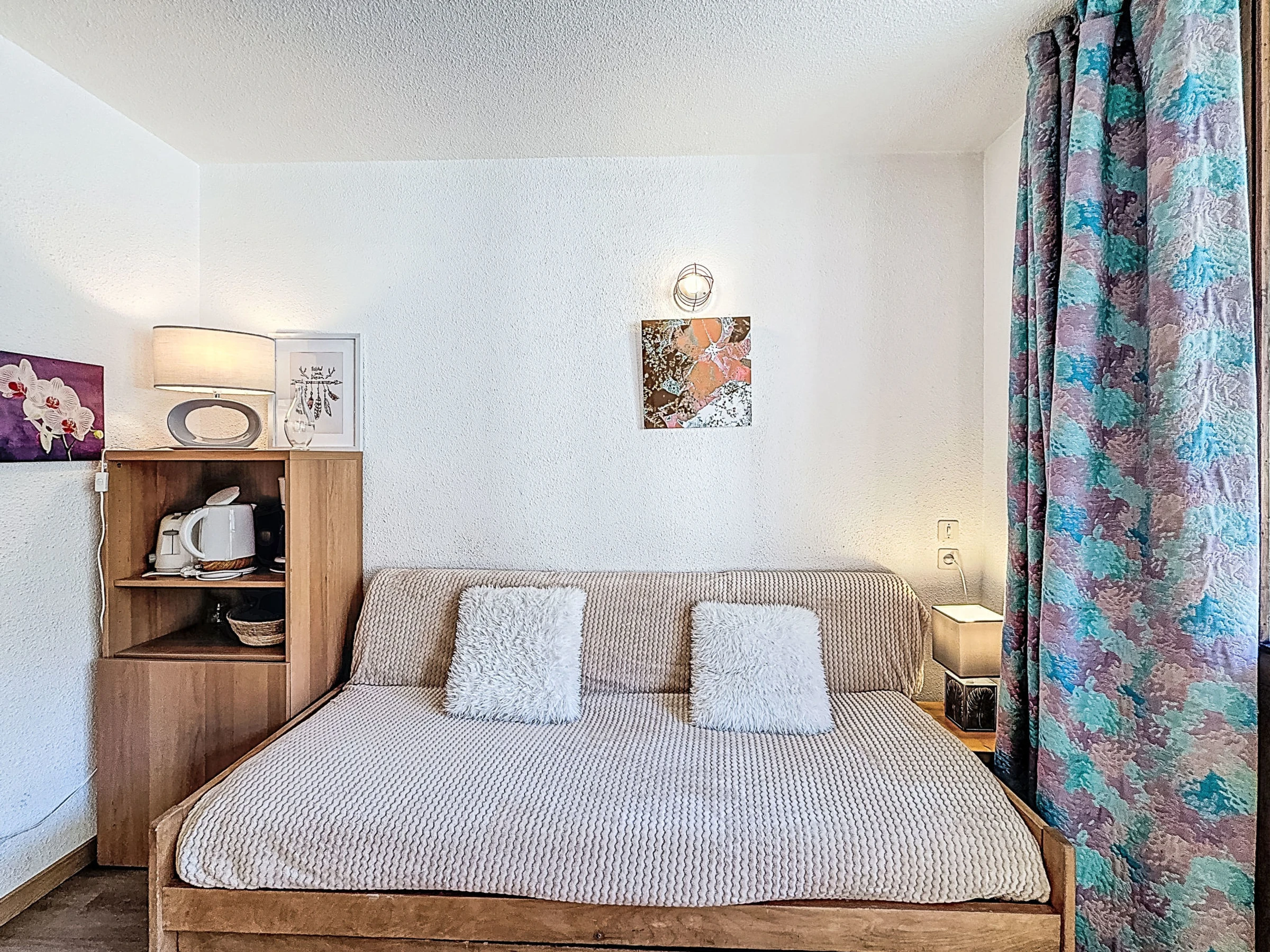 1-Zimmer-Wohnung 20 m2 im 2. Stock. Wohn-/Esszimmer mit 1 Ausziehbett (2 Pers. 2 x 80 cm), TV. Eingang mit 1 x 2 Etagenbetten (80 cm). Kochnische (2 Kochplatten, Mikrowelle). Bad/WC. Balkon, Westlage. Sicht auf die Berge. Zur Verfügung: Internet (Wireless LAN, extra). Bitte beachten: Rauchmelder.