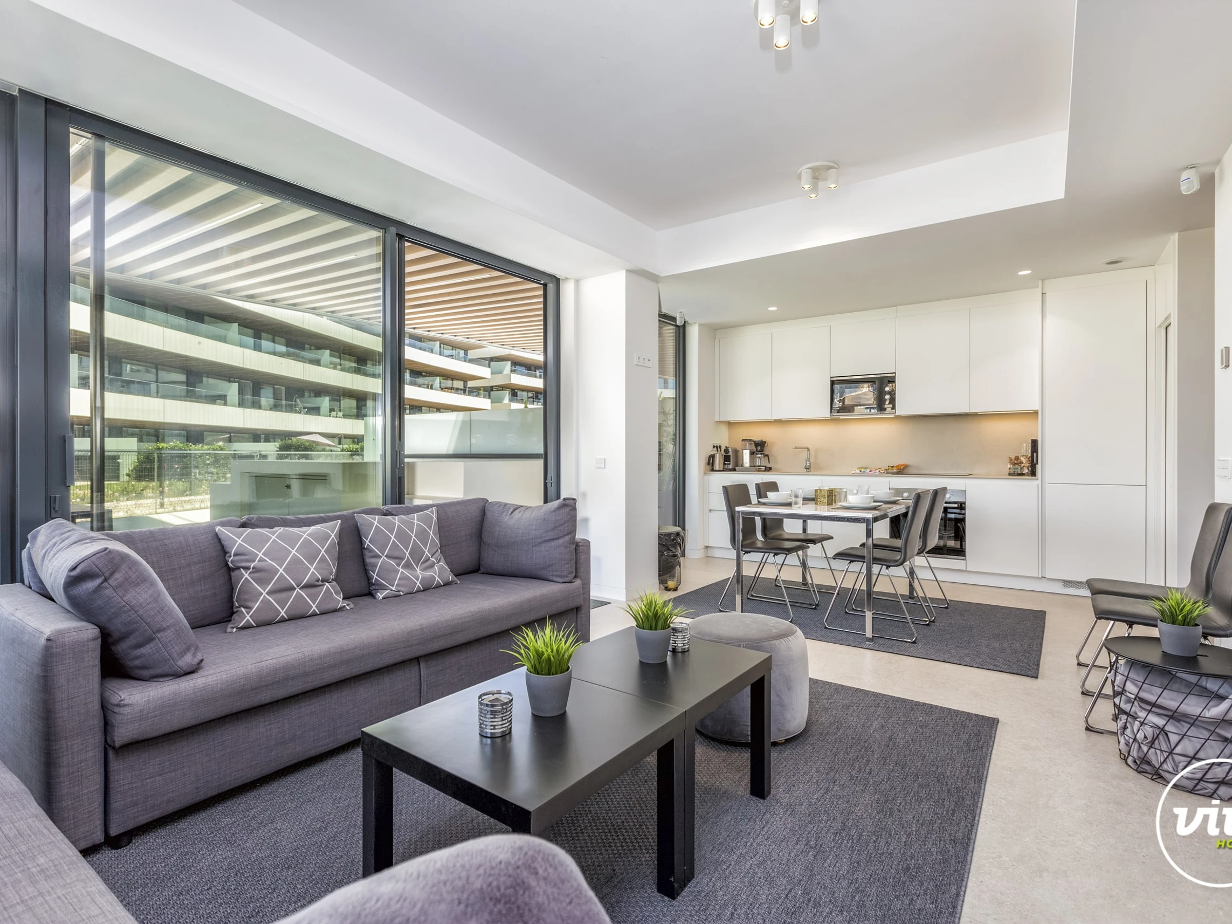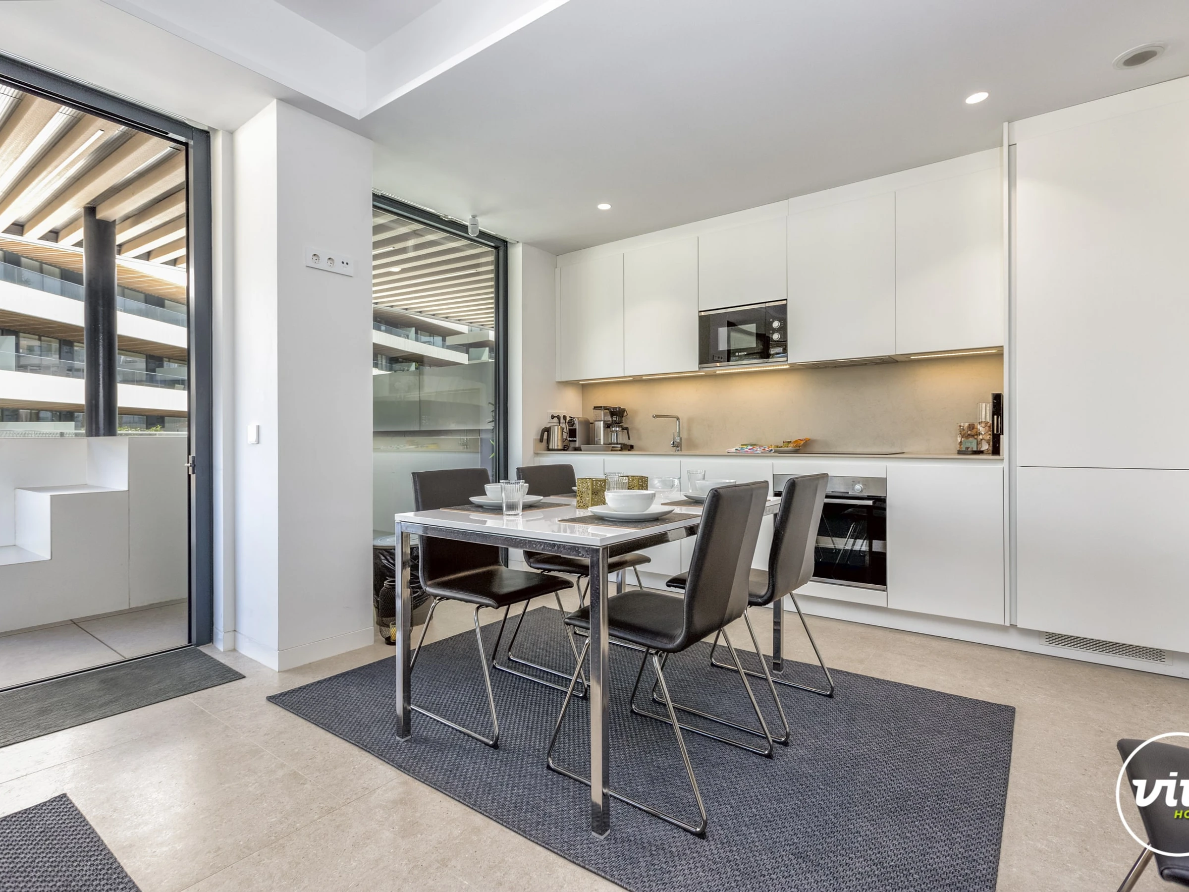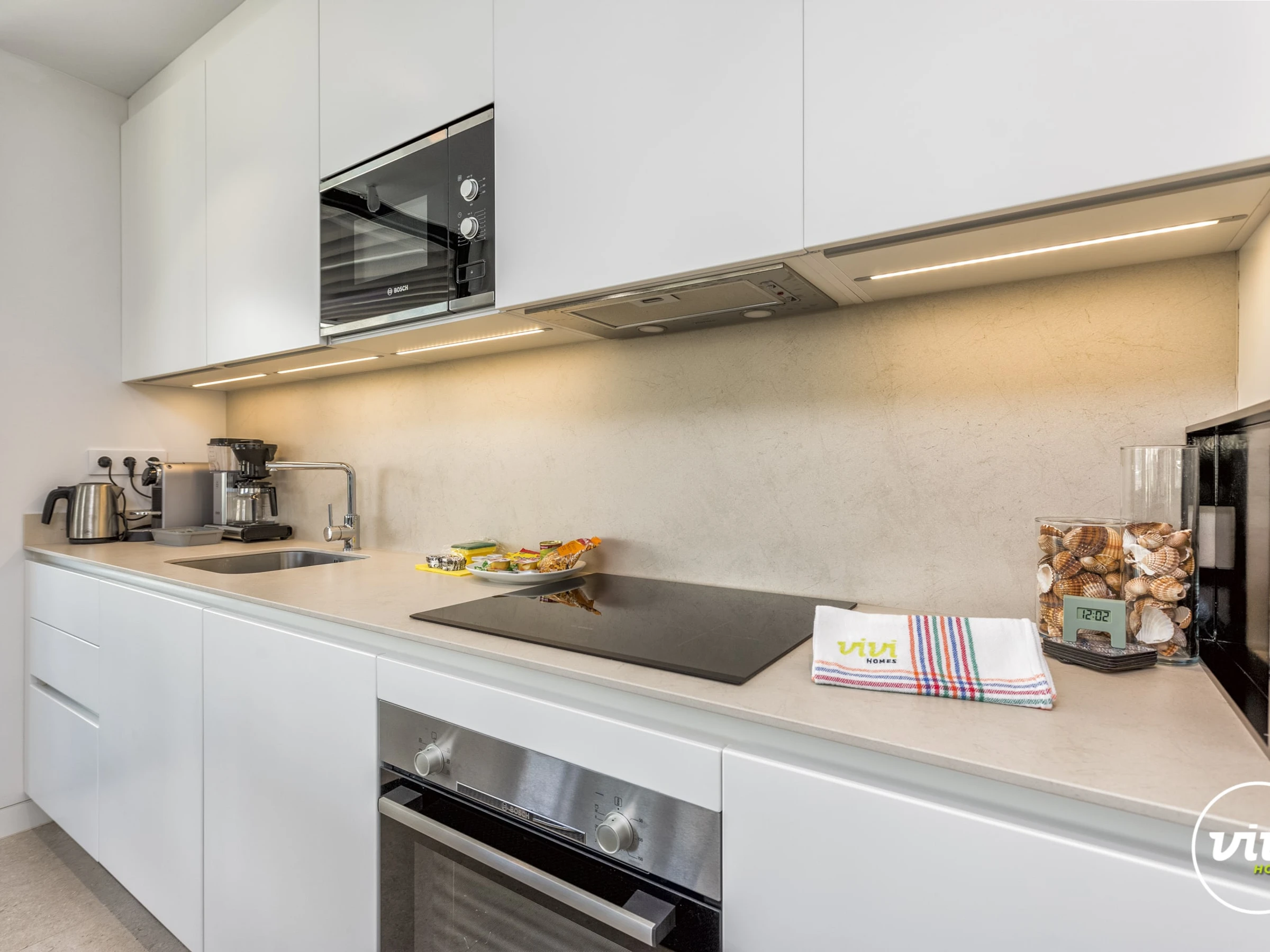 Dieses offene küche, elektrisches kochfeld, ist ausgestattet in kühlschrank, mikrowelle, backofen, gefrierschrank, spülmaschine, geschirr/besteck, kochutensilien, kaffeemaschine, toaster, wasserkocher, küchengeschirr, teller und schüsseln, herdplatte.