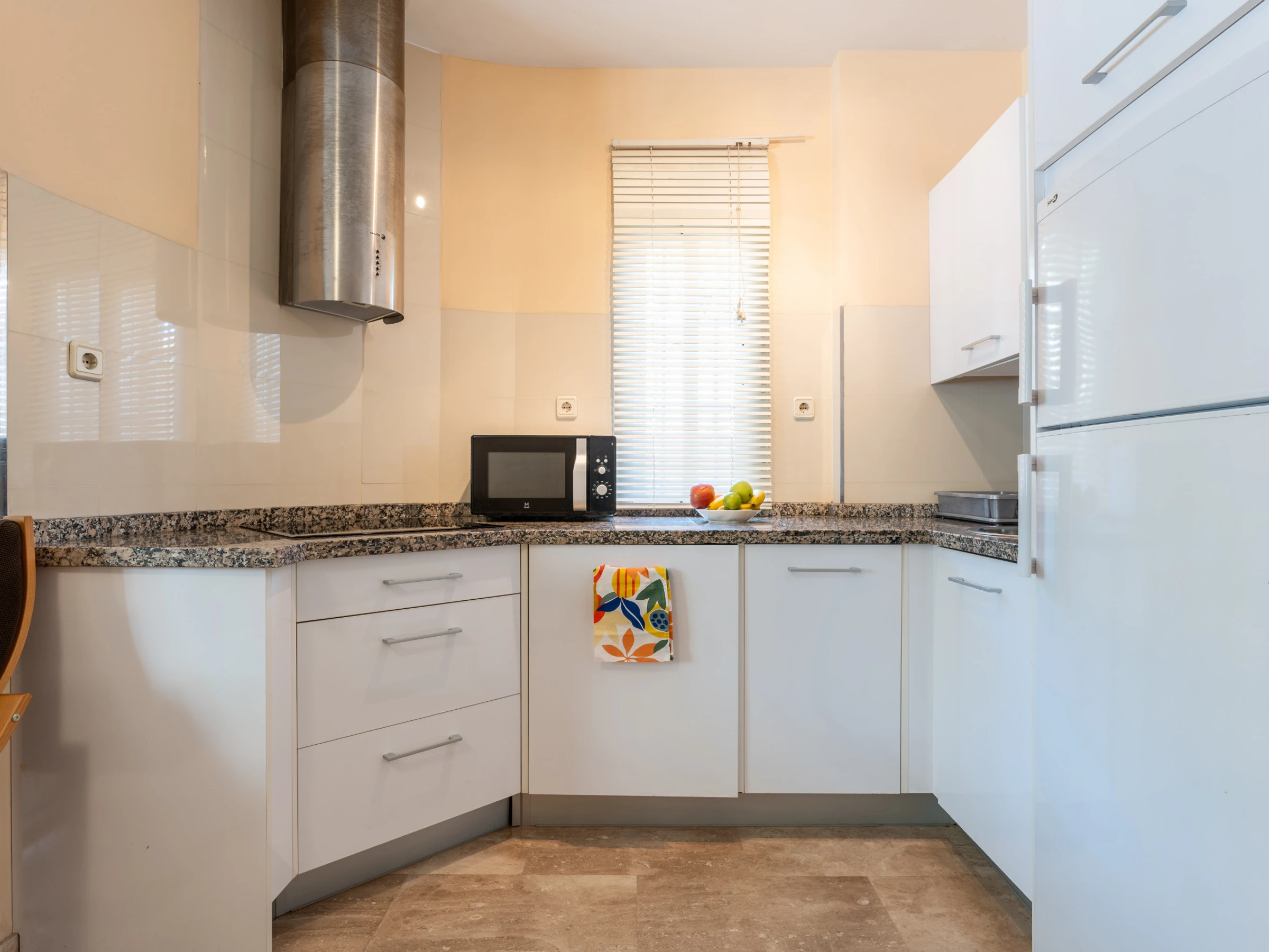 Dieses offene küche, mit ceranfeld, ist ausgestattet in kühlschrank, mikrowelle, gefrierschrank, spülmaschine, geschirr/besteck, kochutensilien, kaffeemaschine, toaster, wasserkocher und saftpresse.