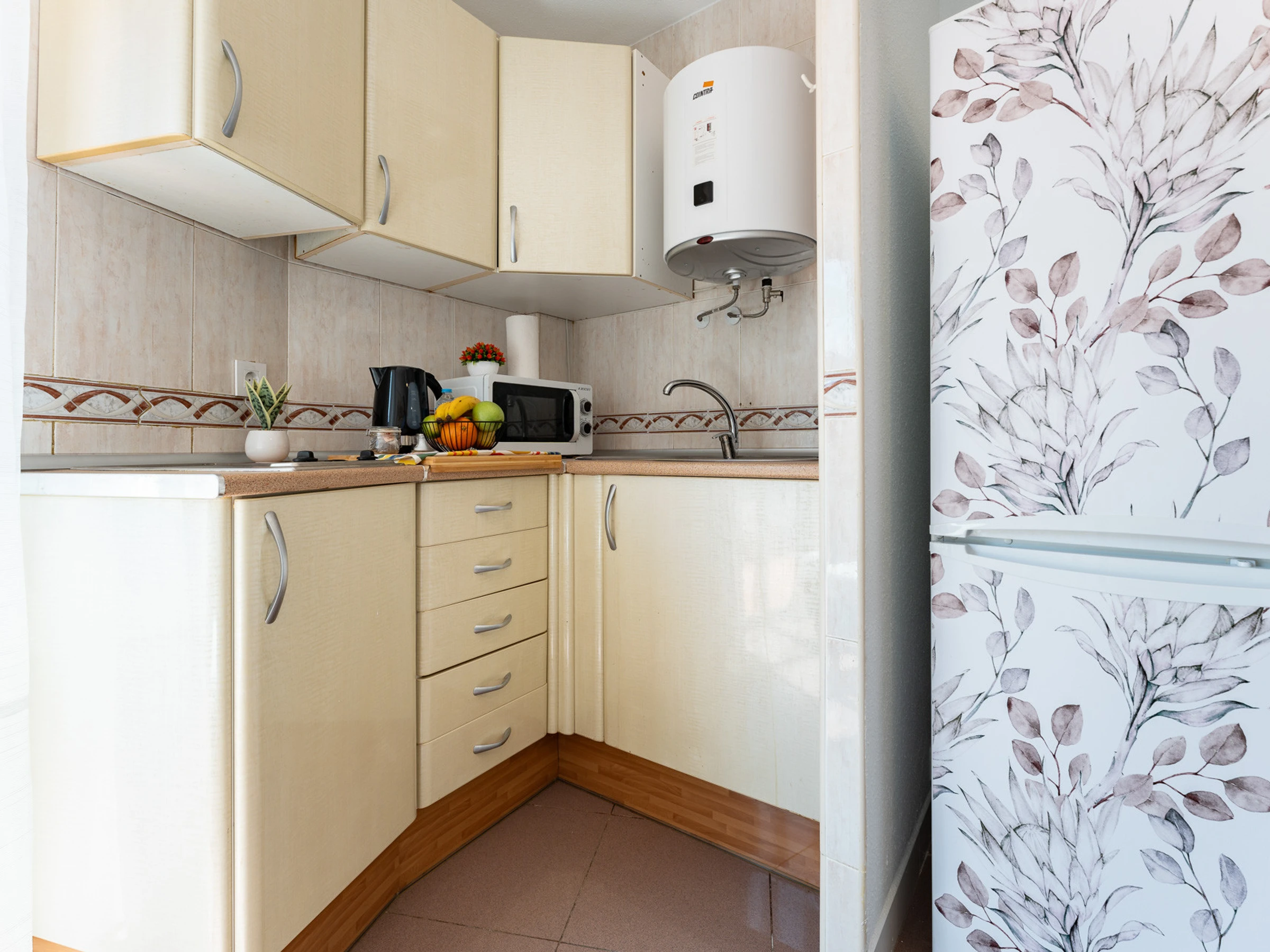 Dieses offene küche, mit ceranfeld, ist ausgestattet in kühlschrank, mikrowelle, gefrierschrank, geschirr/besteck, kochutensilien, kaffeemaschine, toaster, wasserkocher und saftpresse.