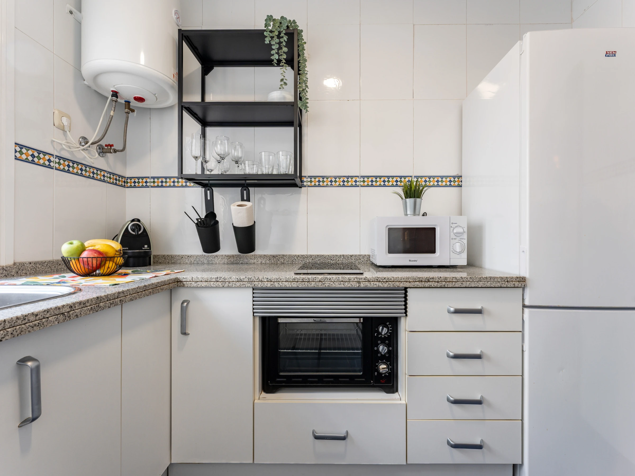 Dieses offene küche, mit ceranfeld, ist ausgestattet in kühlschrank, mikrowelle, gefrierschrank, geschirr/besteck, kochutensilien, kaffeemaschine, toaster, wasserkocher und saftpresse.