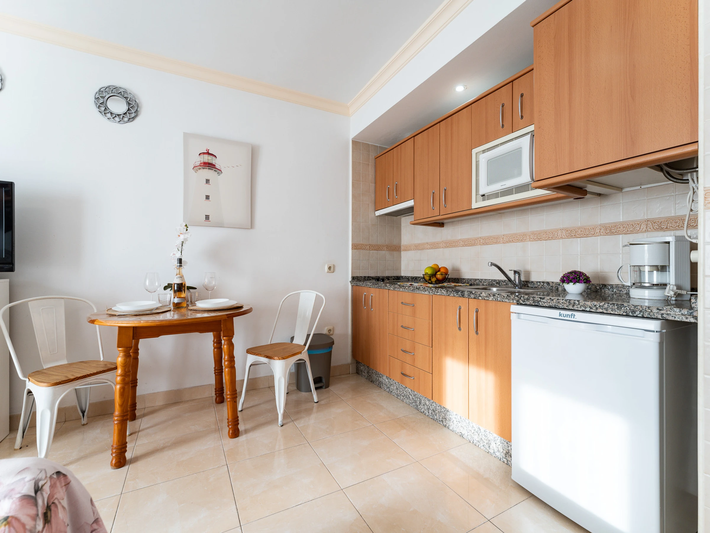 Dieses offene küche, mit ceranfeld, ist ausgestattet in kühlschrank, mikrowelle, gefrierschrank, geschirr/besteck, kochutensilien, kaffeemaschine, toaster, wasserkocher und saftpresse.