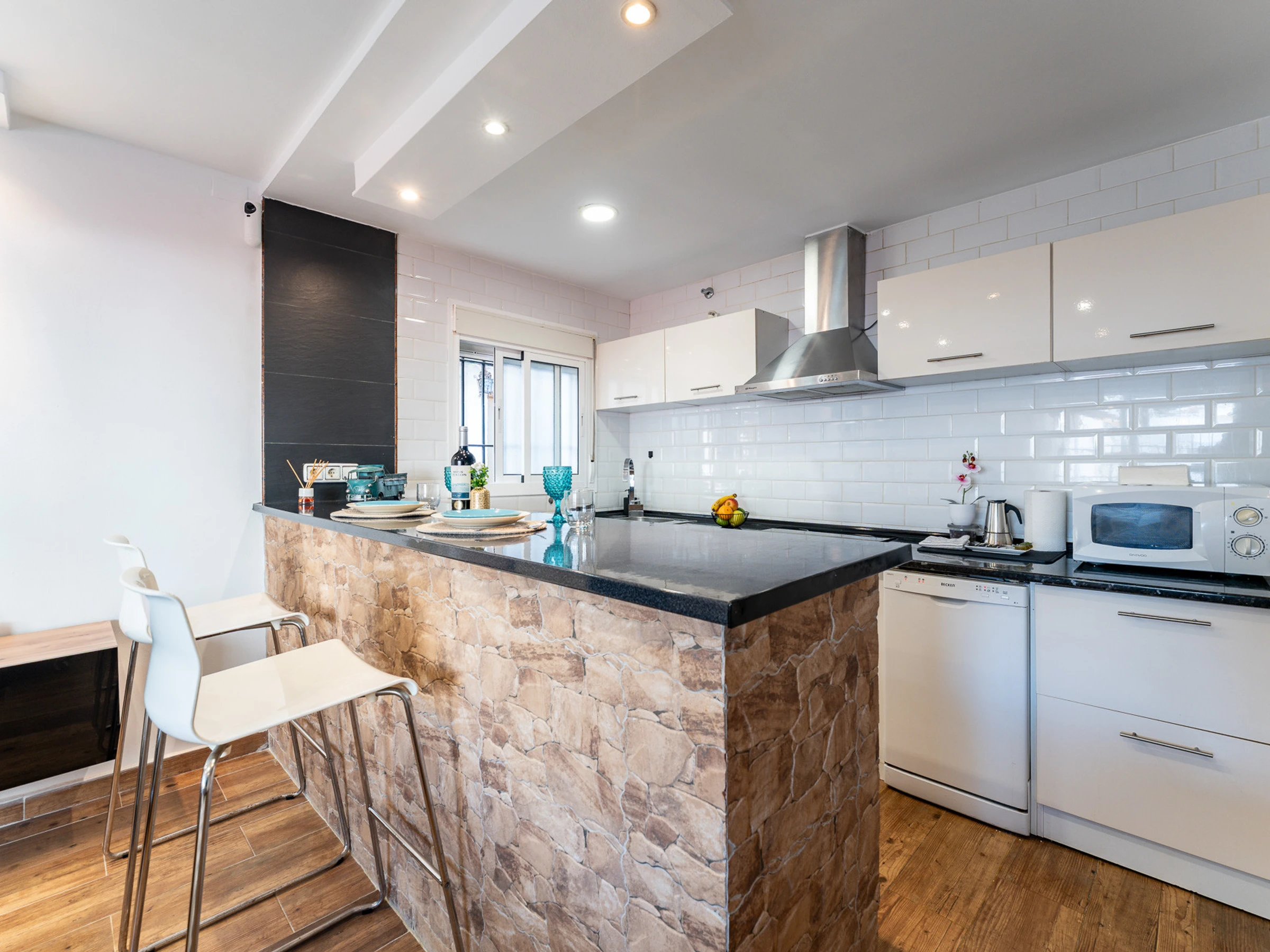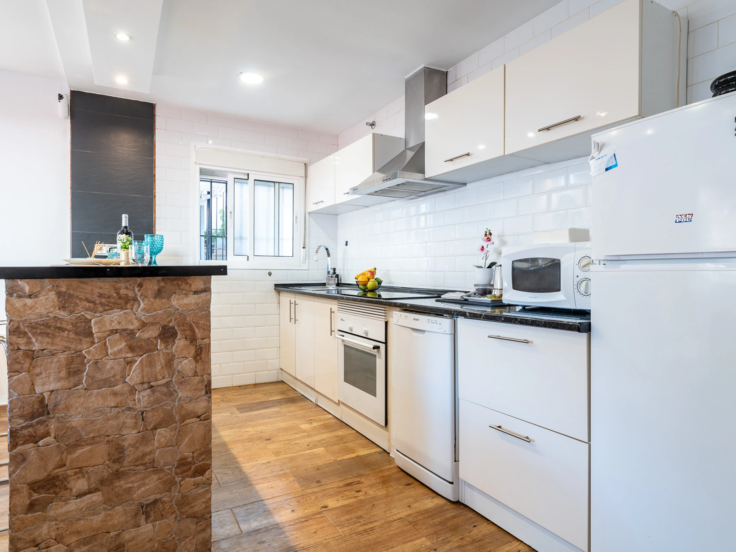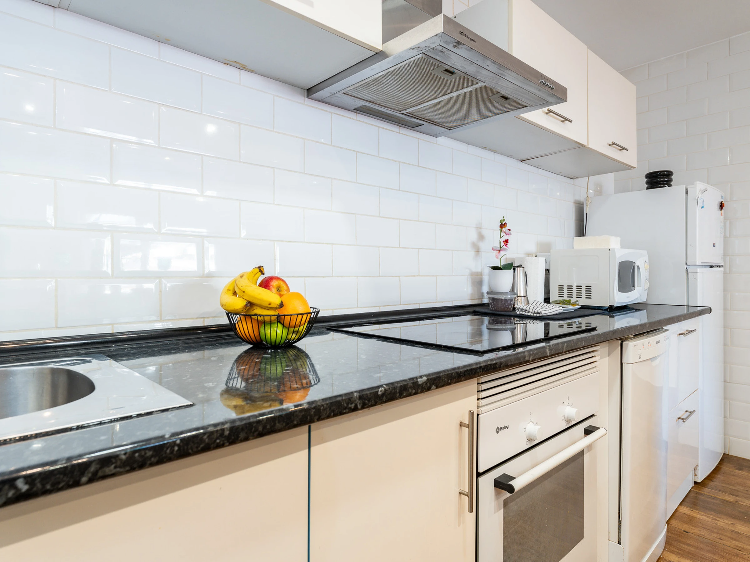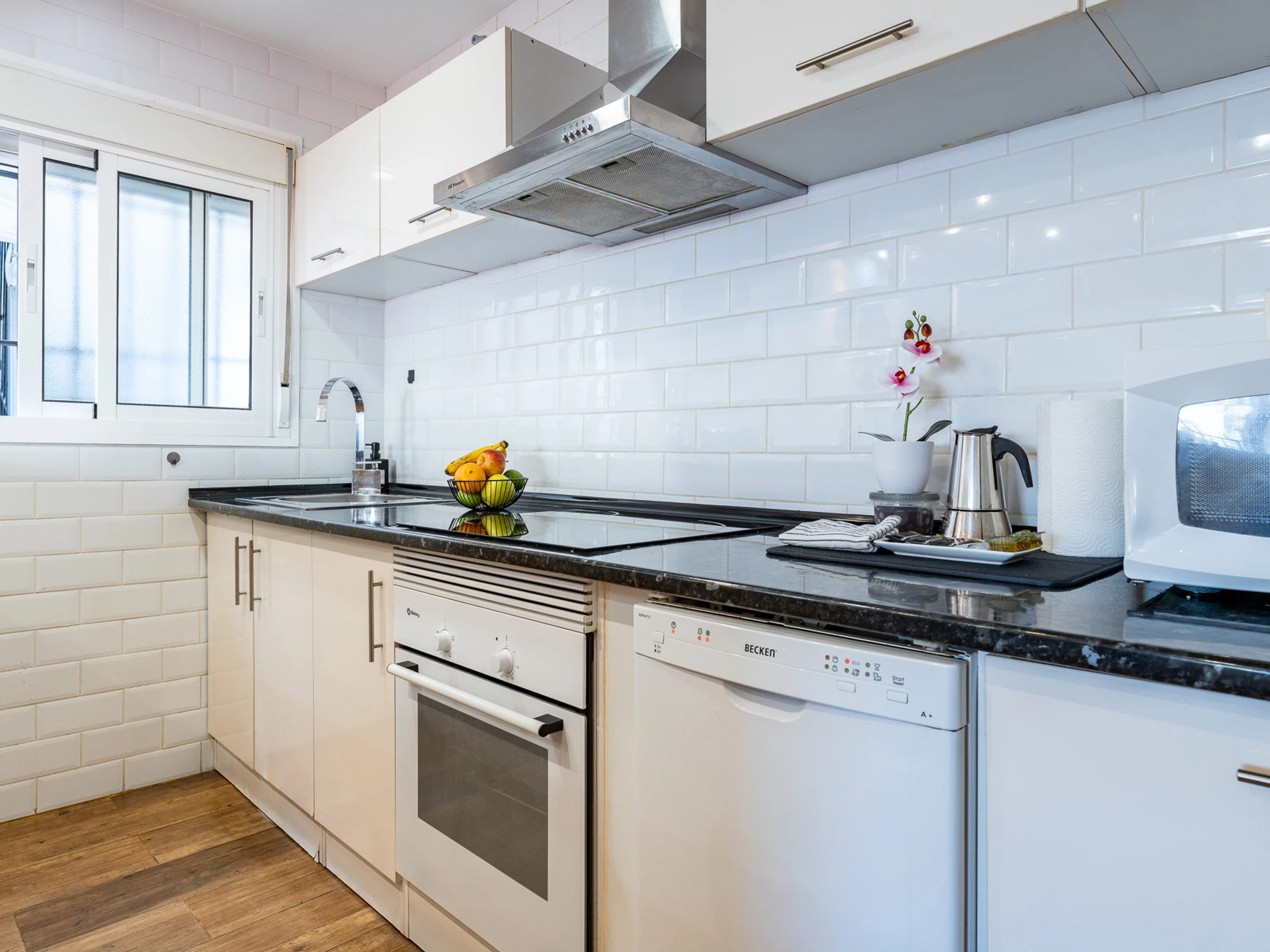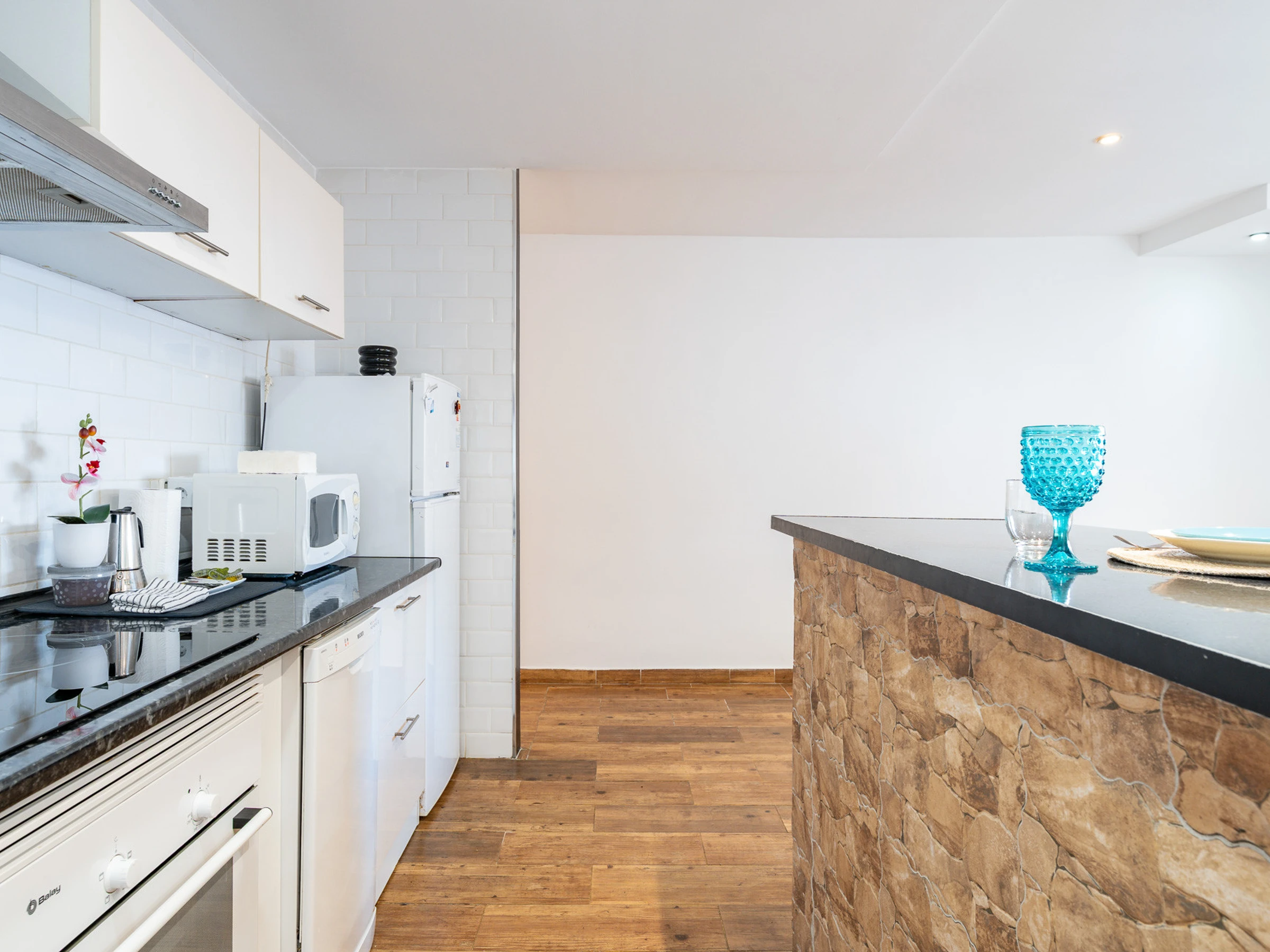 Dieses offene küche, mit ceranfeld, ist ausgestattet in kühlschrank, mikrowelle, backofen, gefrierschrank, spülmaschine, geschirr/besteck, kochutensilien, kaffeemaschine, toaster und wasserkocher.