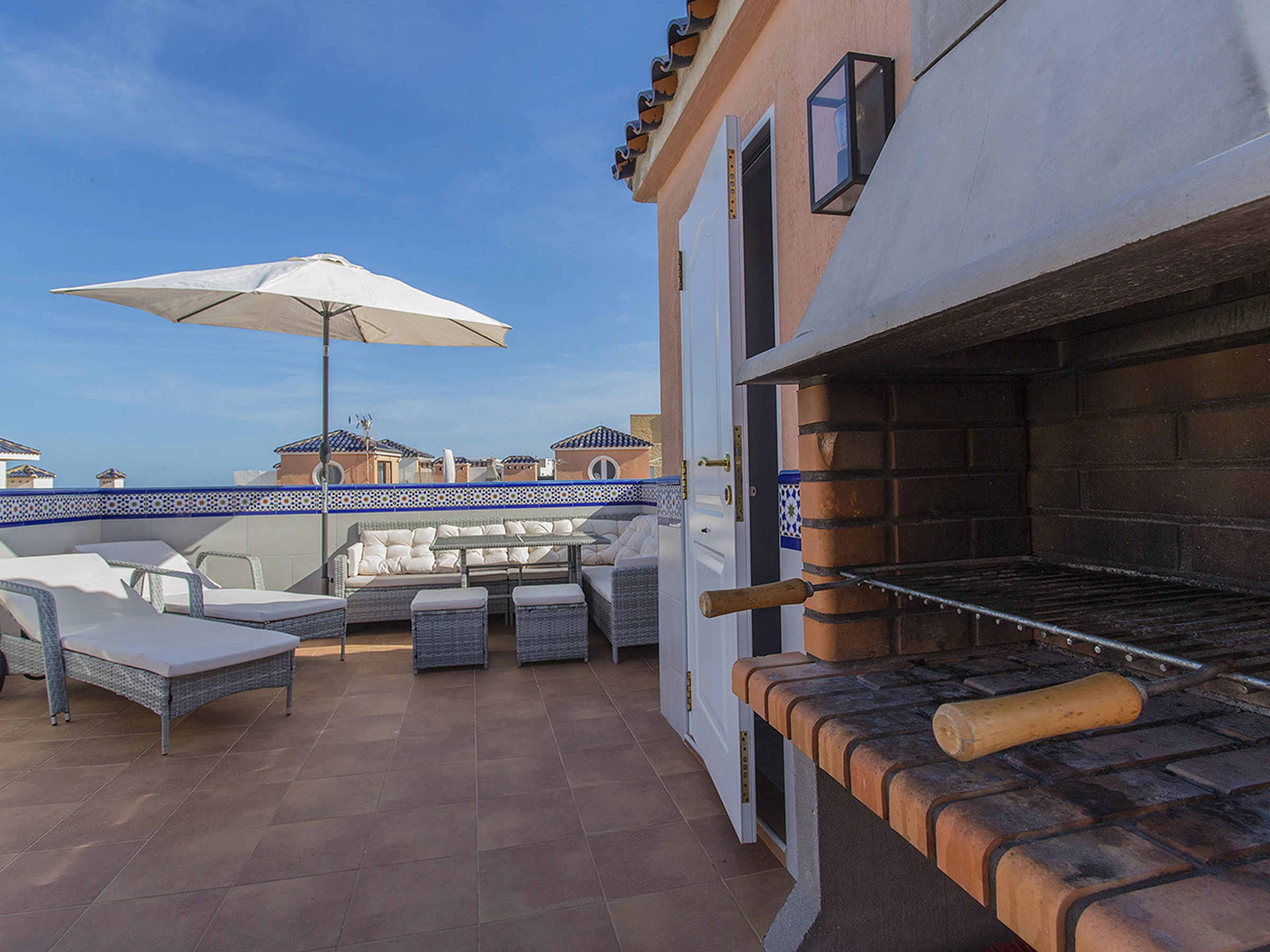 Die Terrasse befindet sich ebenfalls auf dem Dach und hat einen Bereich mit Stühlen, Liegen und einem kleinen Tisch, von wo aus man auf das Meer blicken kann.