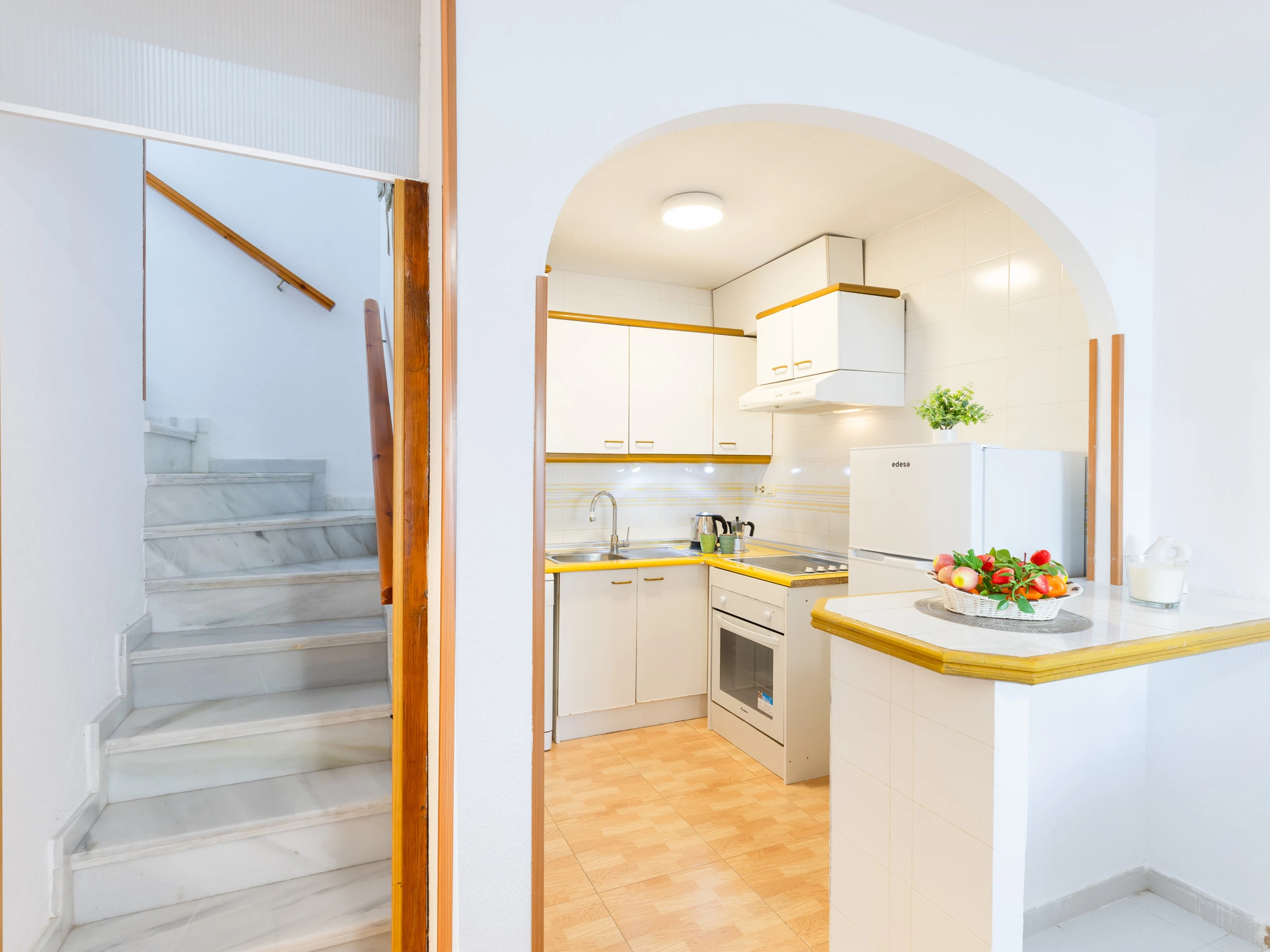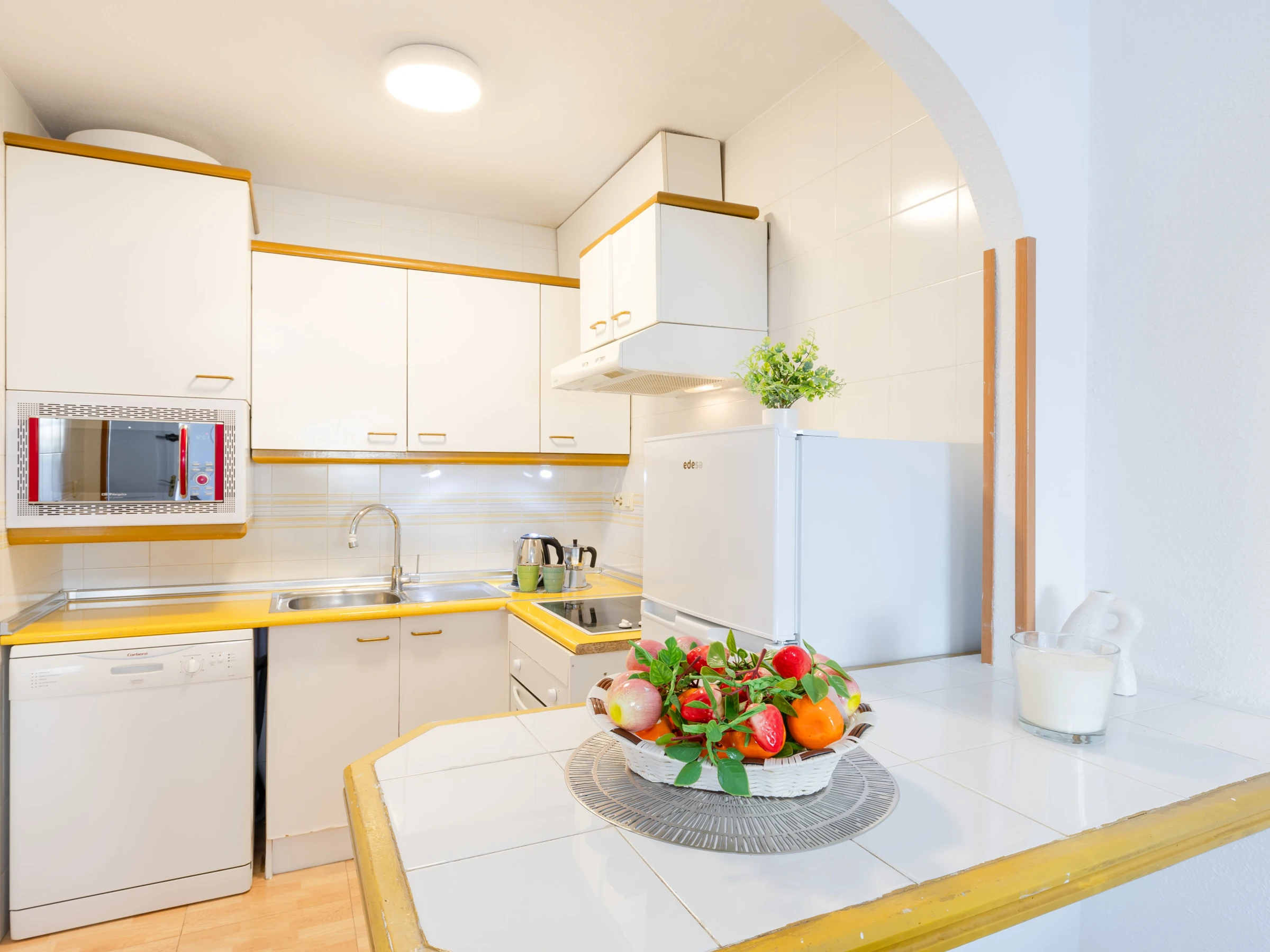 Dieses offene küche, mit ceranfeld, ist ausgestattet in kühlschrank, mikrowelle, backofen, gefrierschrank, spülmaschine, geschirr/besteck, kochutensilien, kaffeemaschine, toaster, wasserkocher, saftpresse, küchengeschirr, teller und schüsseln.