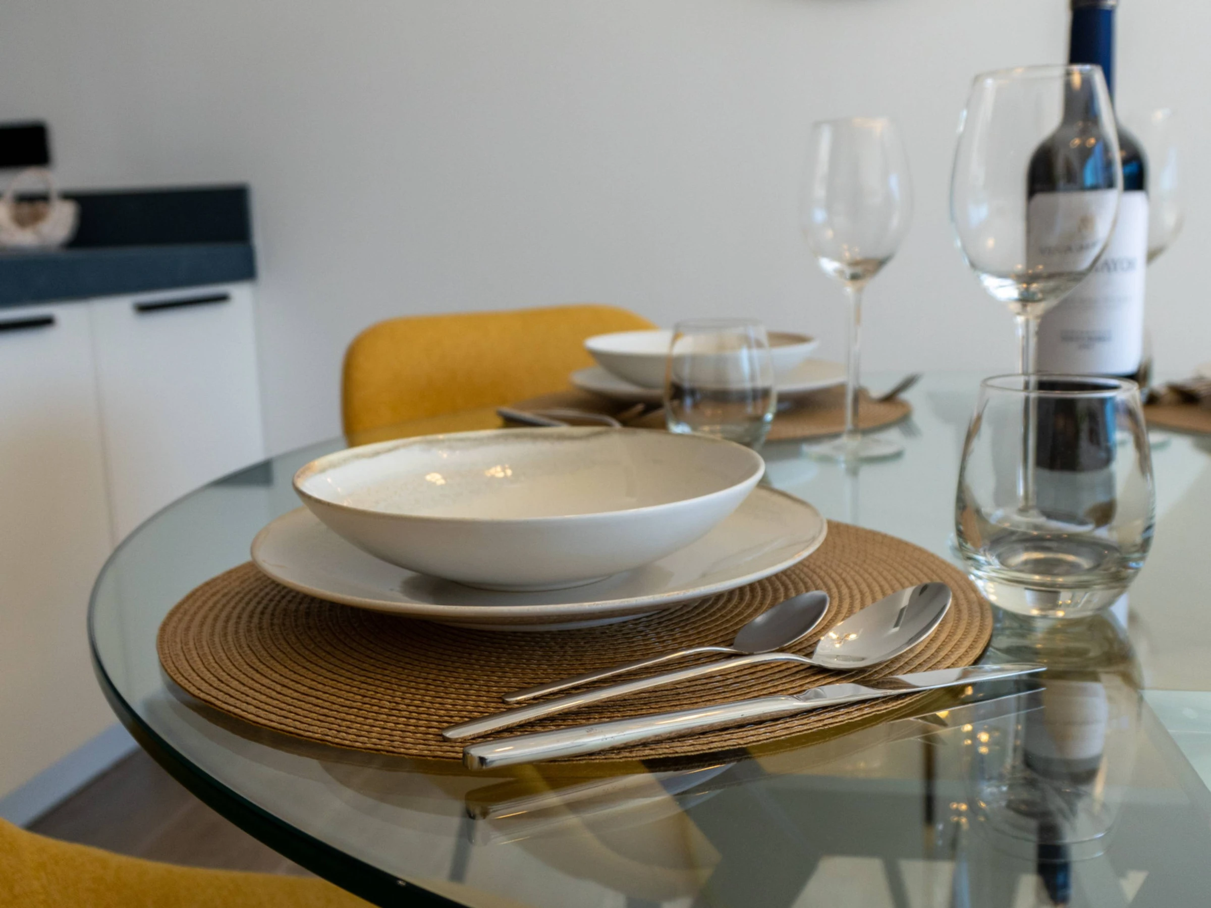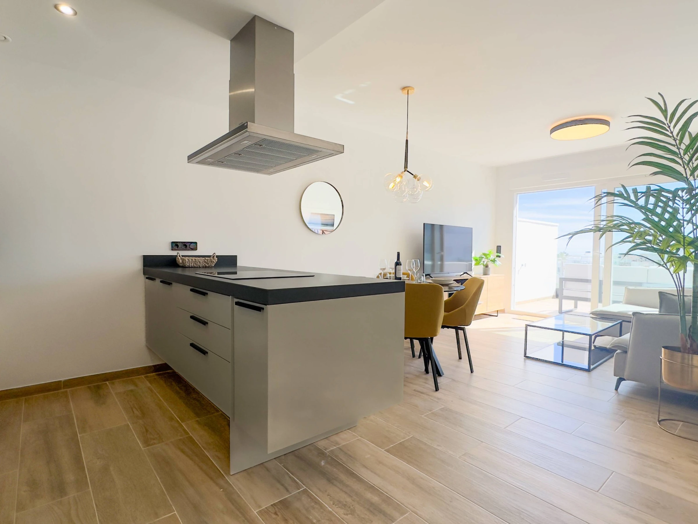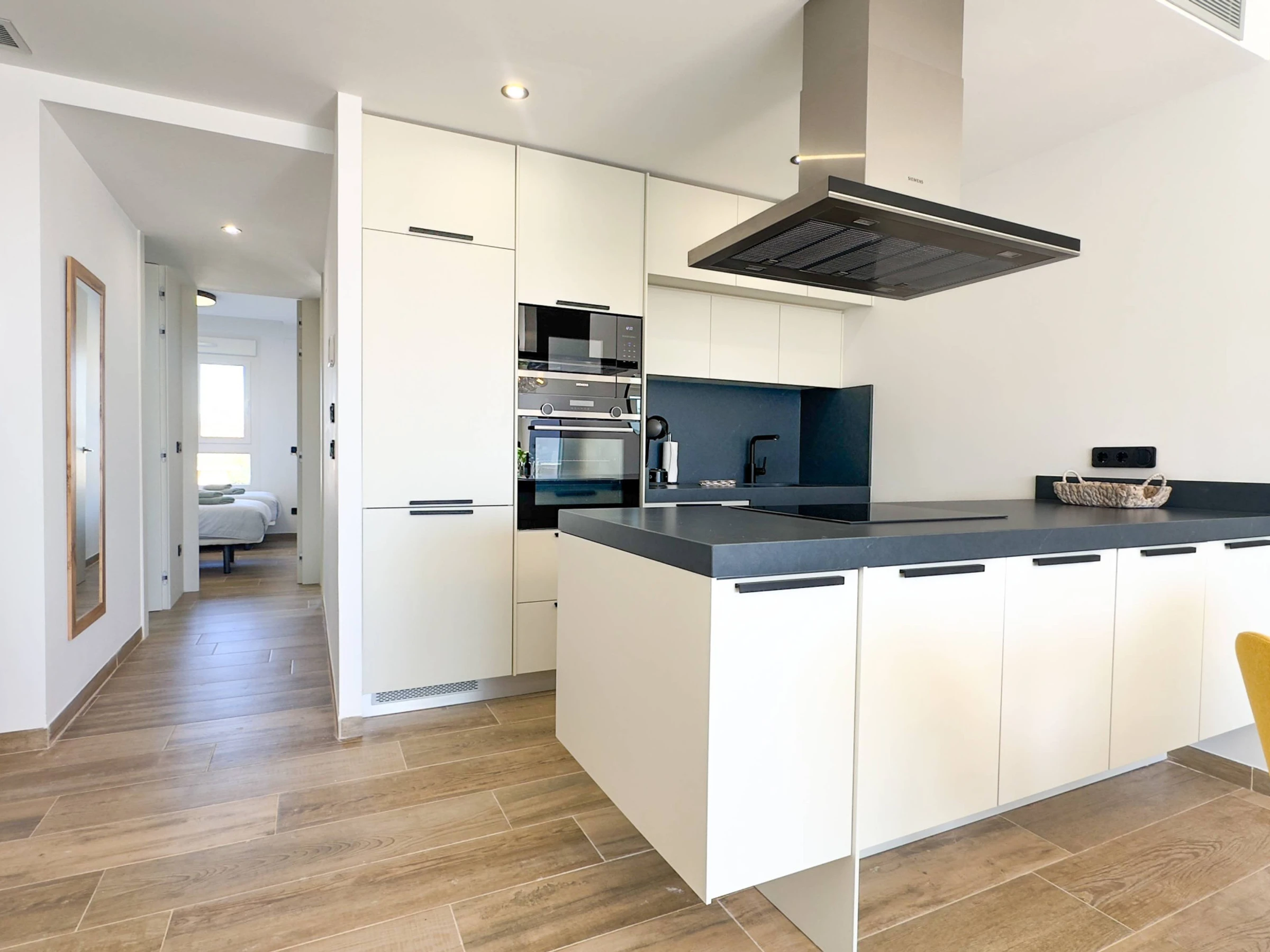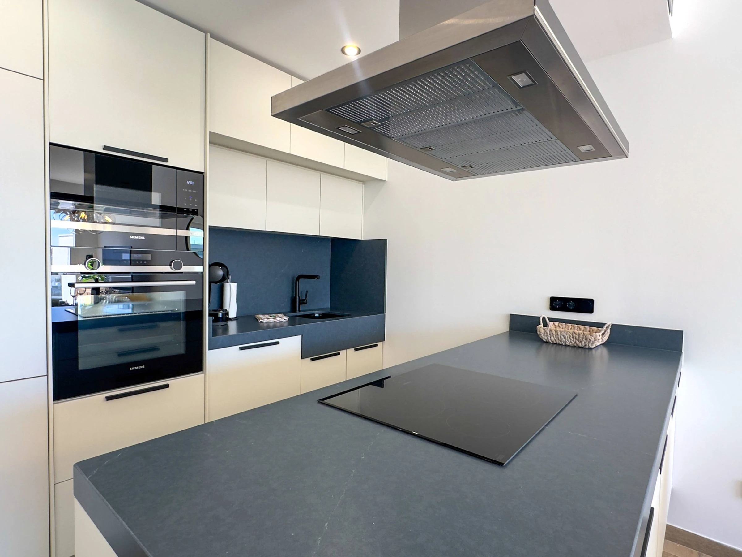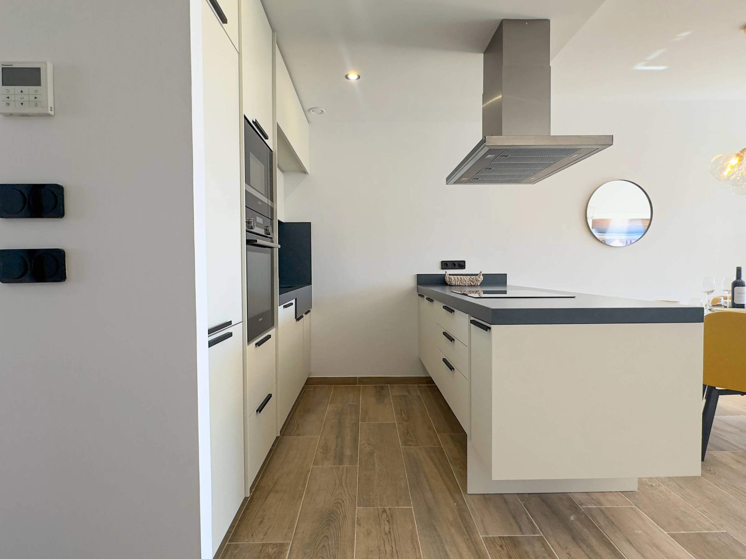 Dieses offene küche, mit ceranfeld, ist ausgestattet in kühlschrank, mikrowelle, backofen, gefrierschrank, spülmaschine, geschirr/besteck, kochutensilien, kaffeemaschine, toaster, wasserkocher und saftpresse.