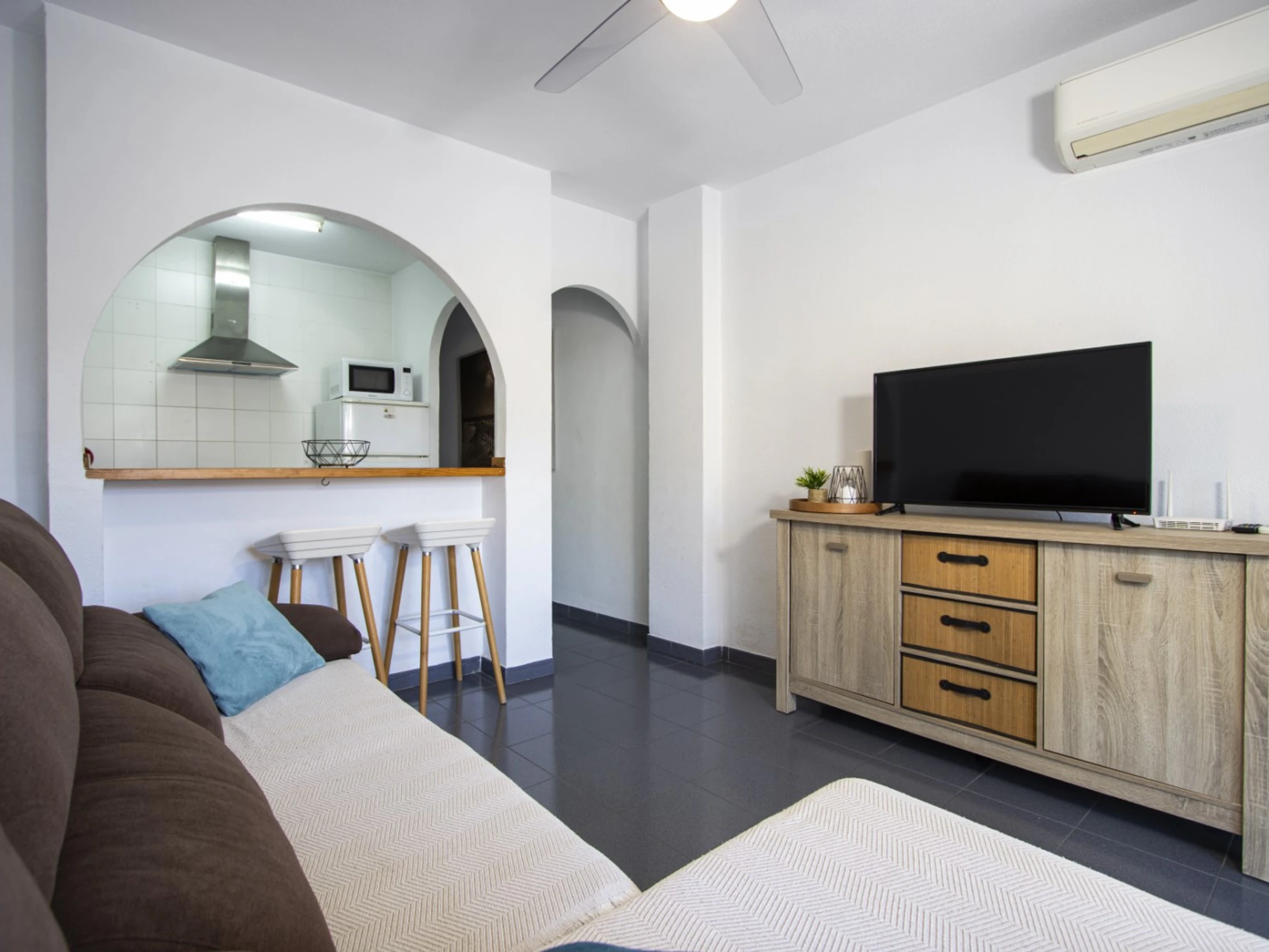 Eine gemütliche Ein-Zimmer-Wohnung zu vermieten, nur wenige Gehminuten vom beliebten Stadtpark „Garten der Nationen“ entfernt! Die Wohnung hat eine Fläche von 43 m2 und besteht aus einem Wohnzimmer, einem Schlafzimmer, einer französischen Küche, einem Badezimmer und einem Balkon. Es ist alles vorhanden, was zum Wohnen und Entspannen notwendig ist: Möbel, Elektrohaushaltsgeräte, Geschirr, Bettwäsche und Handtücher. Im Salon ist eine Klimaanlage installiert. Spanisches Fernsehen. In der Tiefgarage gibt es einen Parkplatz. Der großzügige Balkon ist mit Sommermöbeln ausgestattet. Das Gebiet verfügt über eine gut ausgebaute Infrastruktur. In den benachbarten Straßen gibt es viele gemütliche Bars. Der Supermarkt ist ca. 350 Meter entfernt, die Geldautomaten sind maximal 150 Meter entfernt. Der Stadtpark „Garten der Nationen“ mit Springbrunnen und einem wunderschönen Kinderspielplatz ist ca. 100 Meter entfernt! Das Meer und der größte Stadtstrand „Los Naufragos“ sind ca. 900 Meter entfernt. Unterkunftsmöglichkeit - bis zu 3 Personen (keine Tiere!). Rauchen ist nur auf dem Balkon gestattet! Die Miete für ein Babybett und einen Hochstuhl kostet 20 Euro pro Aufenthalt.