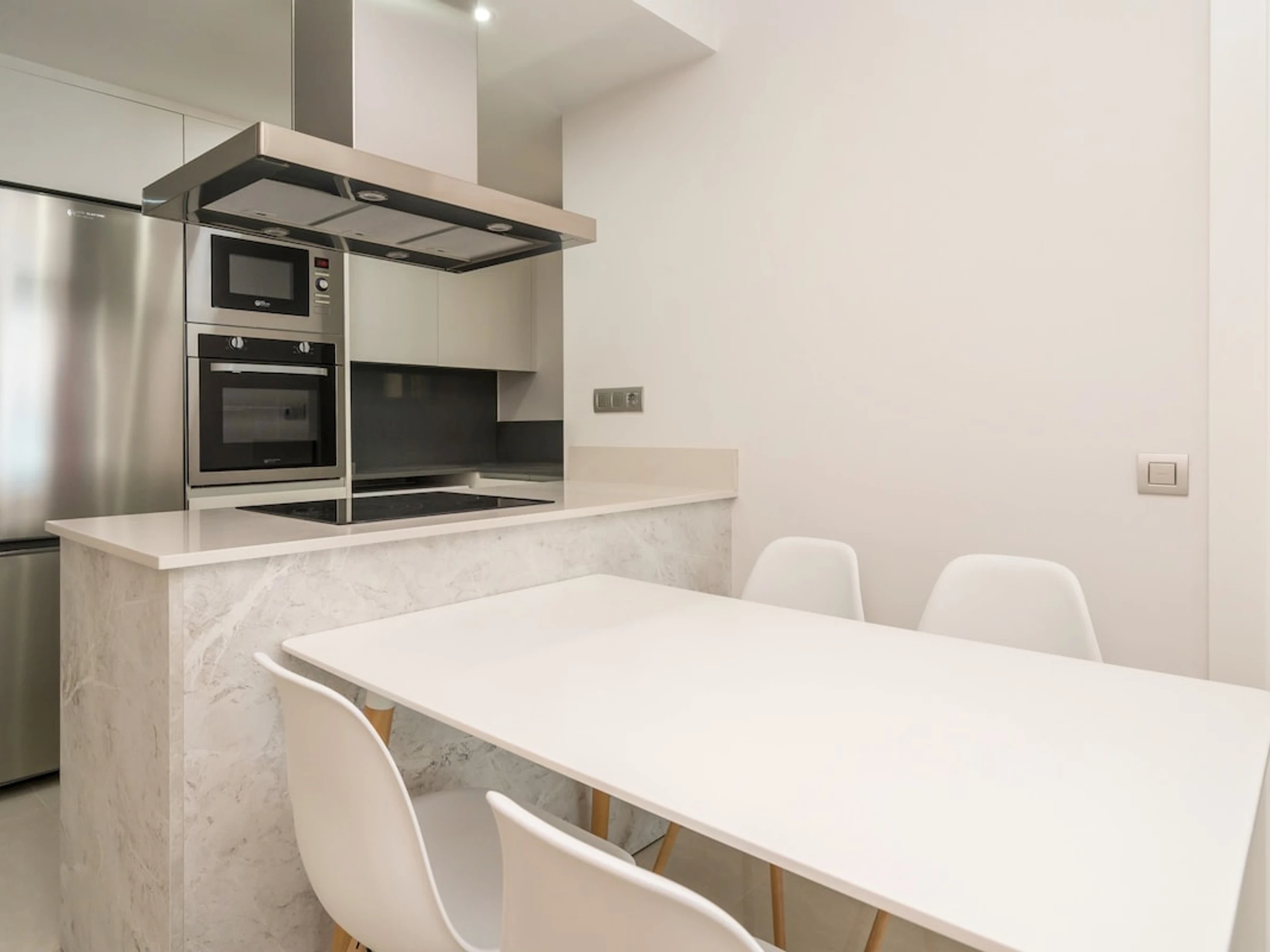 Dieses offene küche, mit ceranfeld, ist ausgestattet in kühlschrank, mikrowelle, backofen, gefrierschrank, spülmaschine, geschirr/besteck, kochutensilien, kaffeemaschine, toaster und wasserkocher.