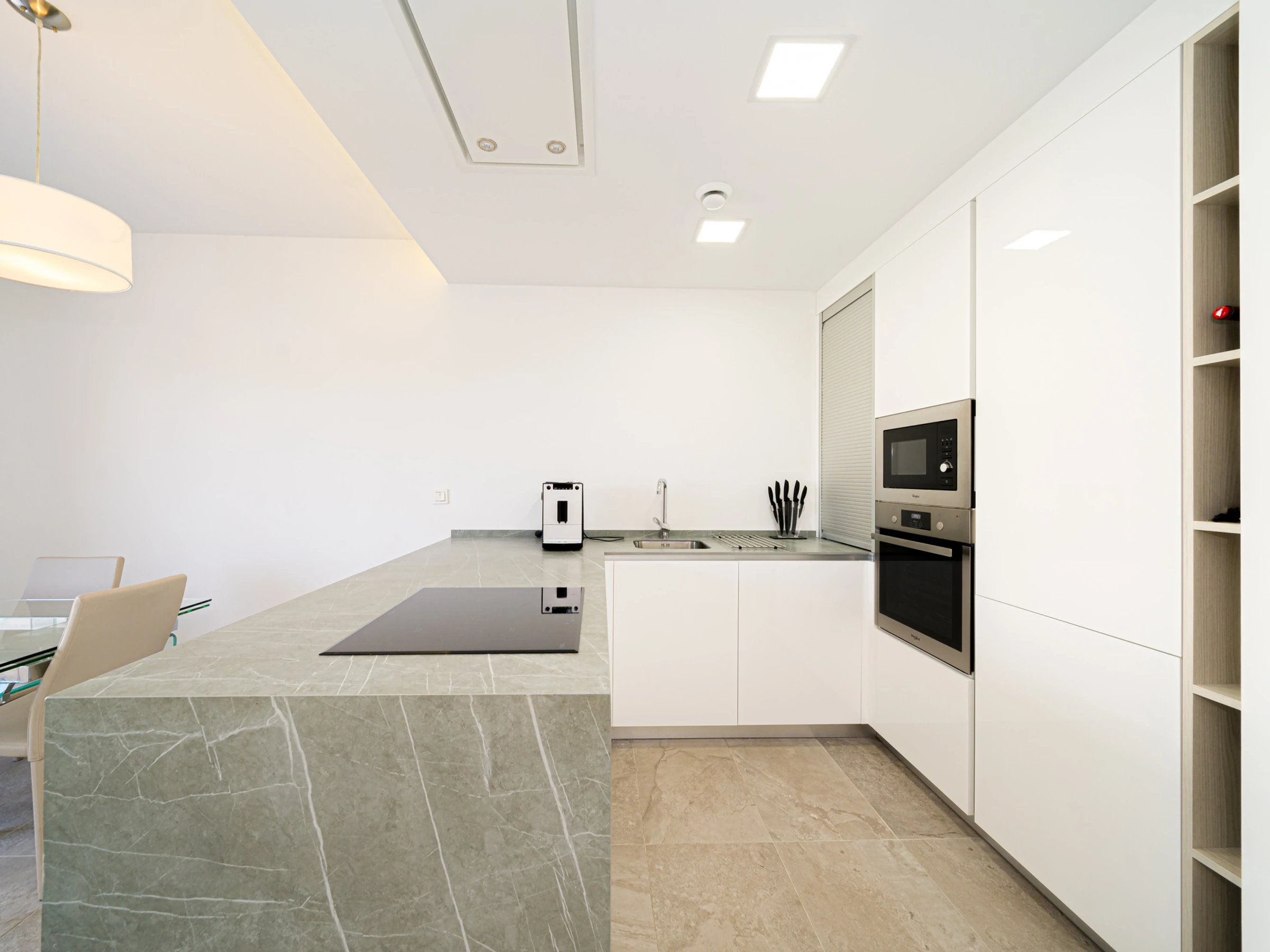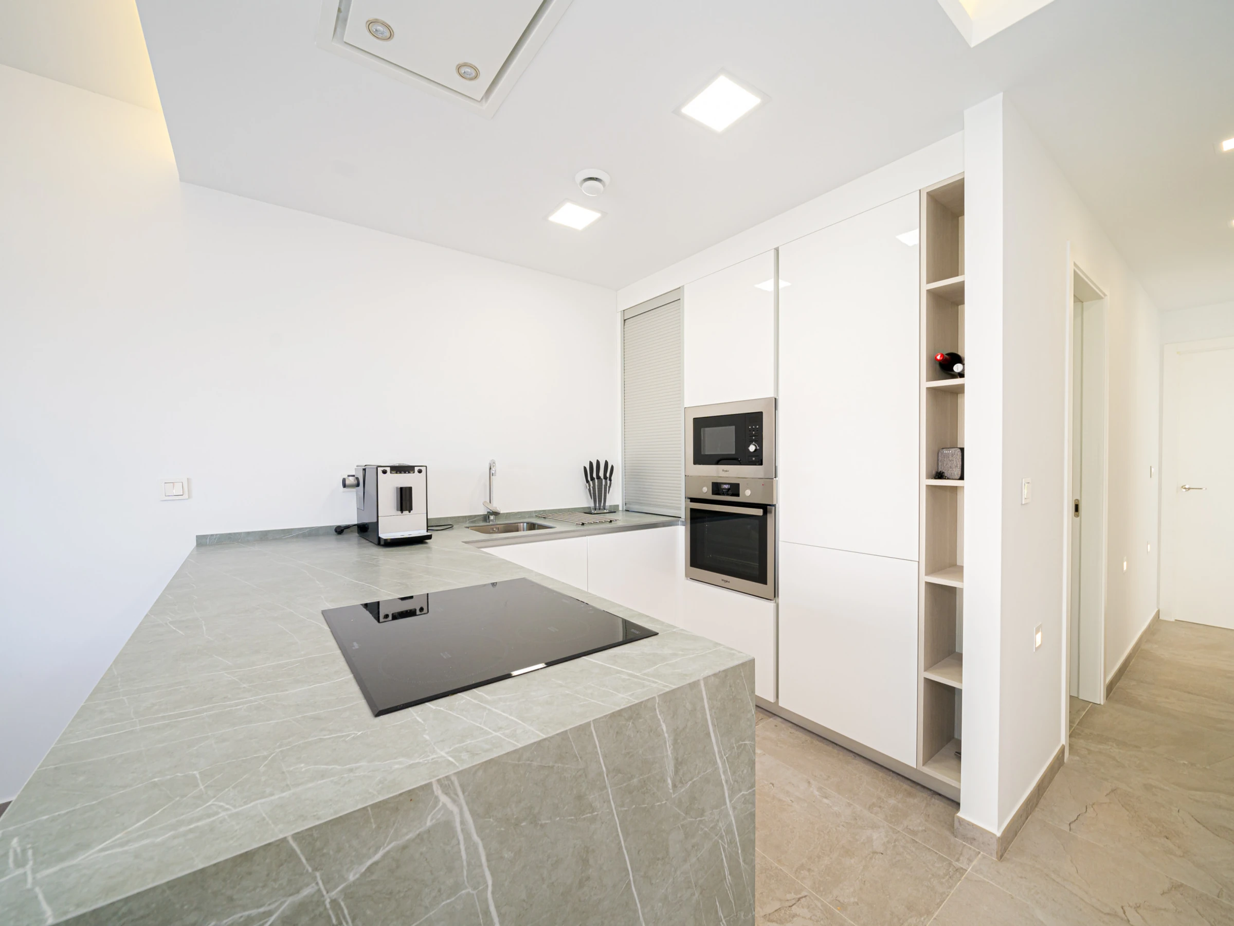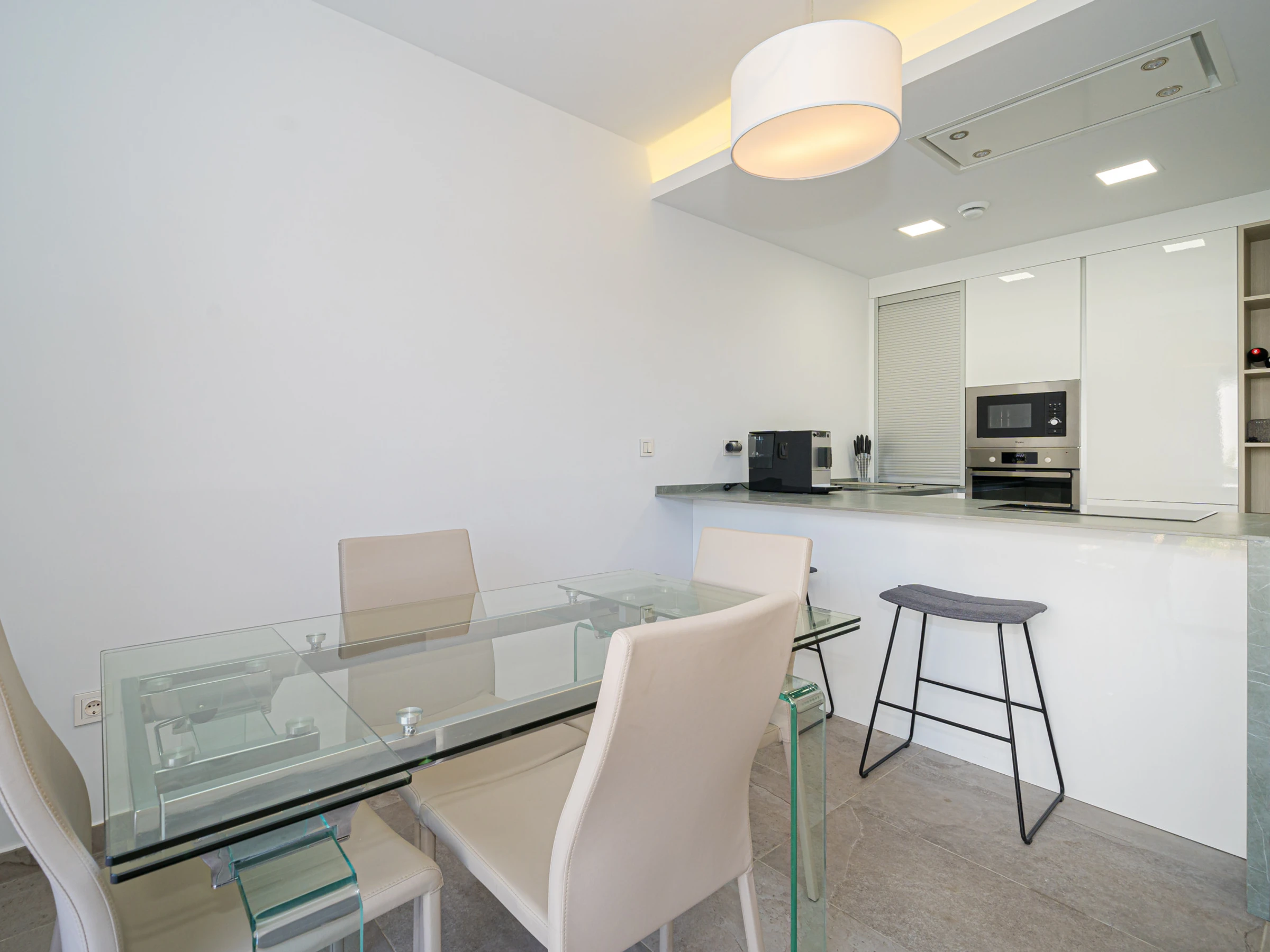 Dieses offene küche, mit ceranfeld, ist ausgestattet in kühlschrank, mikrowelle, backofen, gefrierschrank, spülmaschine, geschirr/besteck, kochutensilien, kaffeemaschine, toaster und wasserkocher.