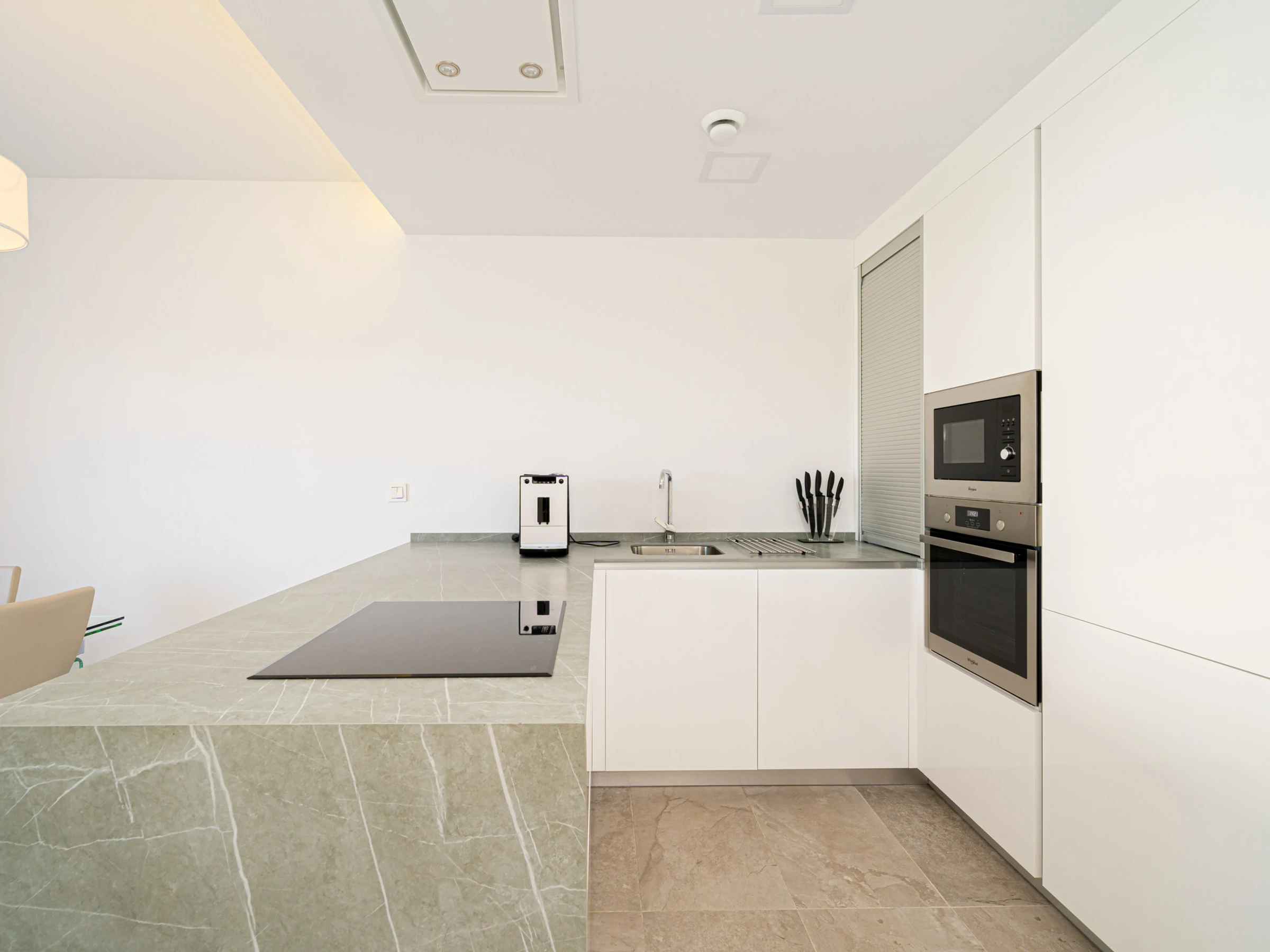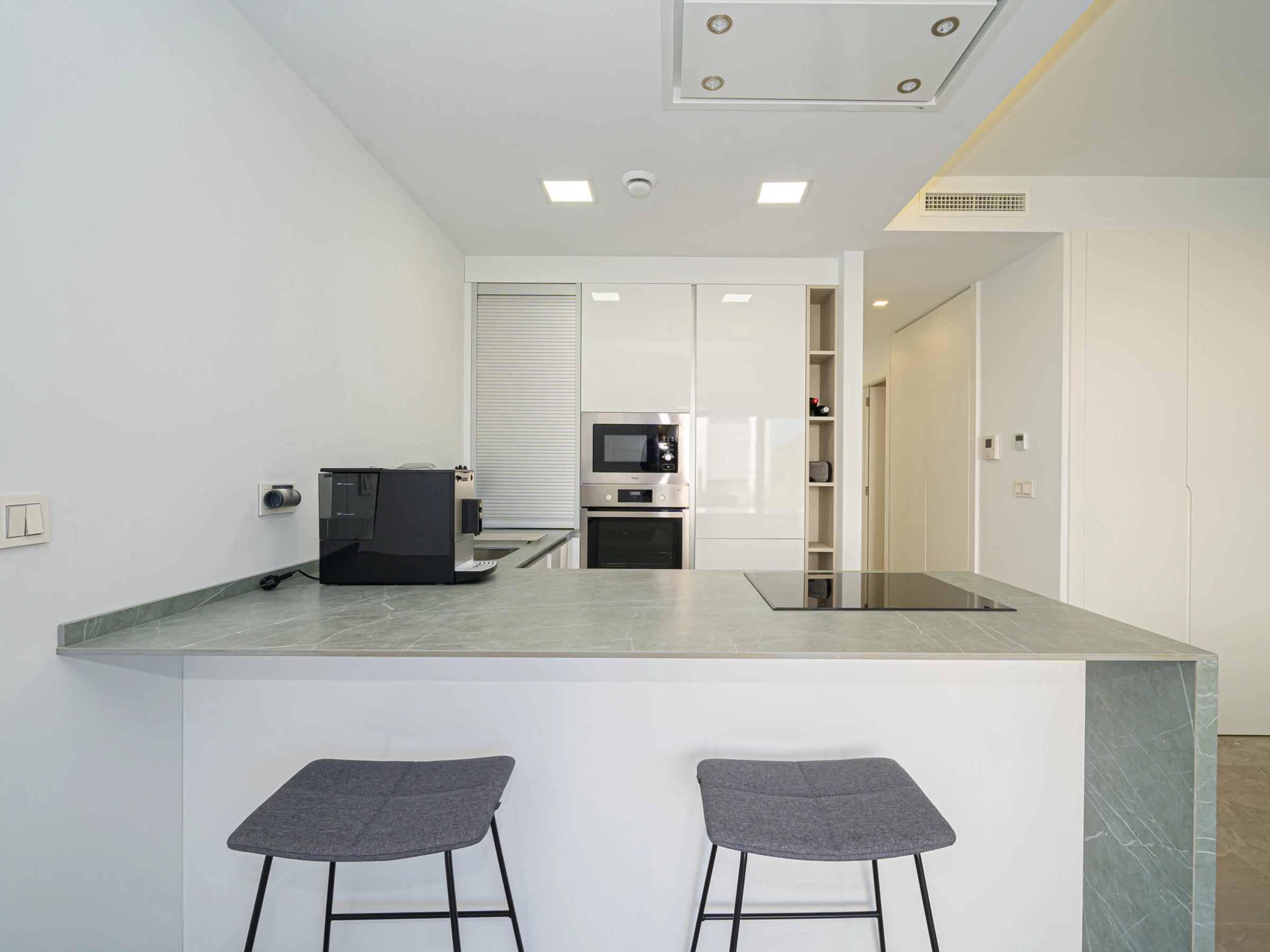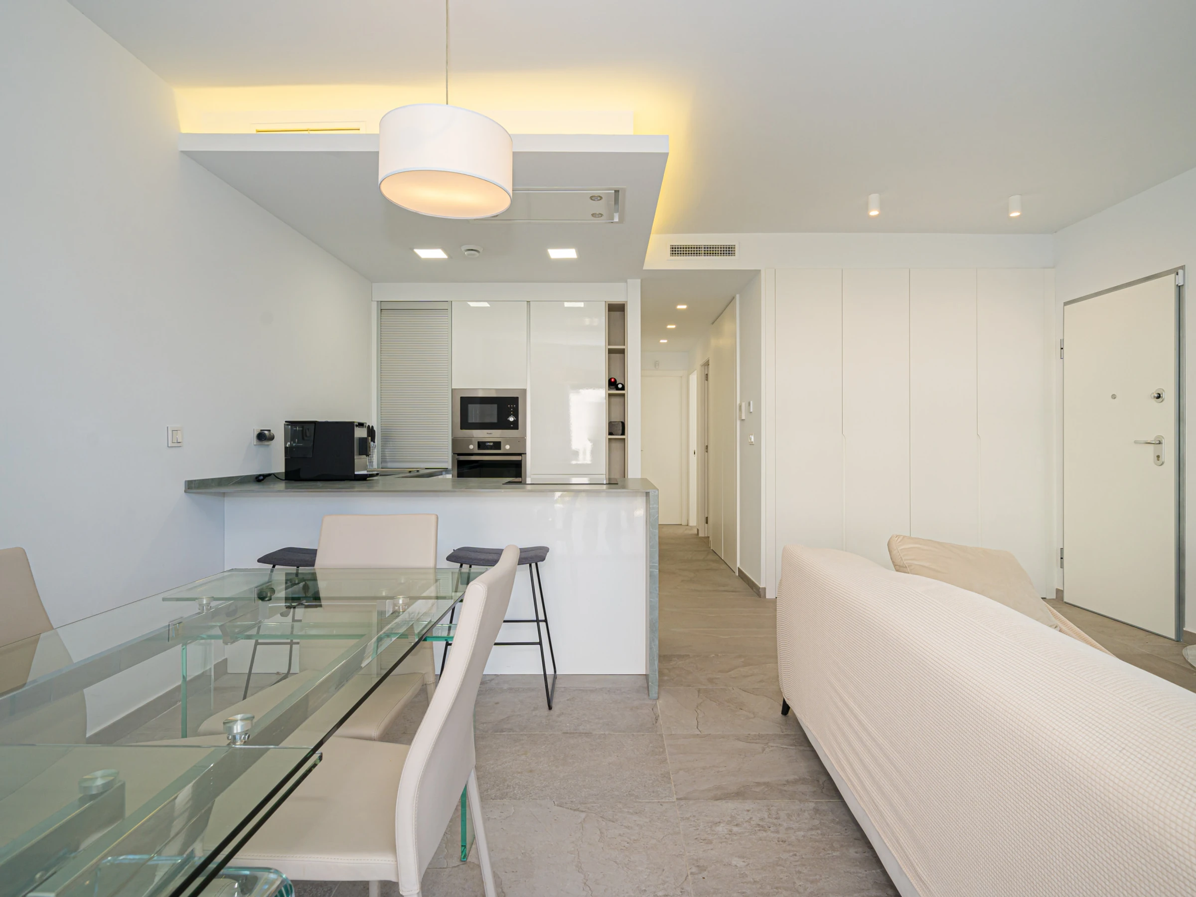 Dieses offene küche, mit ceranfeld, ist ausgestattet in kühlschrank, mikrowelle, backofen, gefrierschrank, spülmaschine, geschirr/besteck, kochutensilien, kaffeemaschine, toaster und wasserkocher.