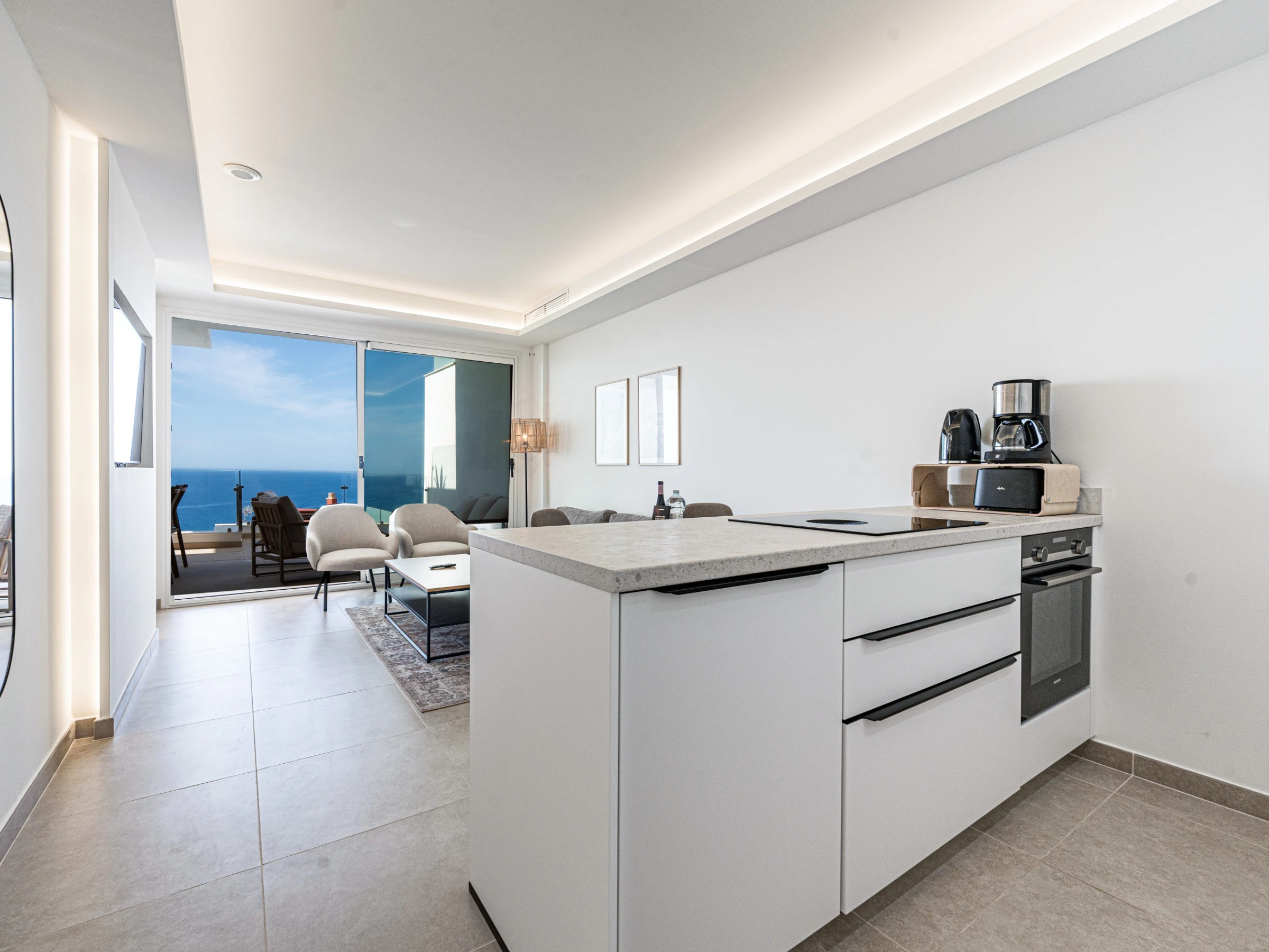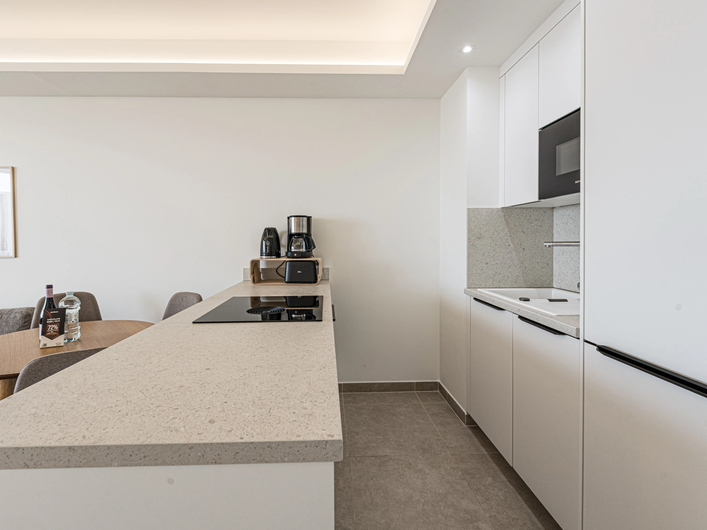 Die moderne offene Küche ist mit hochwertigen Geräten ausgestattet, darunter ein Geschirrspüler, ein Backofen, eine Mikrowelle und ein exklusives Kochfeld mit integriertem Bora-Dunstabzugssystem, das Design und Funktionalität auf höchstem Niveau vereint.