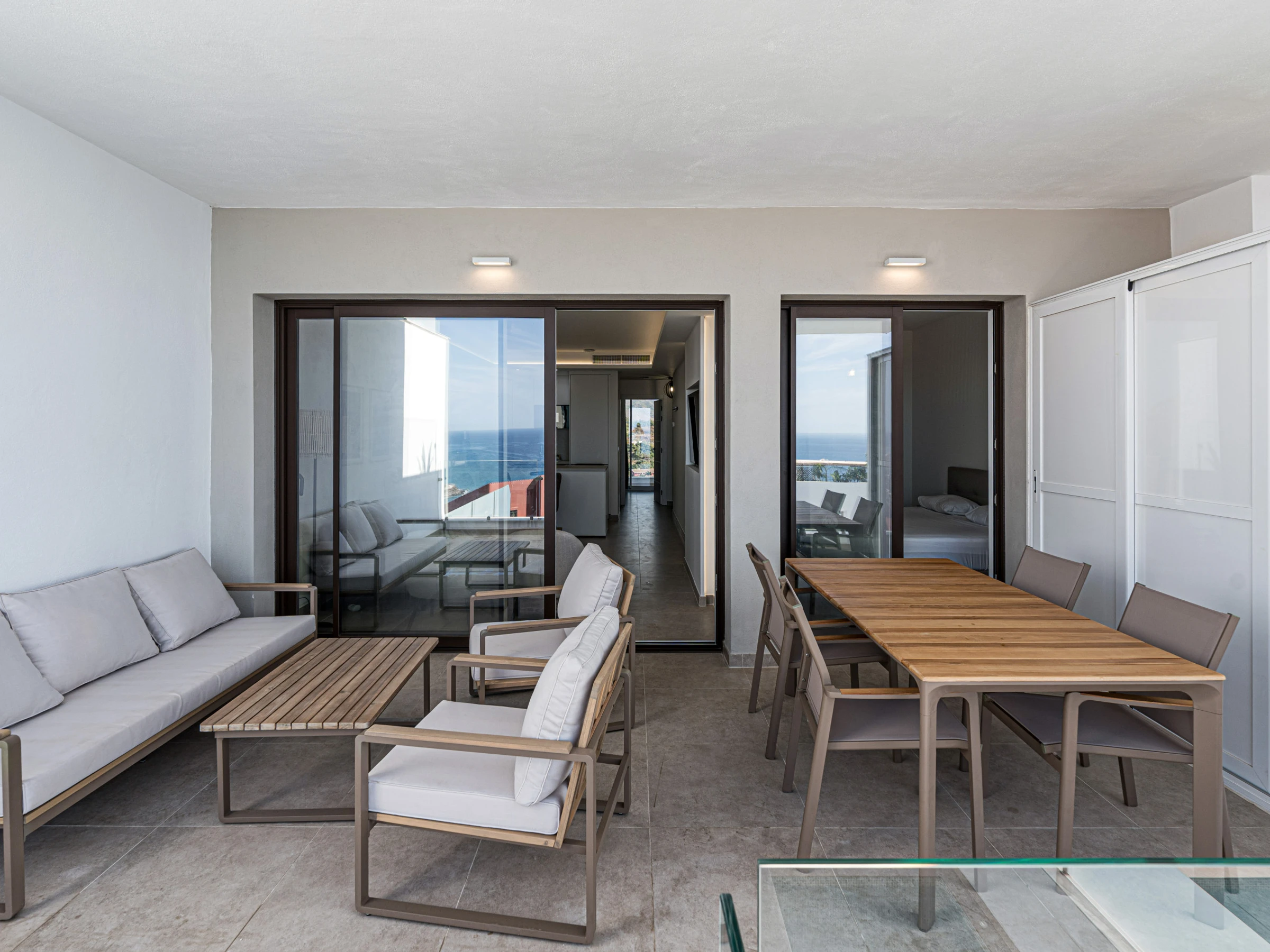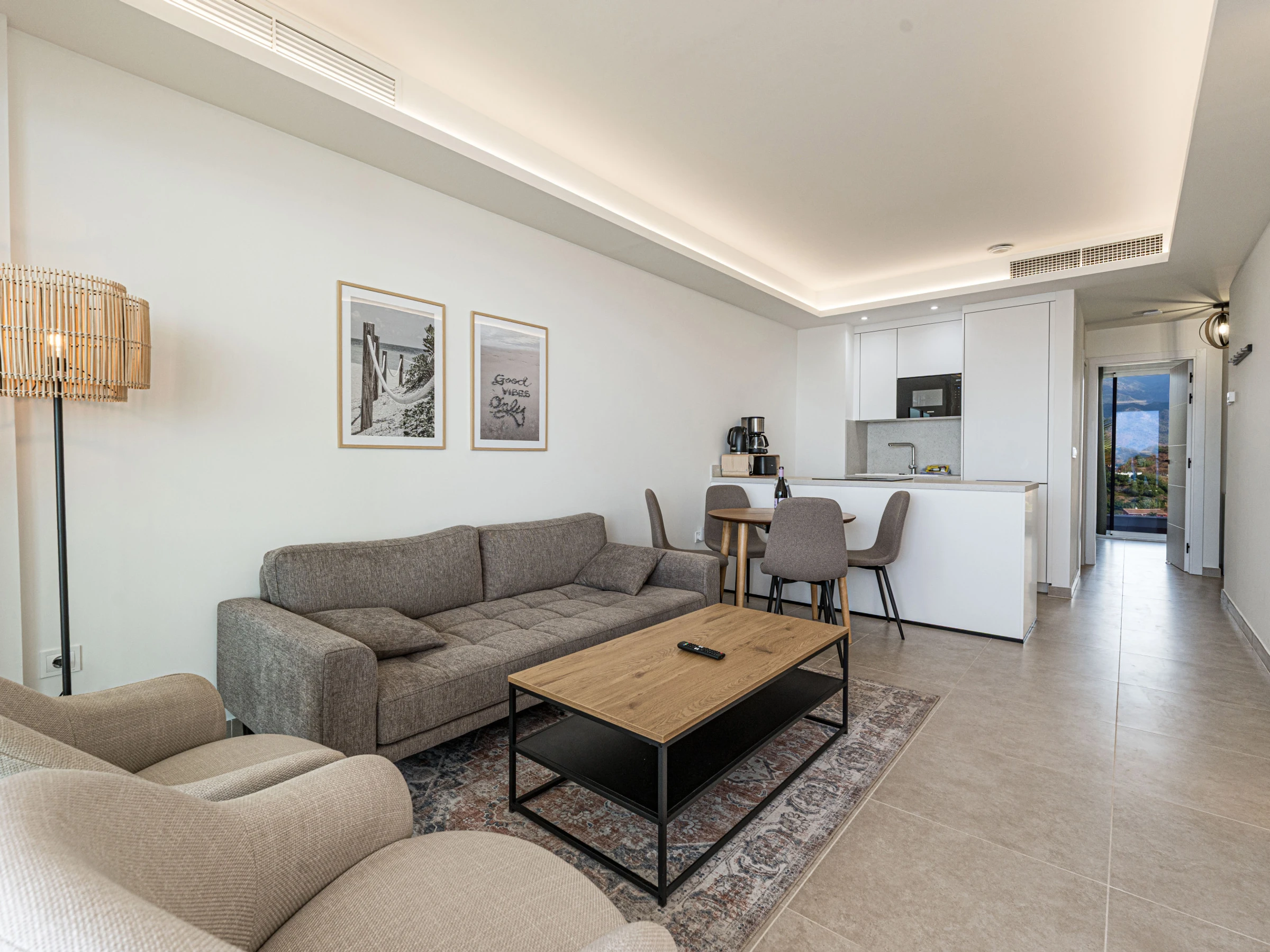 Das Wohnzimmer ist lichtdurchflutet und verfügt über eine Klimaanlage, einen Smart-TV, Highspeed-WLAN und direkten Zugang zu einer großzügigen privaten Terrasse.
