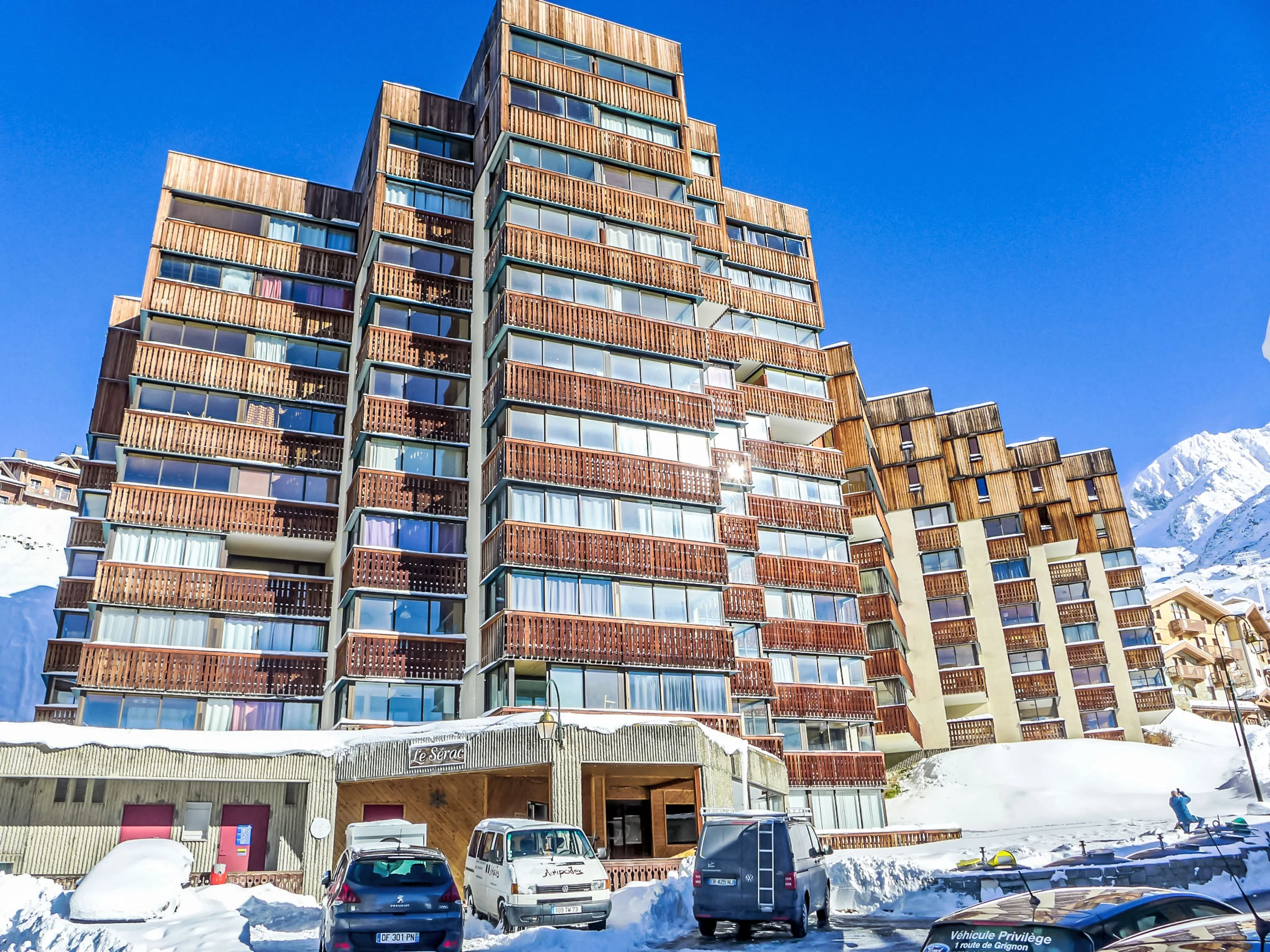 Einfache Residenz "Le Sérac", auf 10 Stockwerken. Oberhalb von Val Thorens, im Ortsteil Péclet, im Ortszentrum, 800 m vom See, 50 m vom Skigebiet. Im Hause: Wireless LAN (extra). Fahrstuhl, Skiraum, Zentralheizung. Im Winter bitte Schneeketten mitbringen. Öffentliches Parkhaus in 200 m, extra. Einkaufsgeschäft 100 m, Lebensmittelgeschäft 150 m, Supermarkt 150 m, Einkaufszentrum 100 m, Restaurant 50 m, Bar 250 m, Bäckerei 150 m, Café 50 m, Fußgängerzone 100 m, Zentrum zu Fuss in 5 Minuten erreichbar, Bushaltestelle "Navette Gratuit" 100 m. Skisportanlagen 100 m, Skipisten 50 m, Skiverleih, Skibushaltestelle, Skischule 150 m, Ski-Kindergarten 50 m, Eisfeld, Kinderspielplatz. Bekannte Skigebiete sind gut erreichbar: 3 Vallées. Bekannte Seen in der Umgebung sind gut erreichbar: Lac du lou 1 km, Lac Du menuieres 800 m. Bitte beachten: Animation in der Saison. Der Besitzer akzeptiert keine Gruppen. Bei guter Schneelage Zufahrt mit den Skiern bis zum Haus.