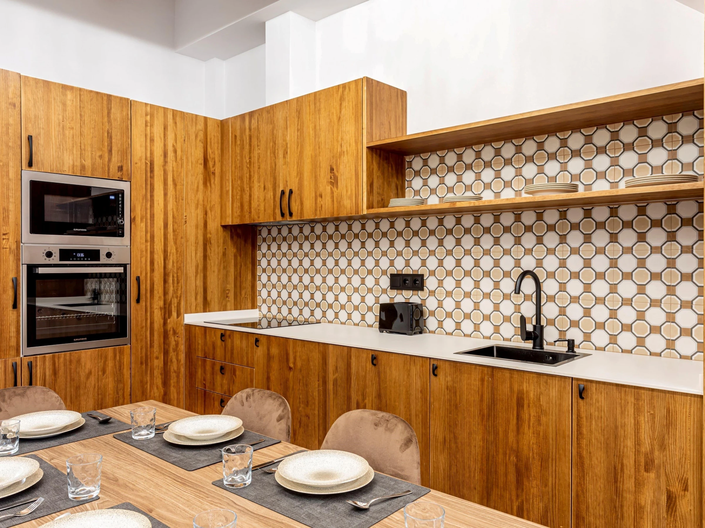 Dieses küche, ist ausgestattet in kühlschrank, mikrowelle, backofen, gefrierschrank, spülmaschine, kaffeemaschine und toaster.