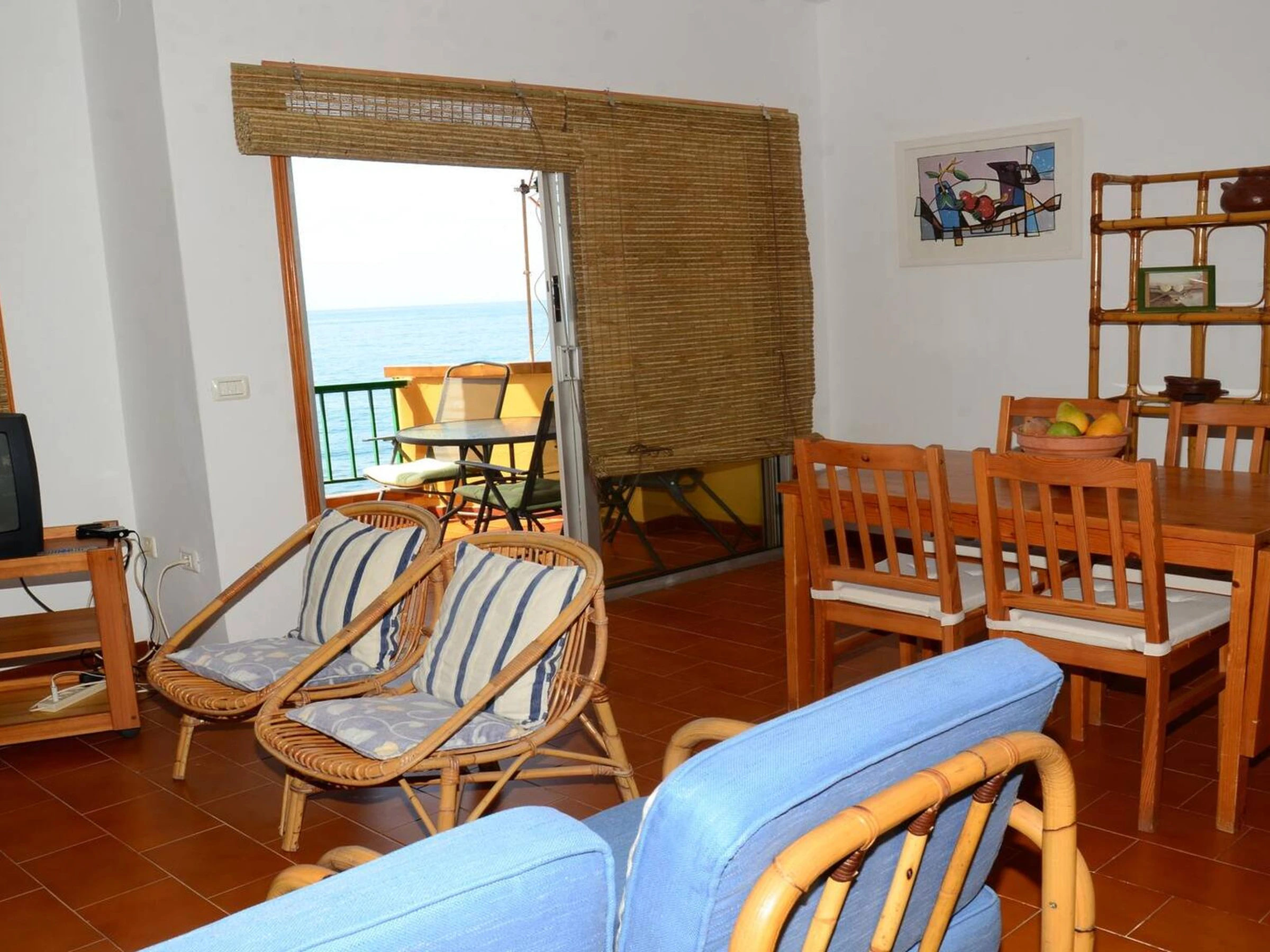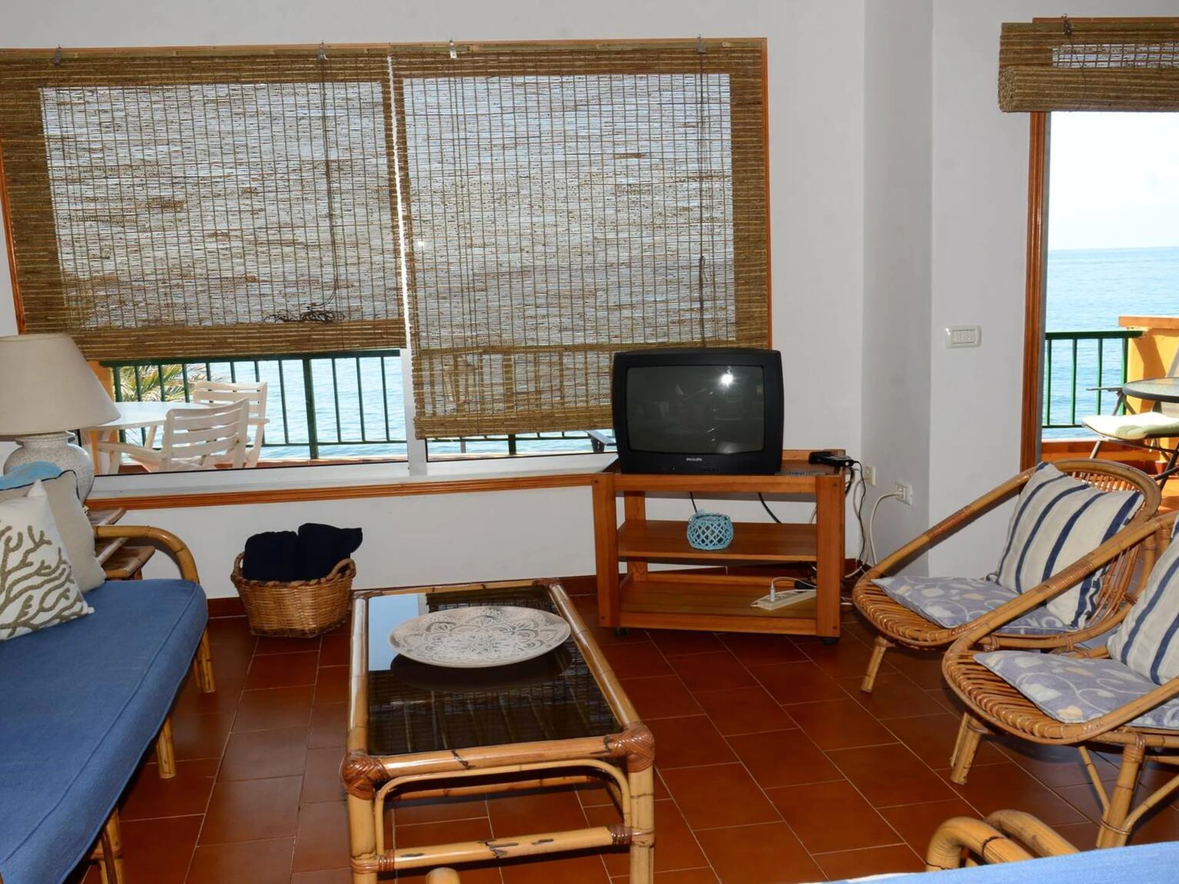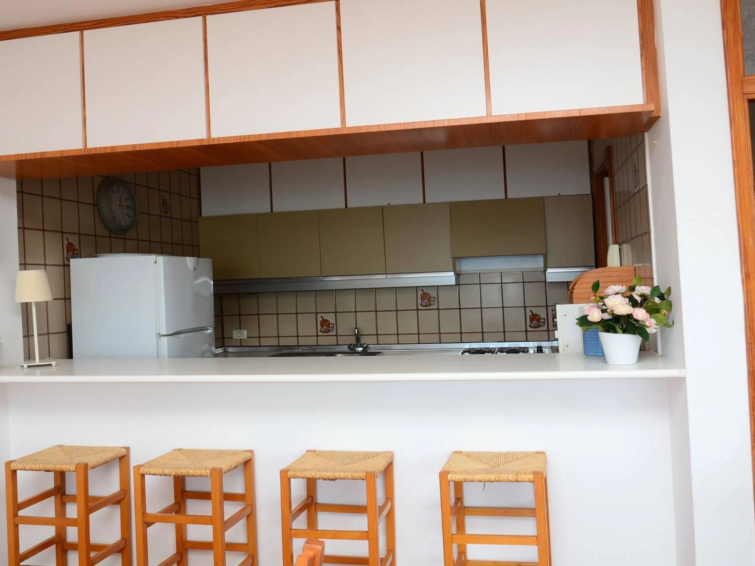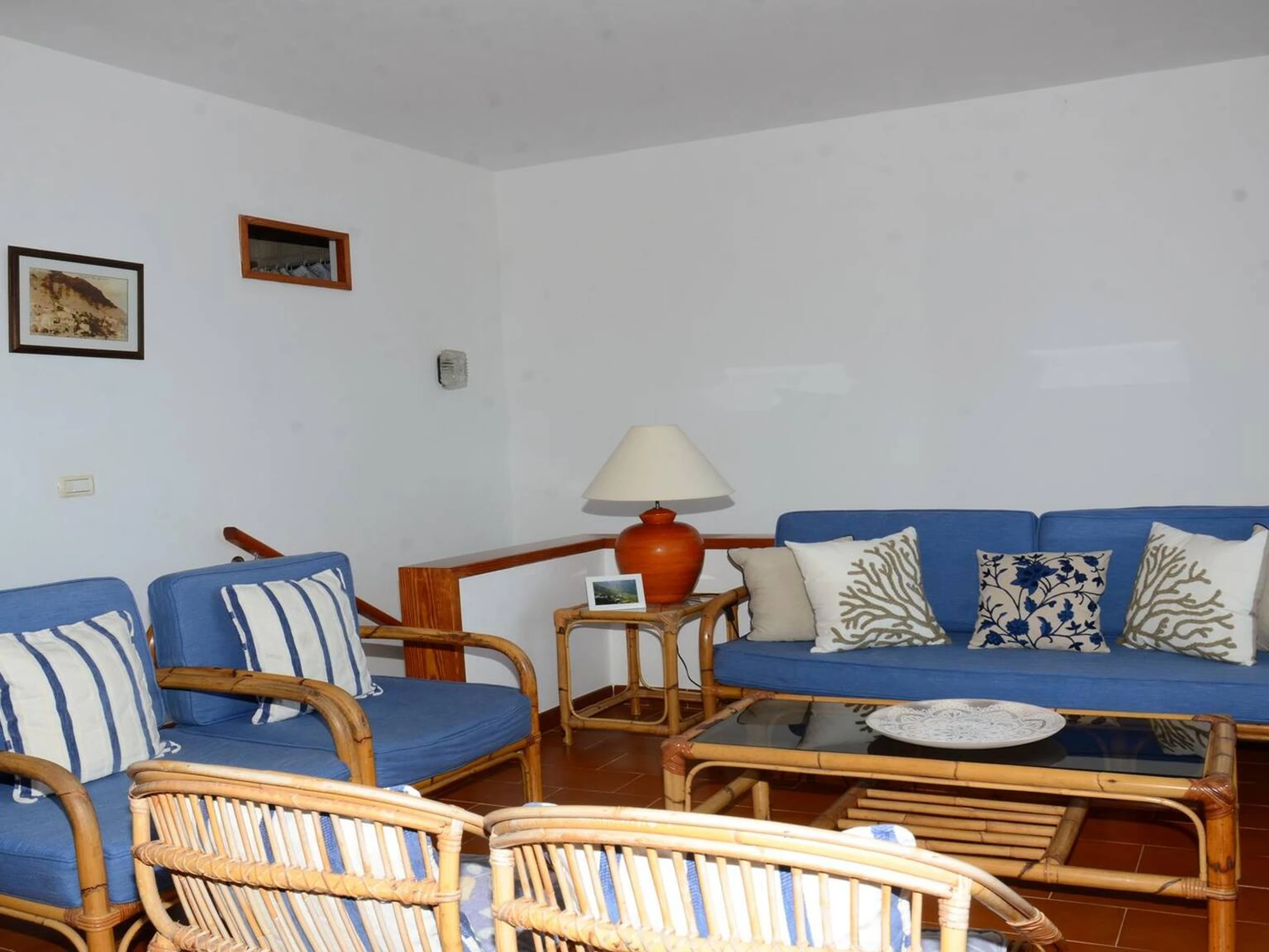 Es verfügt im ersten Stock über zwei Schlafzimmer (eines mit zwei Einzelbetten, das andere mit drei Einzelbetten), Bad, eine gut ausgestattete amerikanische Küche und Wohnbereich mit Esstisch und Zugang zur Terrasse, die einen direkten Meerblick bietet. Vom hinteren Flur aus führt eine Treppe hinunter in den geschützten Innenhof, der mit Liegen und einer Aussendusche ausgestattet ist.