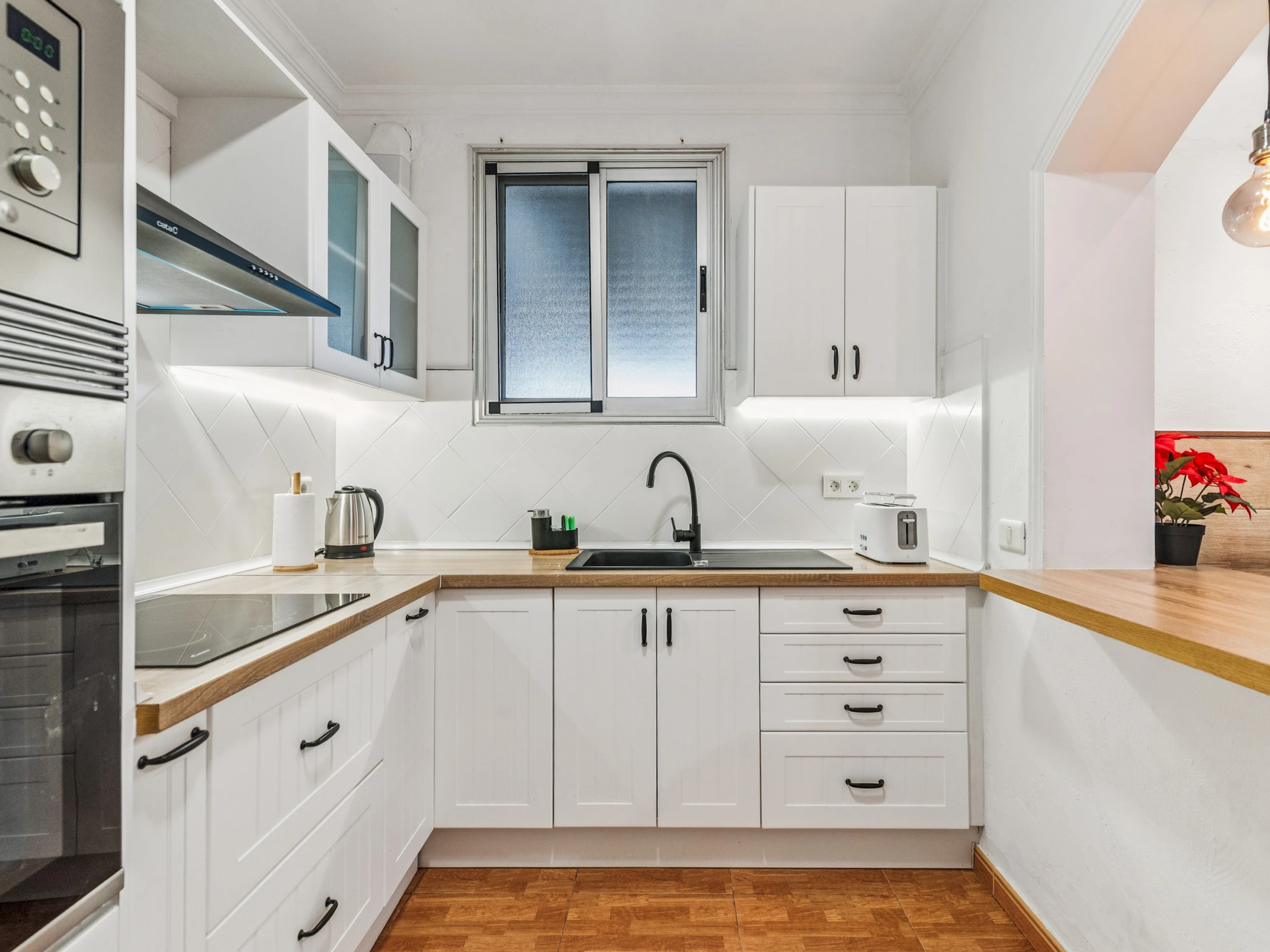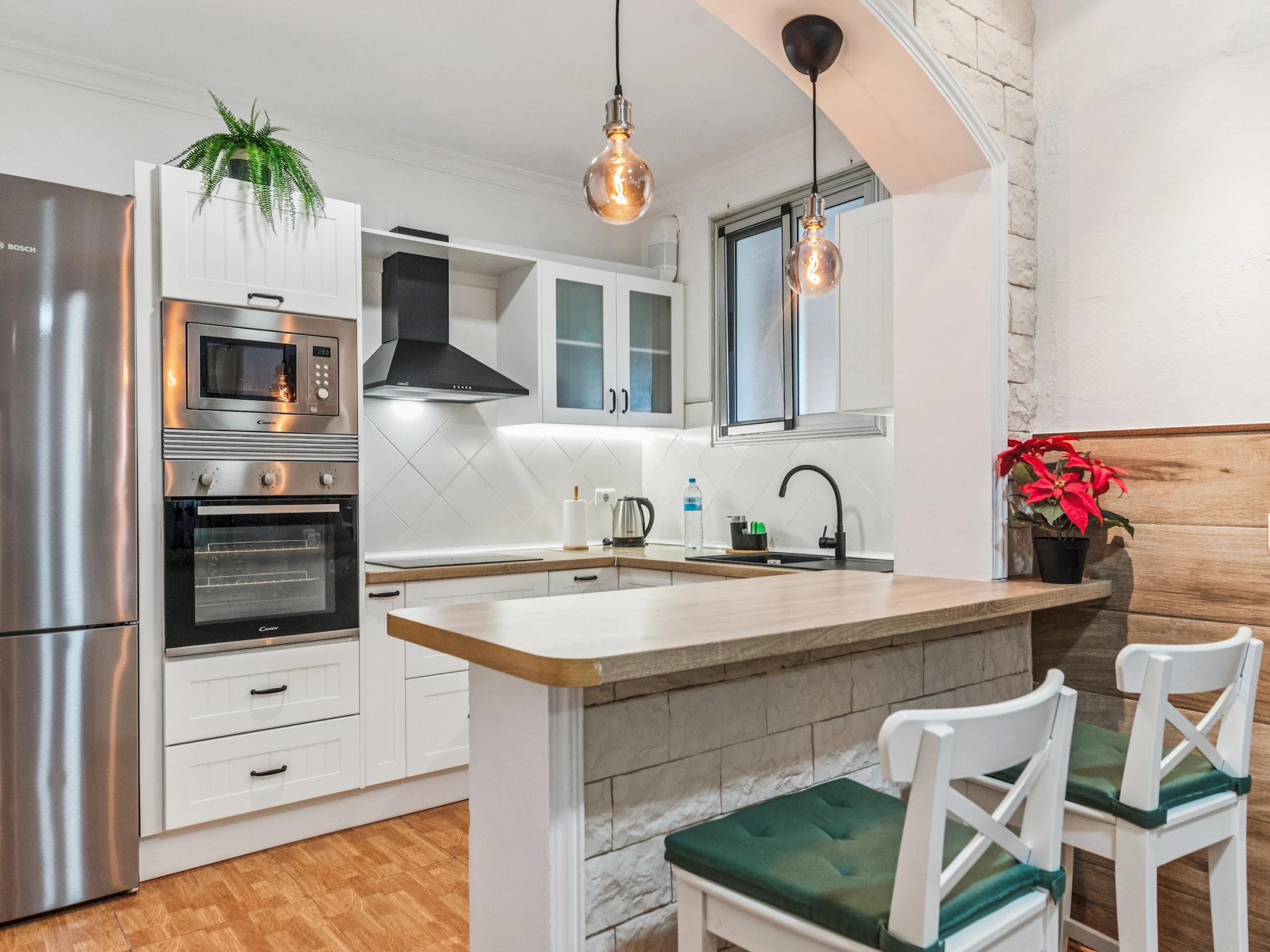 Dieses küche, ist ausgestattet in mikrowelle, backofen, kochutensilien, kaffeemaschine und toaster.
