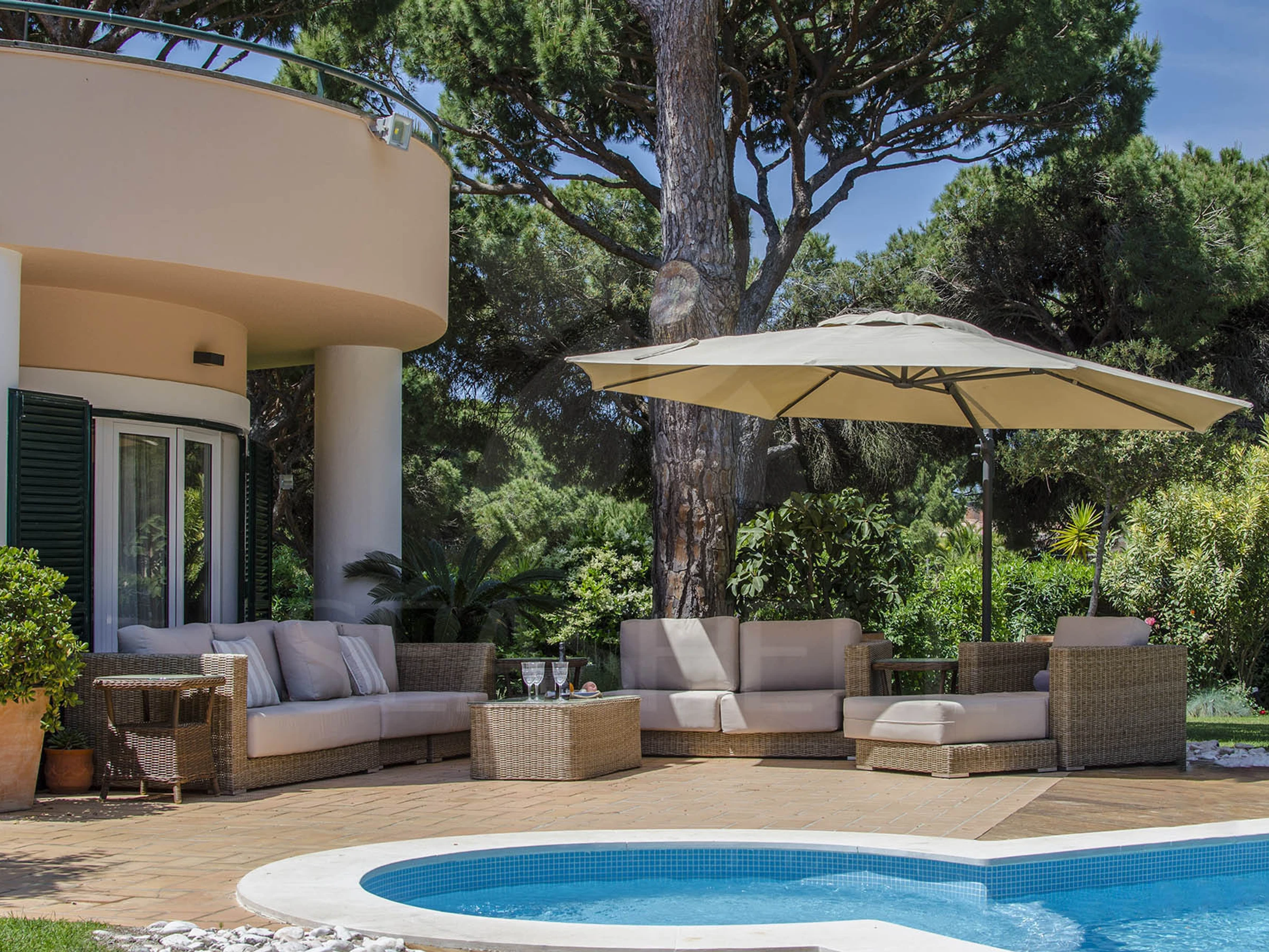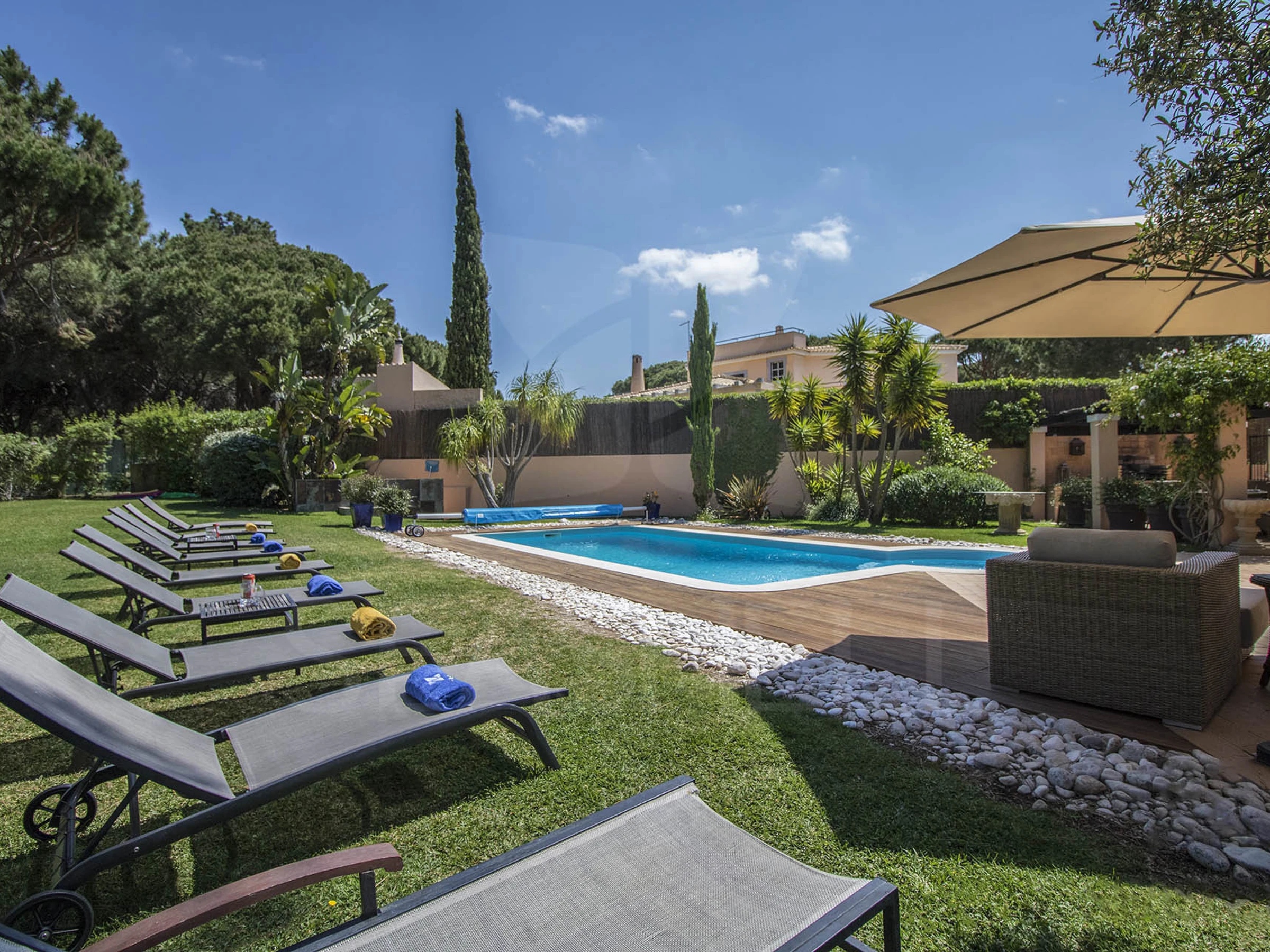Die Unterkunft verfügt über garten, gartenmöbel, umzäuntes grundstück, waschmaschine, grill, bügeleisen/-brett, safe, internet (WLAN), haartrockner, klimaanlage, swimming-pool privater pool, überdachter parkplatz in auf dem grundstück, 1 Fernseher.