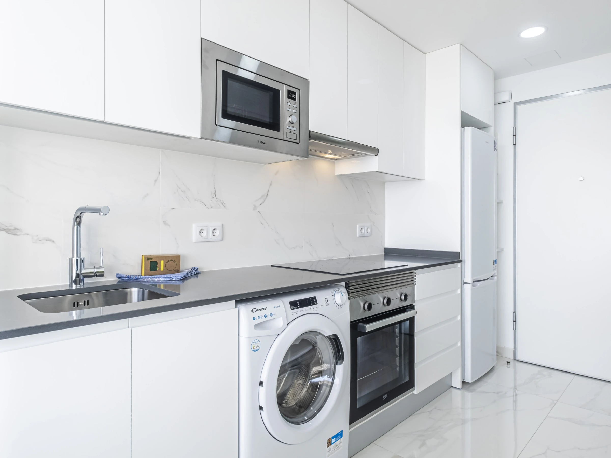 Dieses offene küche, mit induktions-kochfeld, ist ausgestattet in kühlschrank, mikrowelle, backofen, gefrierschrank, geschirr/besteck, kochutensilien, kaffeemaschine, toaster, wasserkocher und saftpresse.