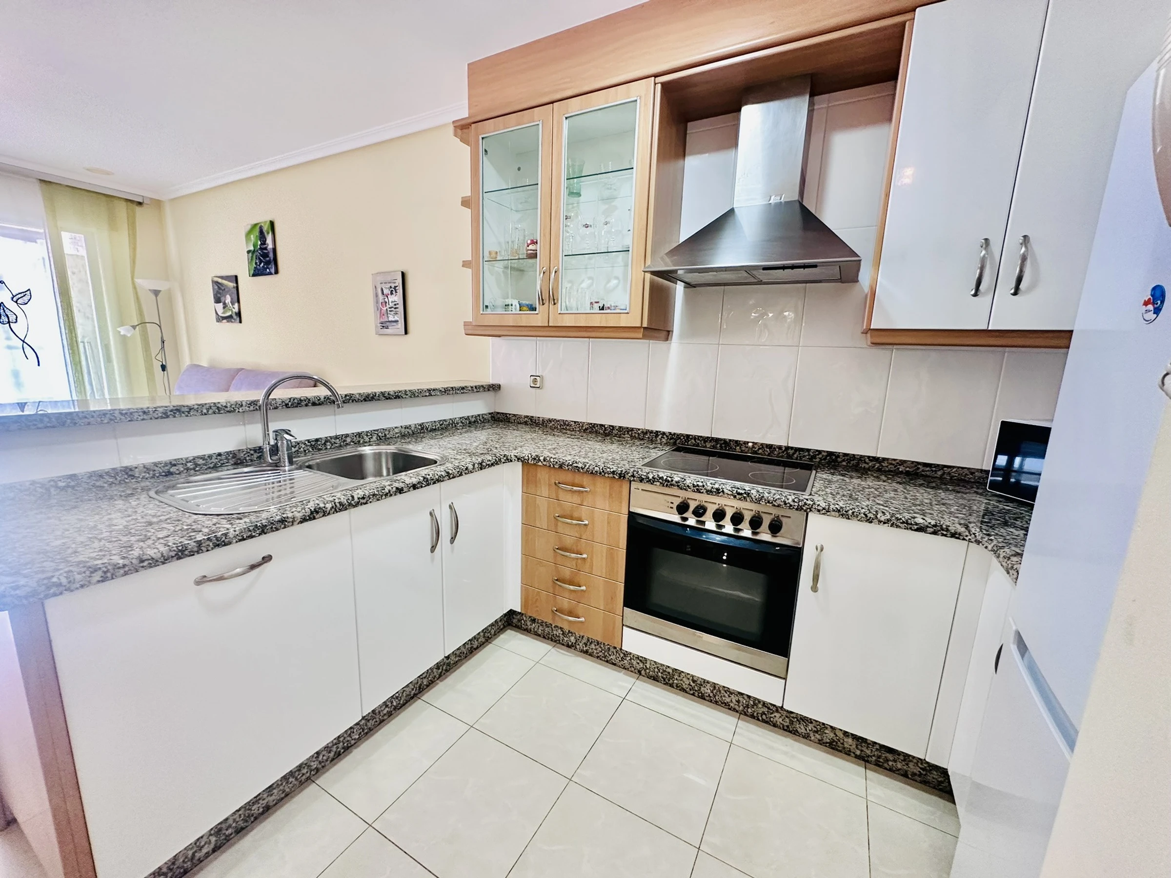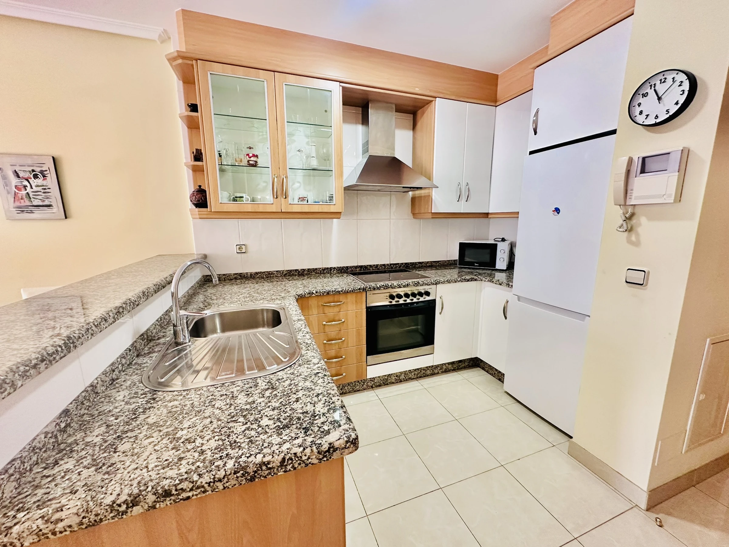 Dieses offene küche, mit ceranfeld, ist ausgestattet in kühlschrank, mikrowelle, backofen, gefrierschrank, geschirr/besteck, kochutensilien, kaffeemaschine, toaster, wasserkocher und saftpresse.