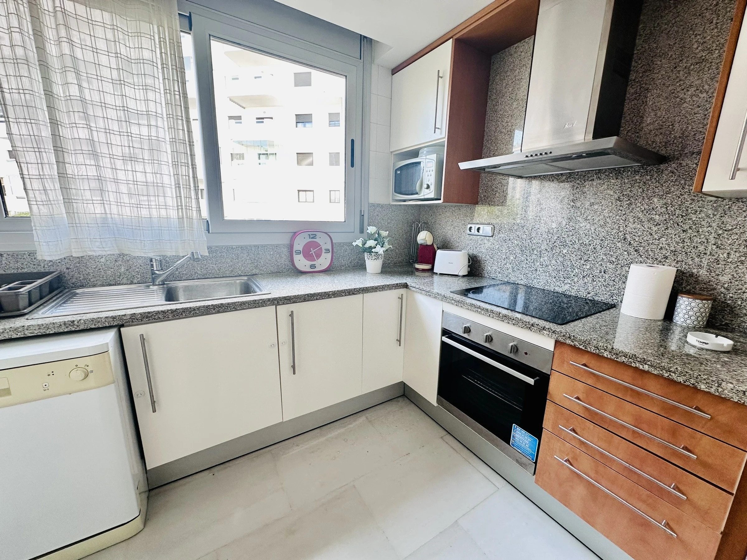 Dieses separate küche, mit ceranfeld, ist ausgestattet in kühlschrank, mikrowelle, backofen, gefrierschrank, spülmaschine, geschirr/besteck, kochutensilien, kaffeemaschine, toaster, wasserkocher und saftpresse.