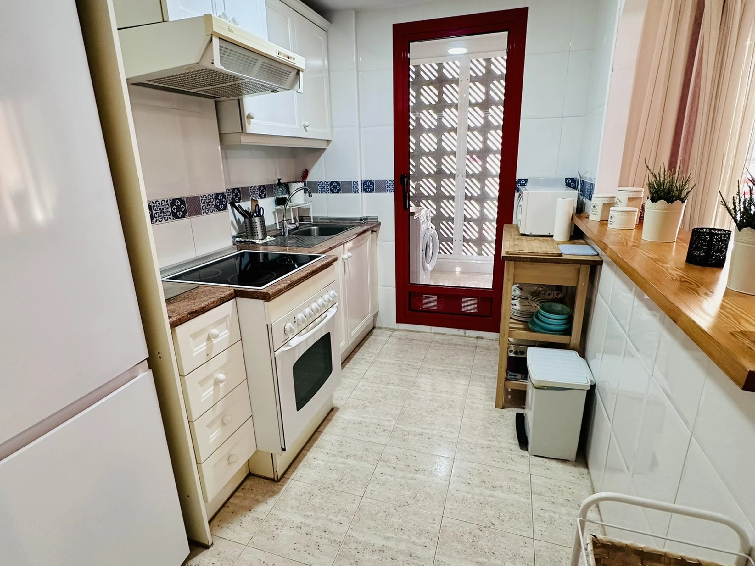 Dieses küche, mit ceranfeld, ist ausgestattet in kühlschrank, mikrowelle, backofen, gefrierschrank, geschirr/besteck, kochutensilien, kaffeemaschine, toaster, wasserkocher und saftpresse.