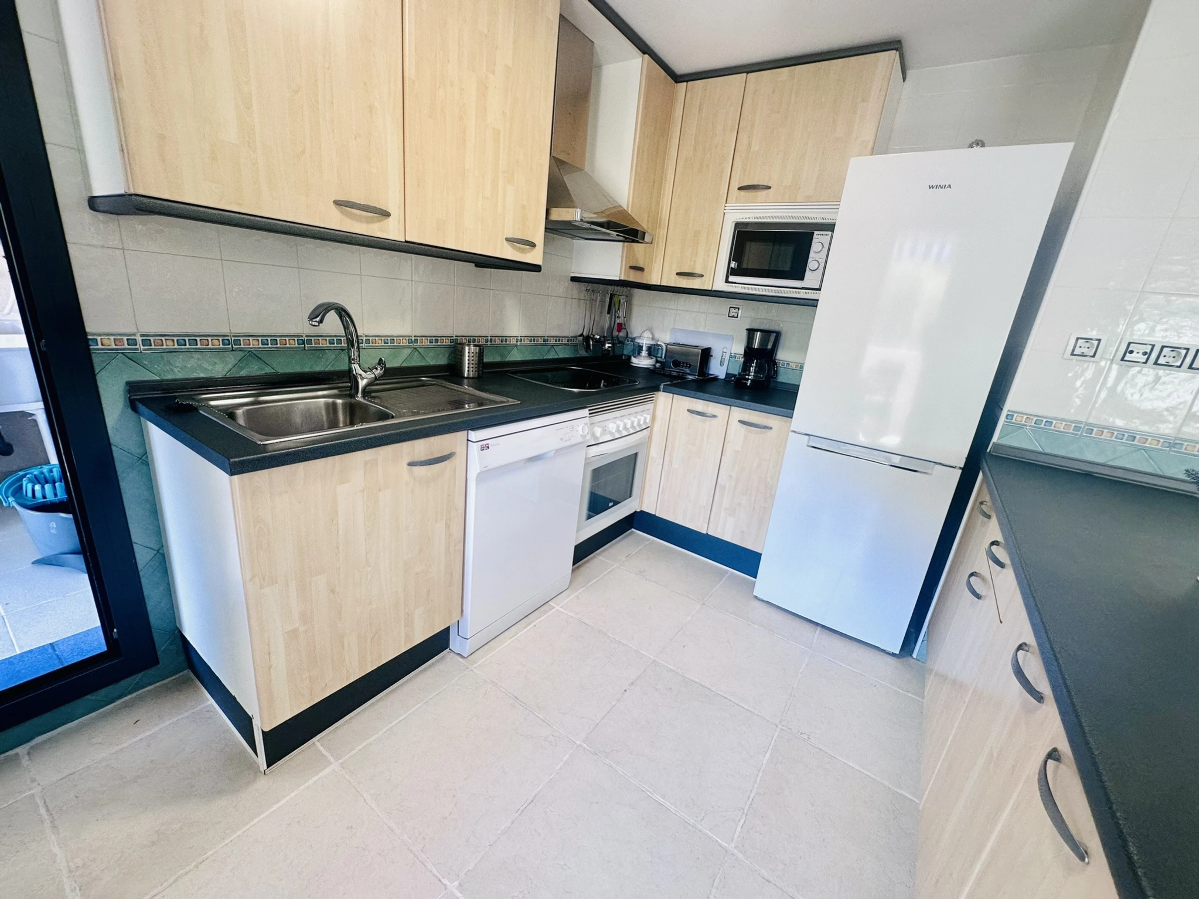 Dieses offene küche, mit ceranfeld, ist ausgestattet in kühlschrank, mikrowelle, backofen, gefrierschrank, spülmaschine, geschirr/besteck, kochutensilien, kaffeemaschine, toaster, wasserkocher und saftpresse.
