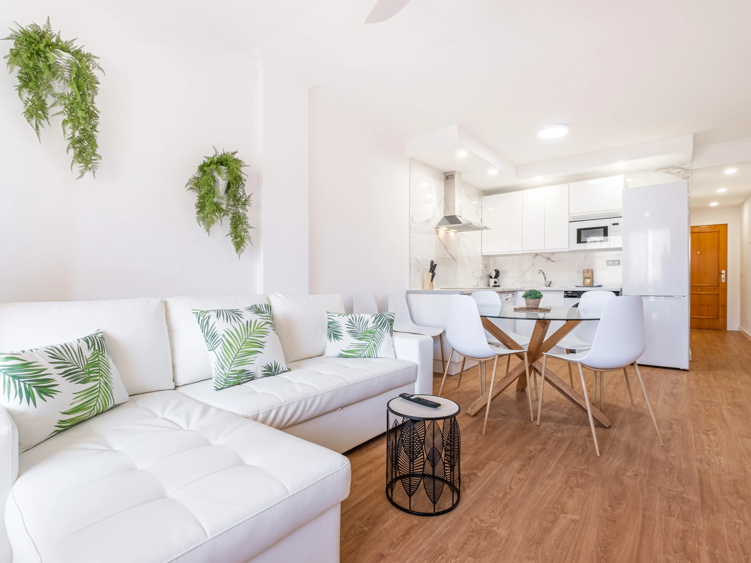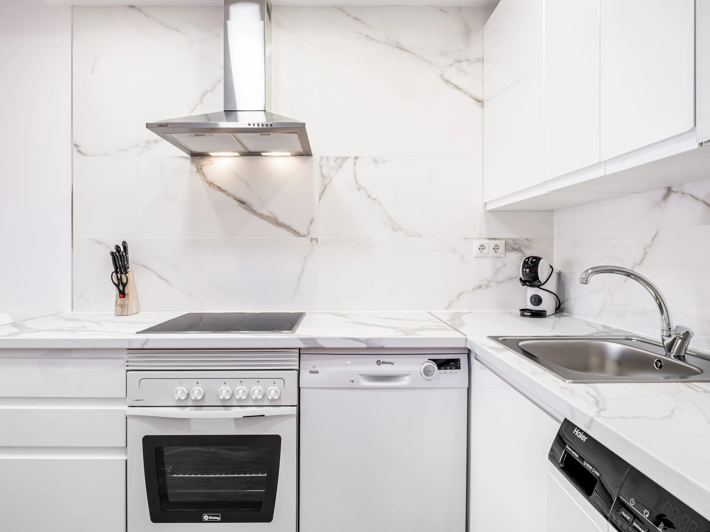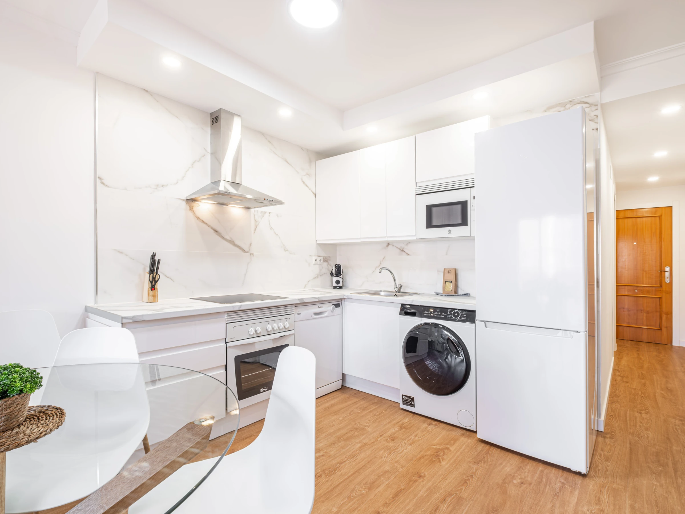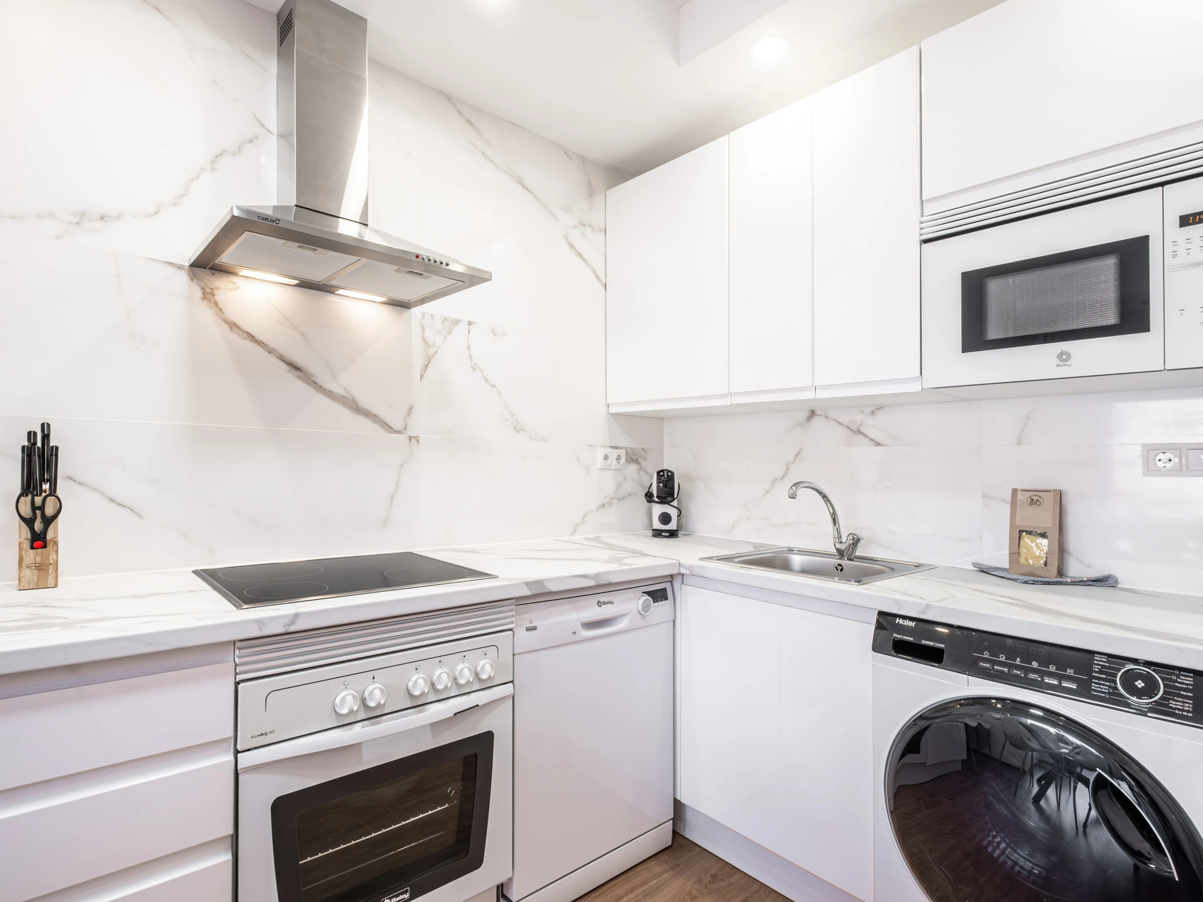Dieses offene küche, mit ceranfeld, ist ausgestattet in kühlschrank, mikrowelle, backofen, gefrierschrank, spülmaschine, geschirr/besteck, kochutensilien, kaffeemaschine, toaster, wasserkocher und saftpresse.