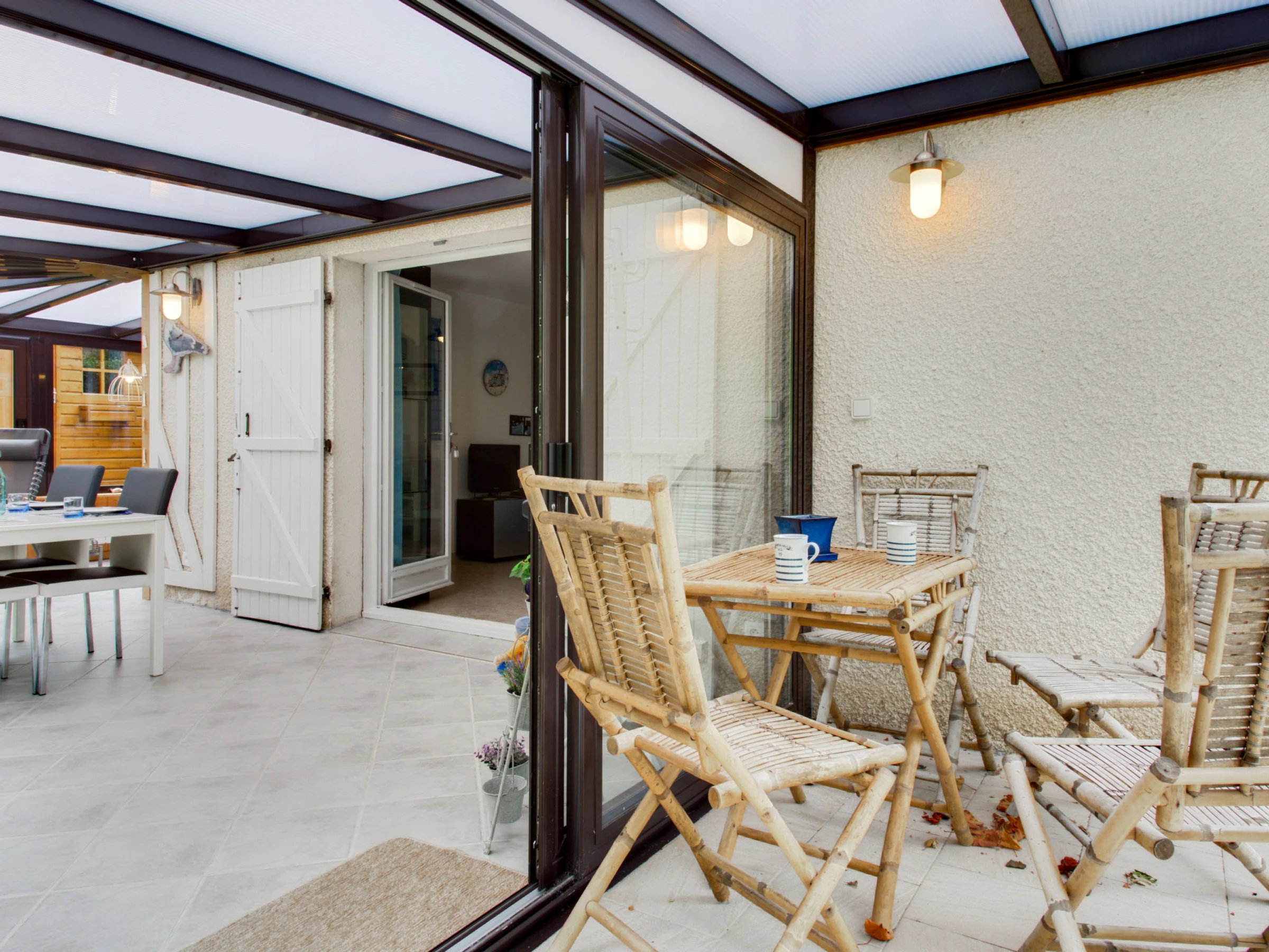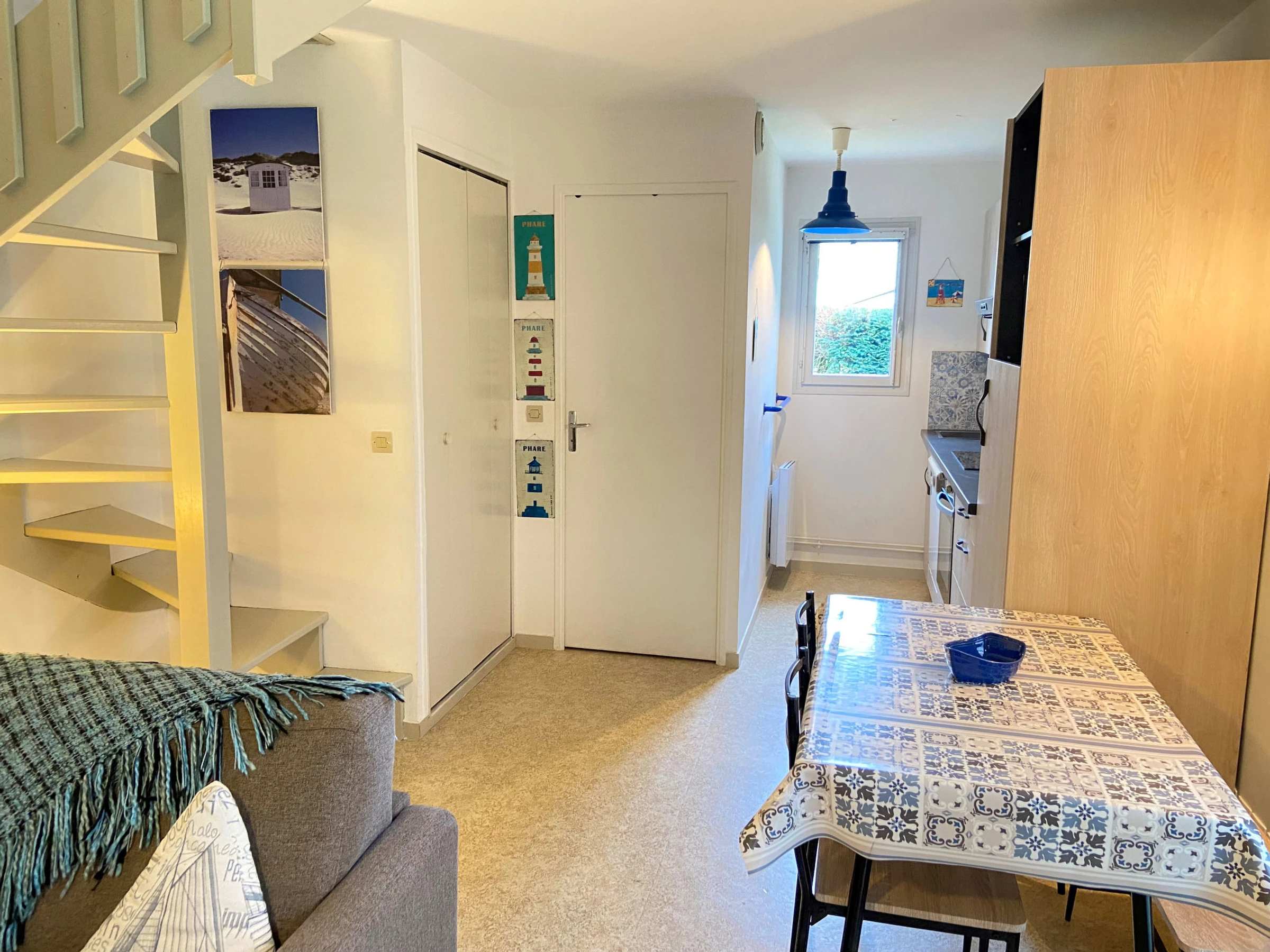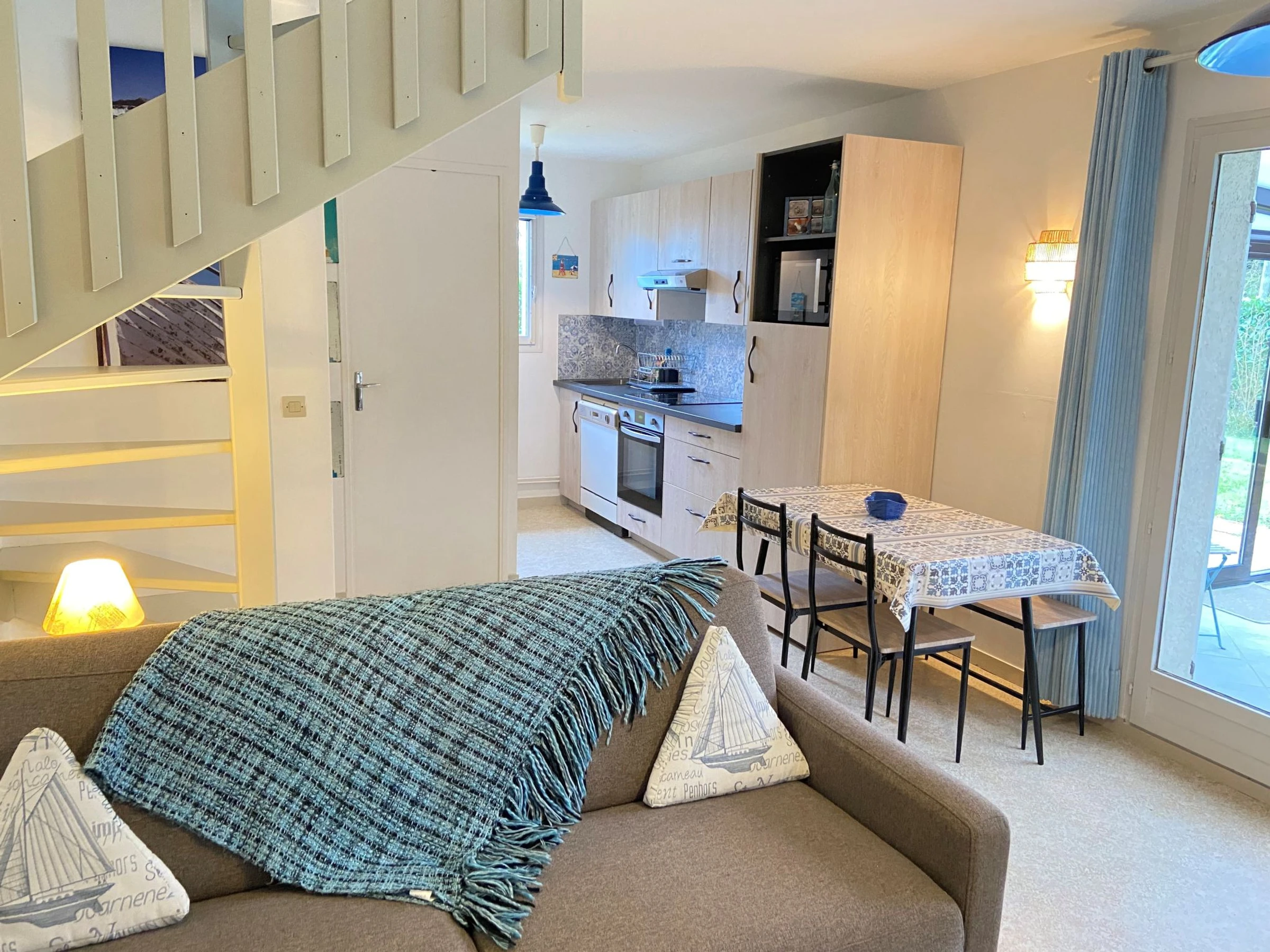 3-Zimmer-Reihenhaus 77 m2 auf 2 Stockwerken, Nordostlage. Wohn-/Esszimmer mit DVD. Ausgang zur Veranda. Offene Küche (Backofen, Geschirrspüler, 3 Glaskeramikplatten, Toaster, Wasserkocher, Mikrowelle, elektrische Kaffeemaschine). Dusche/WC. E-Heizung. Obergeschoss: 1 Zimmer mit 1 franz. Bett (160 cm, Länge 200 cm). 1 Zimmer mit 1 x 2 Etagenbetten (90 cm, Länge 190 cm). Garten 300 m2. Terrassenmöbel, Liegestühle (2). Zur Verfügung: Bügeleisen, Kinderhochstuhl. Internet (WLAN, extra). Parkplatz Nr. 117. Bitte beachten: Rauchmelder. [hidden]