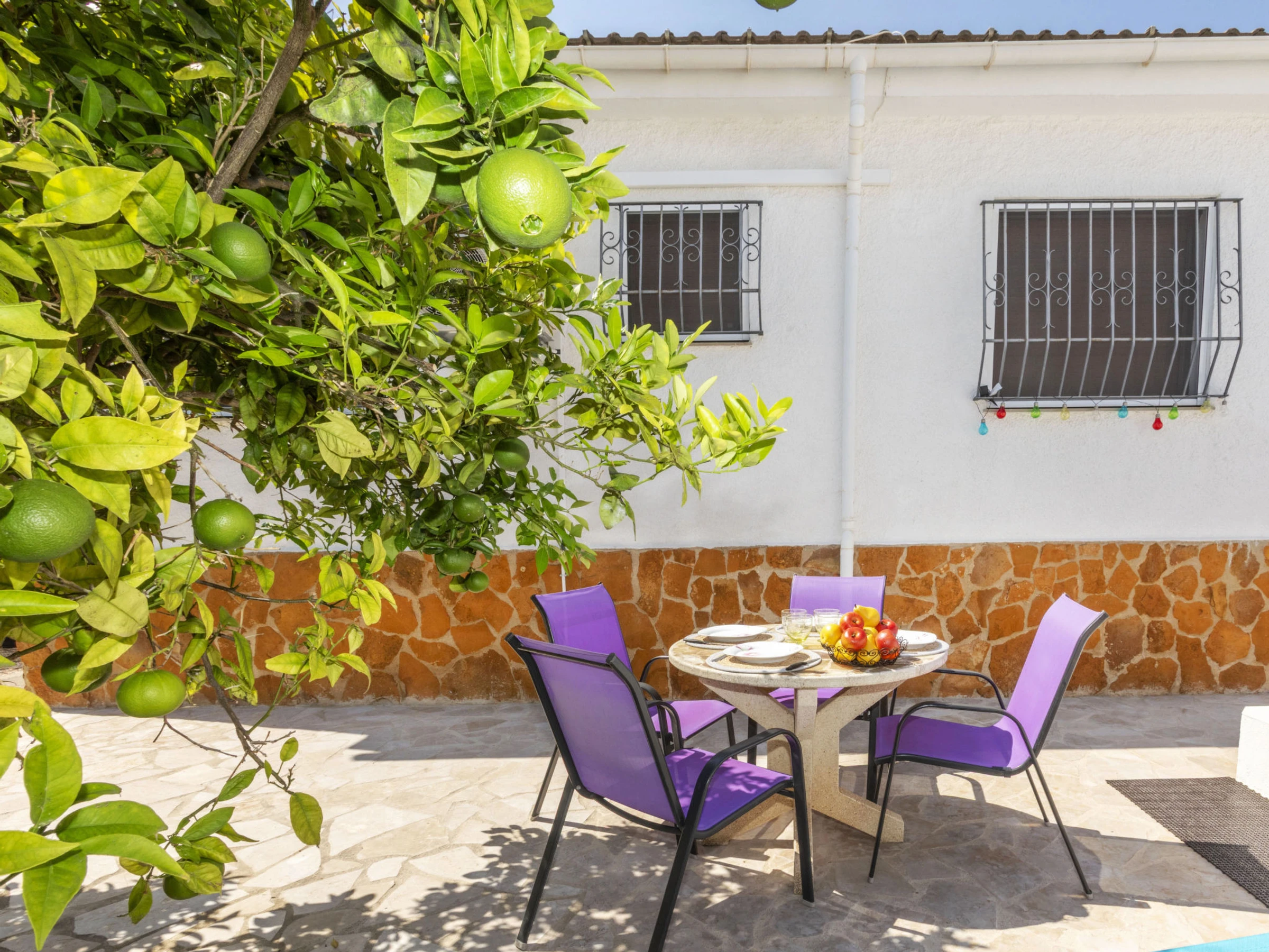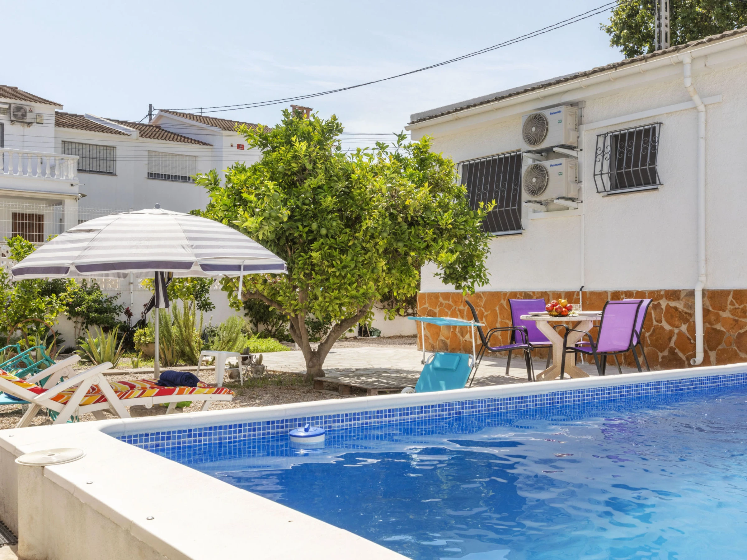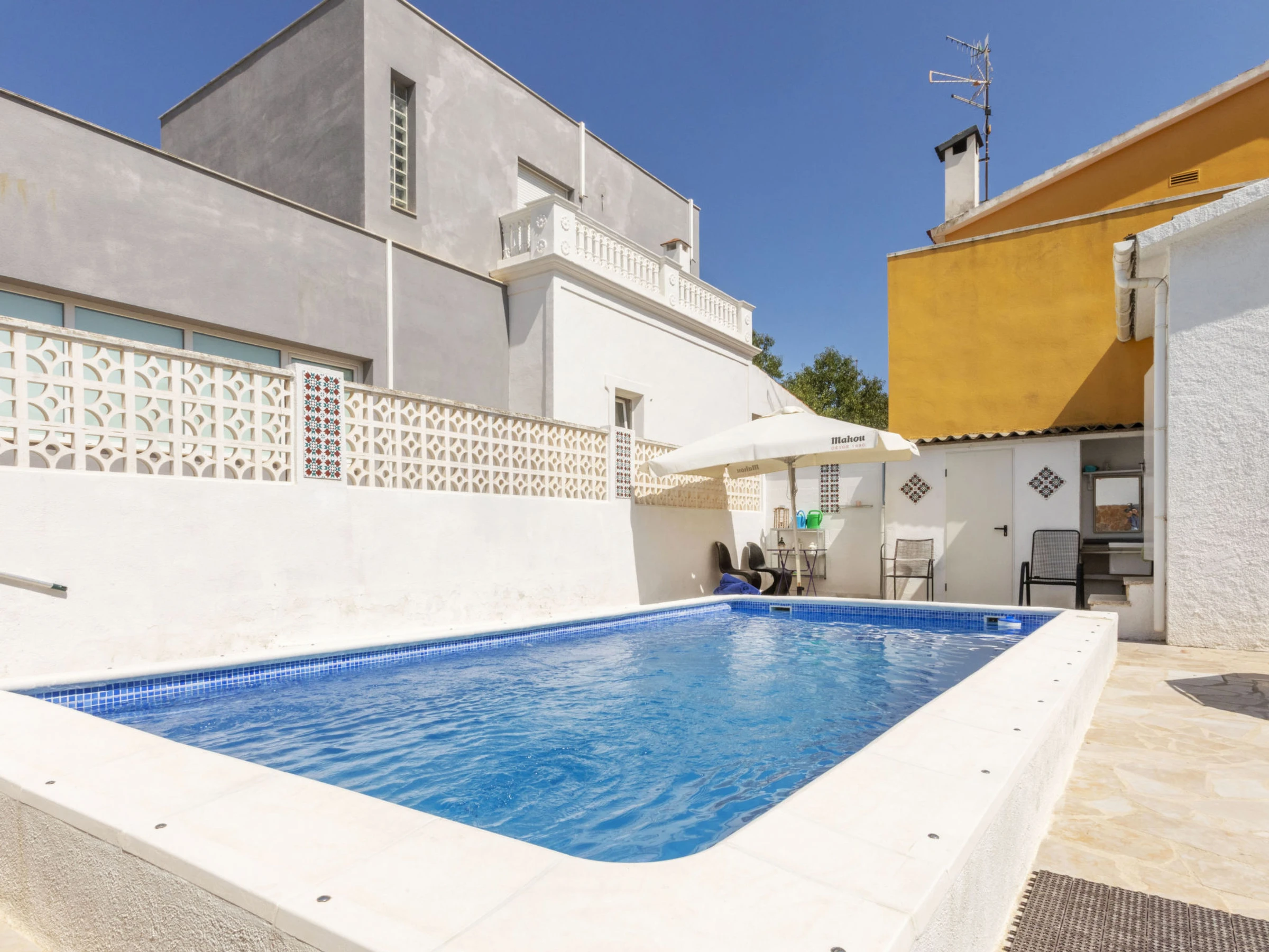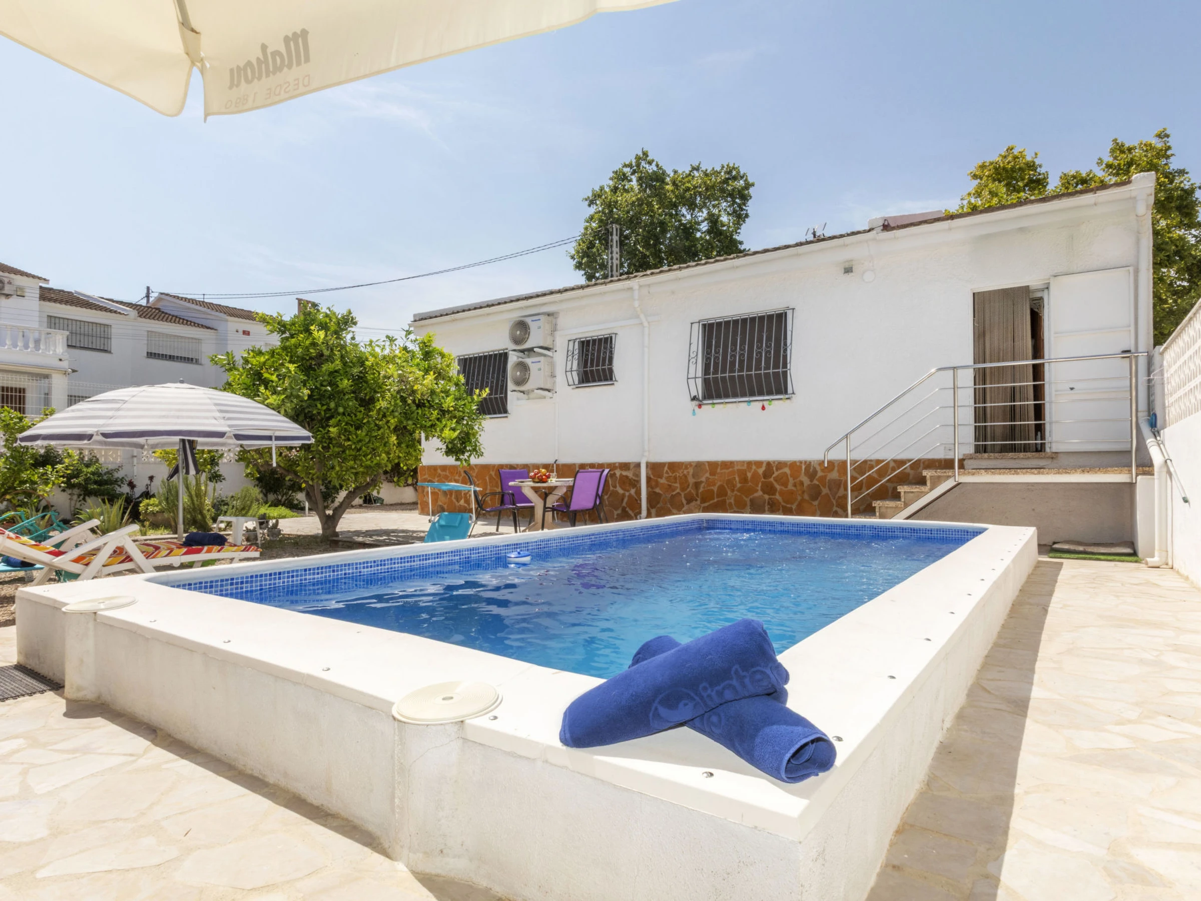 "Matilde", 4-Zimmer-Haus 90 m2. Komfortabel und gemütlich eingerichtet: Wohn-/Esszimmer mit Digital-TV und Klimaanlage. 1 Zimmer mit 1 Doppelbett (2 x 70 cm, Länge 190 cm), Klimaanlage und Ventilator. 1 Kinderzimmer mit 1 Wandklappbett (70 cm, Länge 190 cm), TV. 1 Zimmer mit 1 franz. Bett (1 x 150 cm, Länge 190 cm), Klimaanlage und Ventilator. Offene Küche (Backofen, Geschirrspüler, 3 Glaskeramikplatten, Toaster, Wasserkocher, Mikrowelle, elektrische Kaffeemaschine) mit Esstisch. Dusche/Bidet/WC. Garten. Terrassenmöbel, Liegestühle (4), Sitzplatz. Sicht auf das Schwimmbad und den Garten. Zur Verfügung: Waschmaschine, Bügeleisen, Fliegengitter, Kinderhochstuhl, Babybett, Haartrockner. Internet (WLAN, gratis). Parkplatz (eingezäunt, 2 Autos). Bitte beachten: Nichtraucher-Haus. Maximal 1 kleines Haustier/Hund erlaubt. TV nur ES, FR. Kein Fahrstuhl. Der ausgeschriebene Pool ist zur alleinigen Nutzung. [hidden]