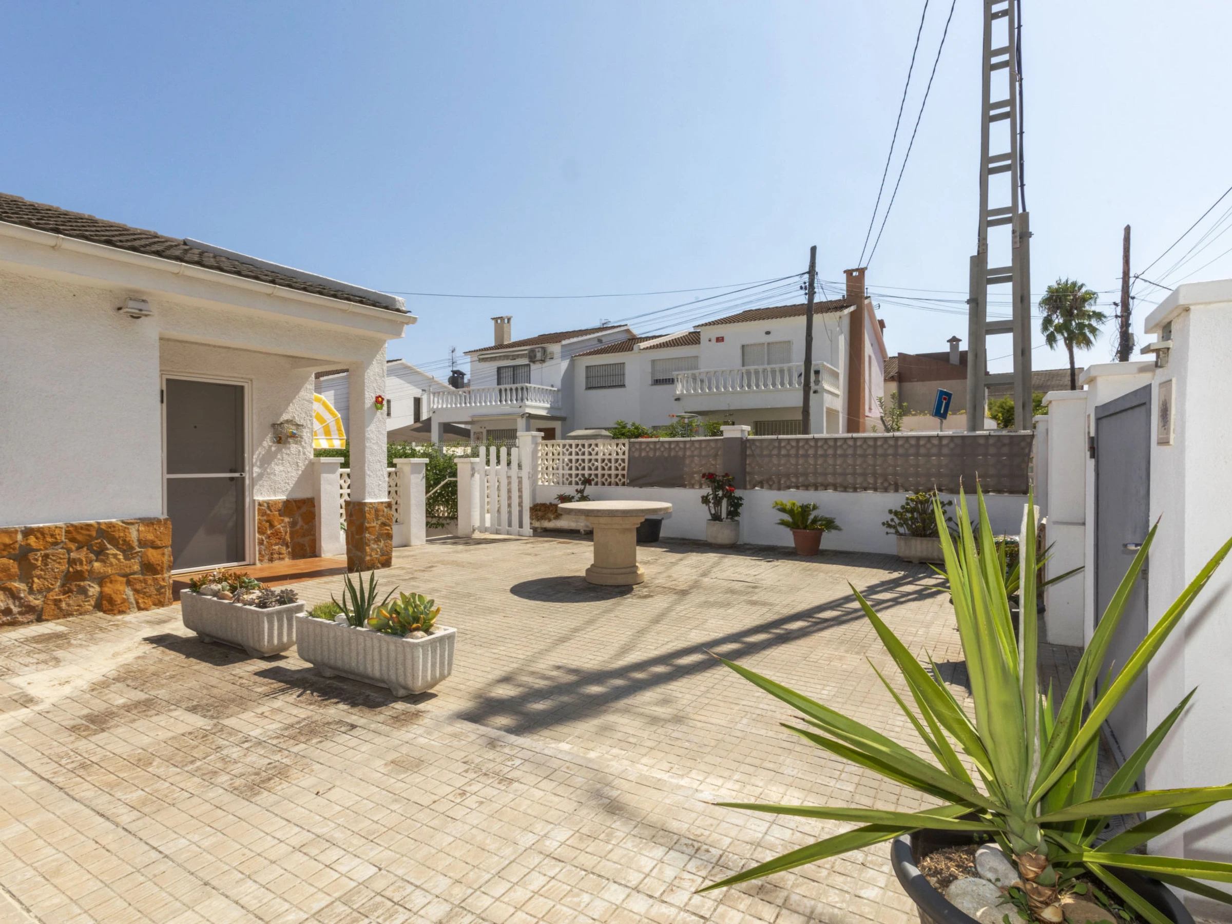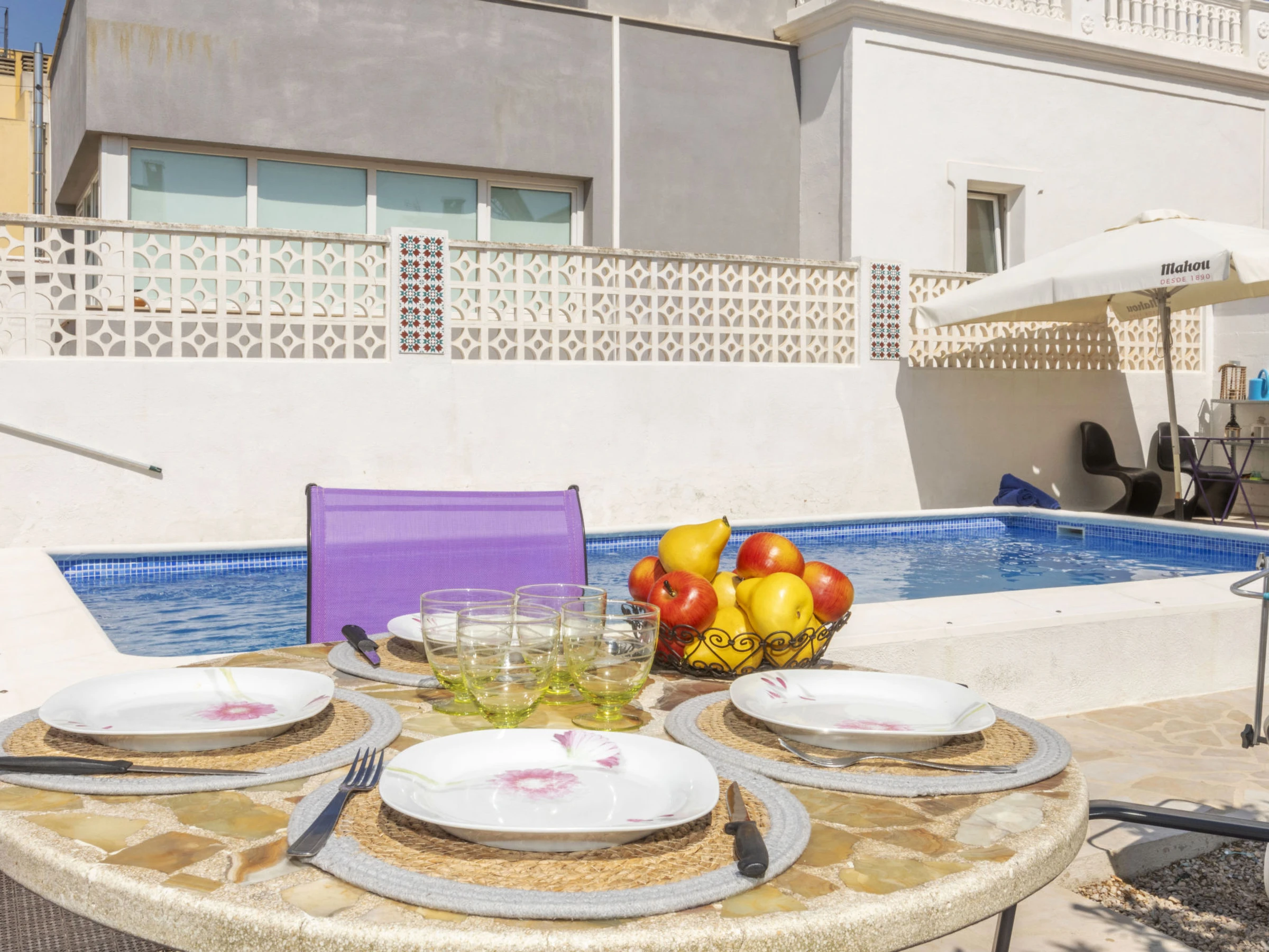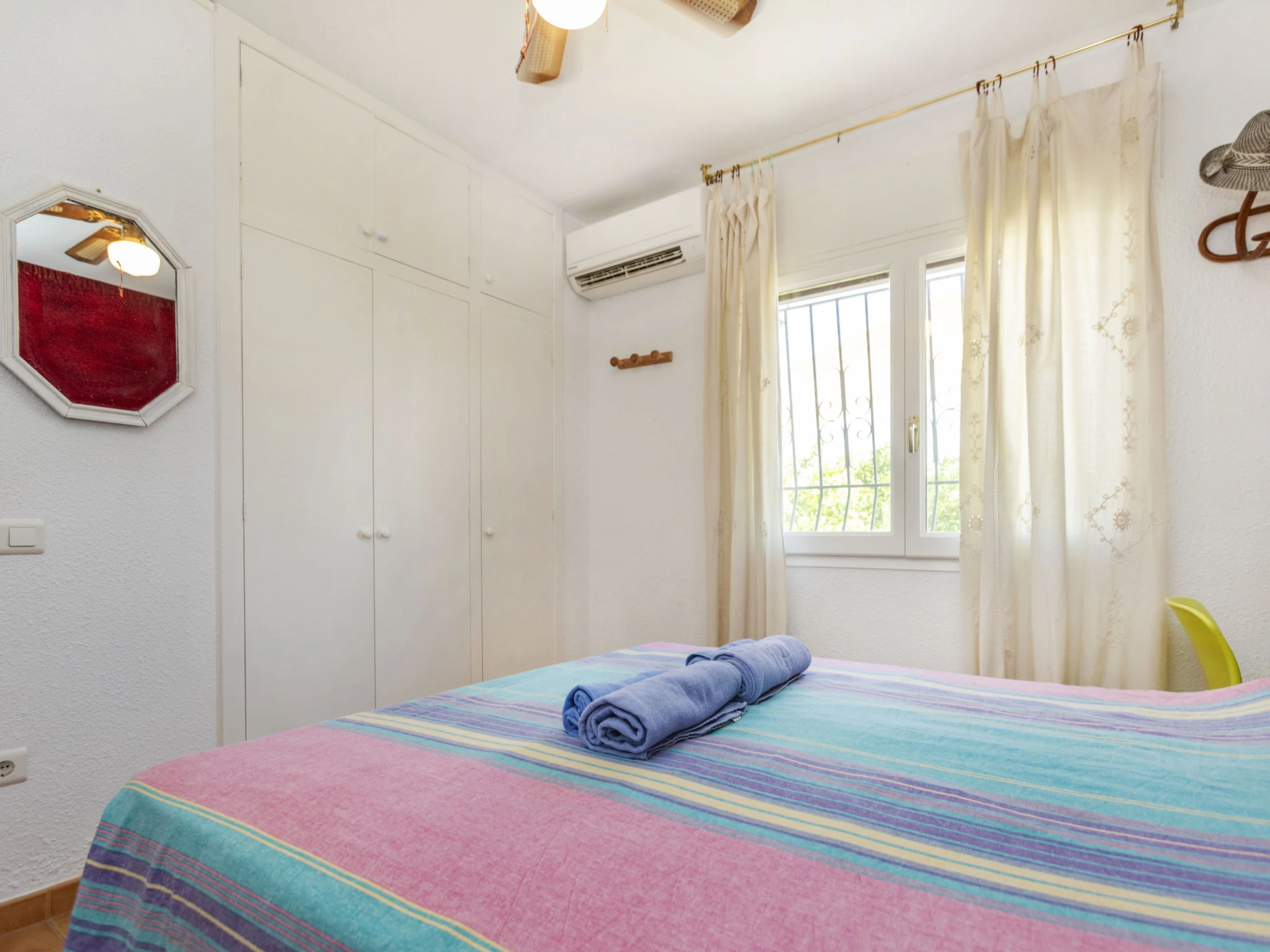 "Matilde", 4-Zimmer-Haus 90 m2. Komfortabel und gemütlich eingerichtet: Wohn-/Esszimmer mit Digital-TV und Klimaanlage. 1 Zimmer mit 1 Doppelbett (2 x 70 cm, Länge 190 cm), Klimaanlage und Ventilator. 1 Kinderzimmer mit 1 Wandklappbett (70 cm, Länge 190 cm), TV. 1 Zimmer mit 1 franz. Bett (1 x 150 cm, Länge 190 cm), Klimaanlage und Ventilator. Offene Küche (Backofen, Geschirrspüler, 3 Glaskeramikplatten, Toaster, Wasserkocher, Mikrowelle, elektrische Kaffeemaschine) mit Esstisch. Dusche/Bidet/WC. Garten. Terrassenmöbel, Liegestühle (4), Sitzplatz. Sicht auf das Schwimmbad und den Garten. Zur Verfügung: Waschmaschine, Bügeleisen, Fliegengitter, Kinderhochstuhl, Babybett, Haartrockner. Internet (WLAN, gratis). Parkplatz (eingezäunt, 2 Autos). Bitte beachten: Nichtraucher-Haus. Maximal 1 kleines Haustier/Hund erlaubt. TV nur ES, FR. Kein Fahrstuhl. Der ausgeschriebene Pool ist zur alleinigen Nutzung. [hidden]