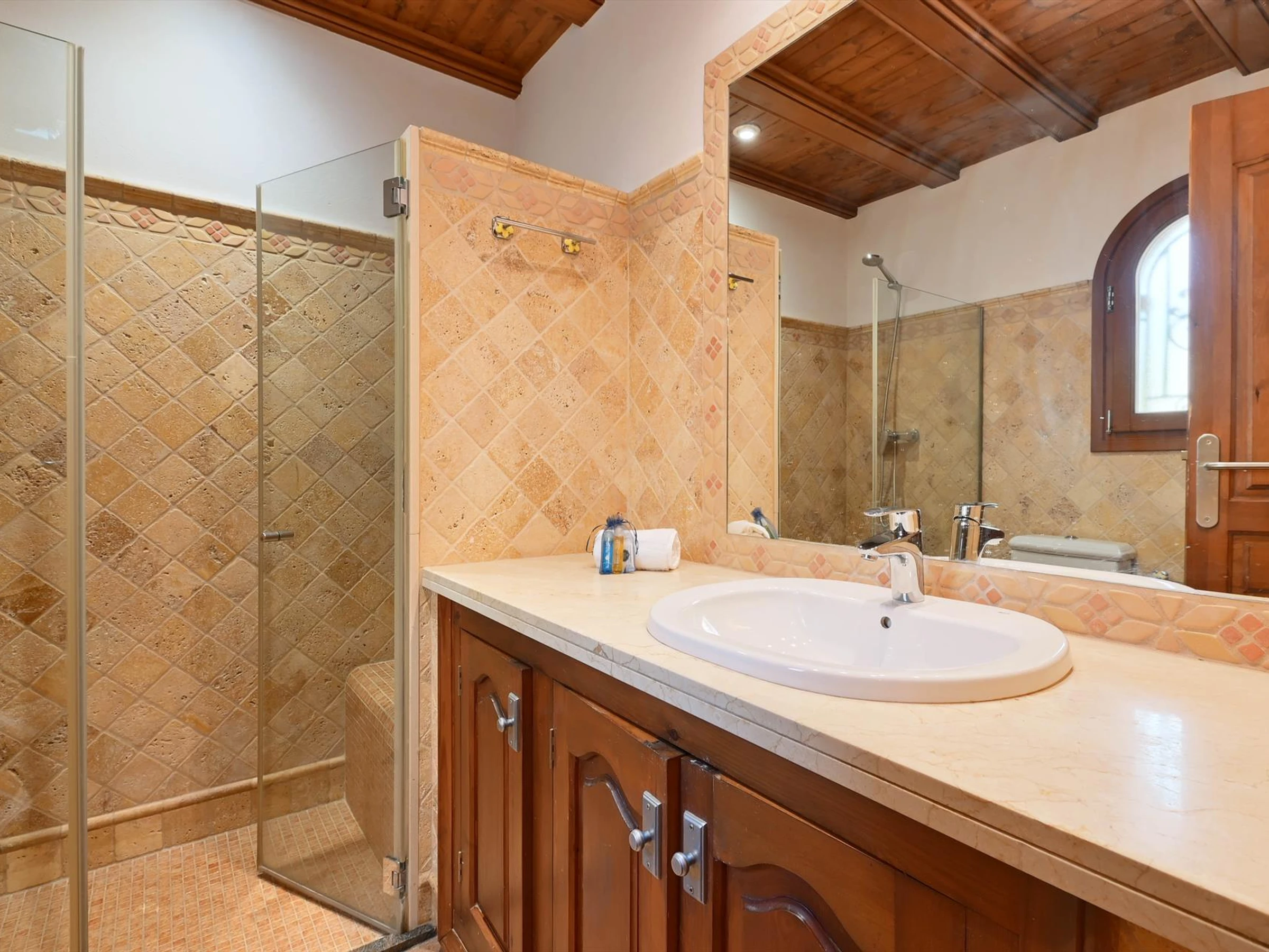 * Badezimmer mit Einzelwaschbecken, Dusche und ToiletteAussen