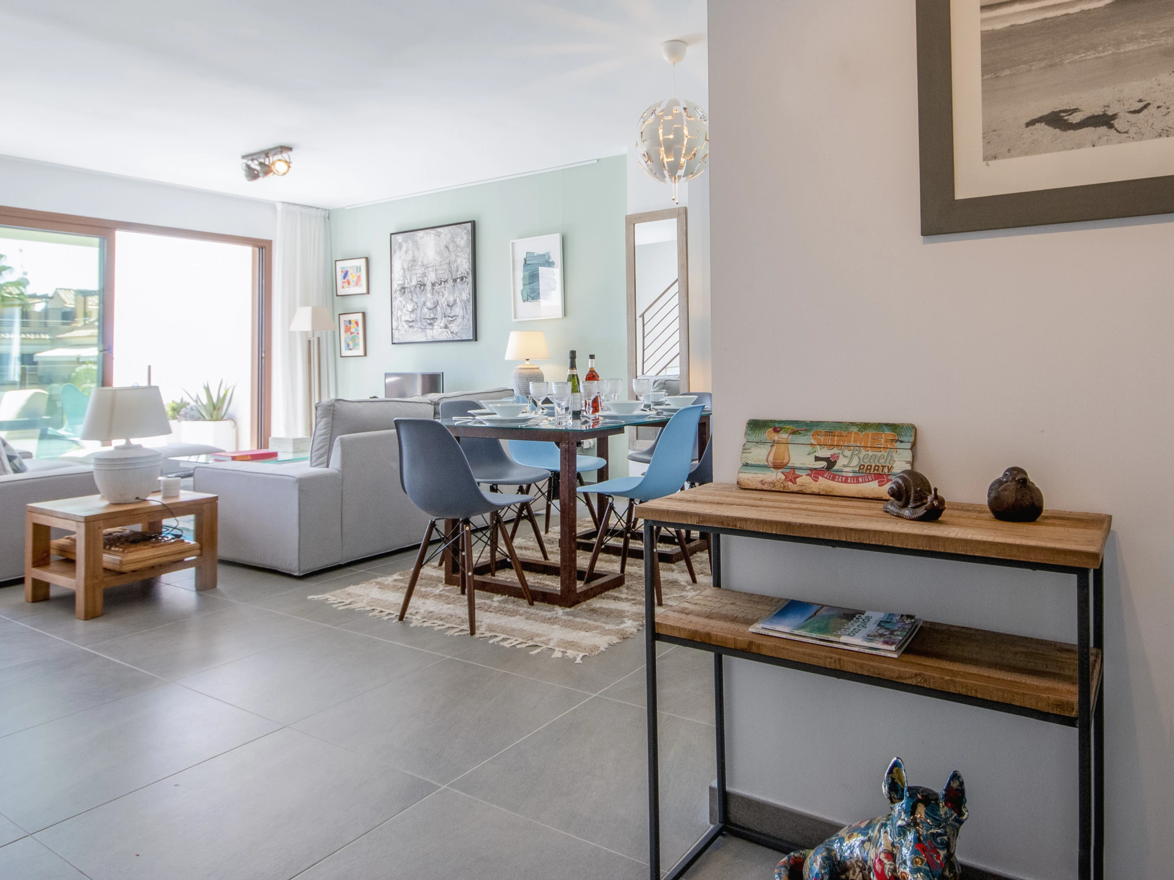 In der Wohnung ist die große Küche/Lounge/Esszimmer der perfekte Raum, um sich zum Frühstück, Kartenspielen oder Filmabend auf den gemütlichen Sofas zu treffen. Genießen Sie Kaffee oder Cocktails vor dem Abendessen auf der geräumigen überdachten Terrasse und atmen Sie die Meeresluft und die entspannte Atmosphäre der umliegenden Nachbarschaft ein.